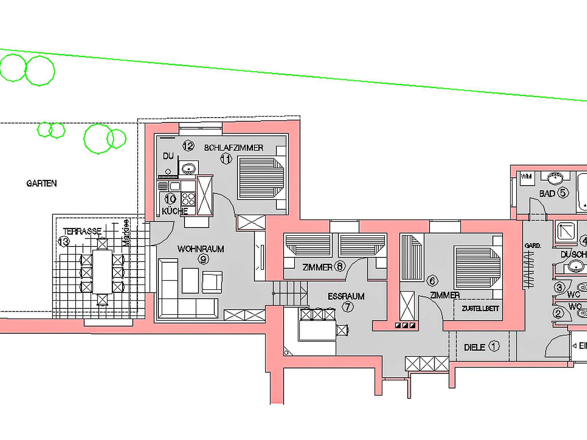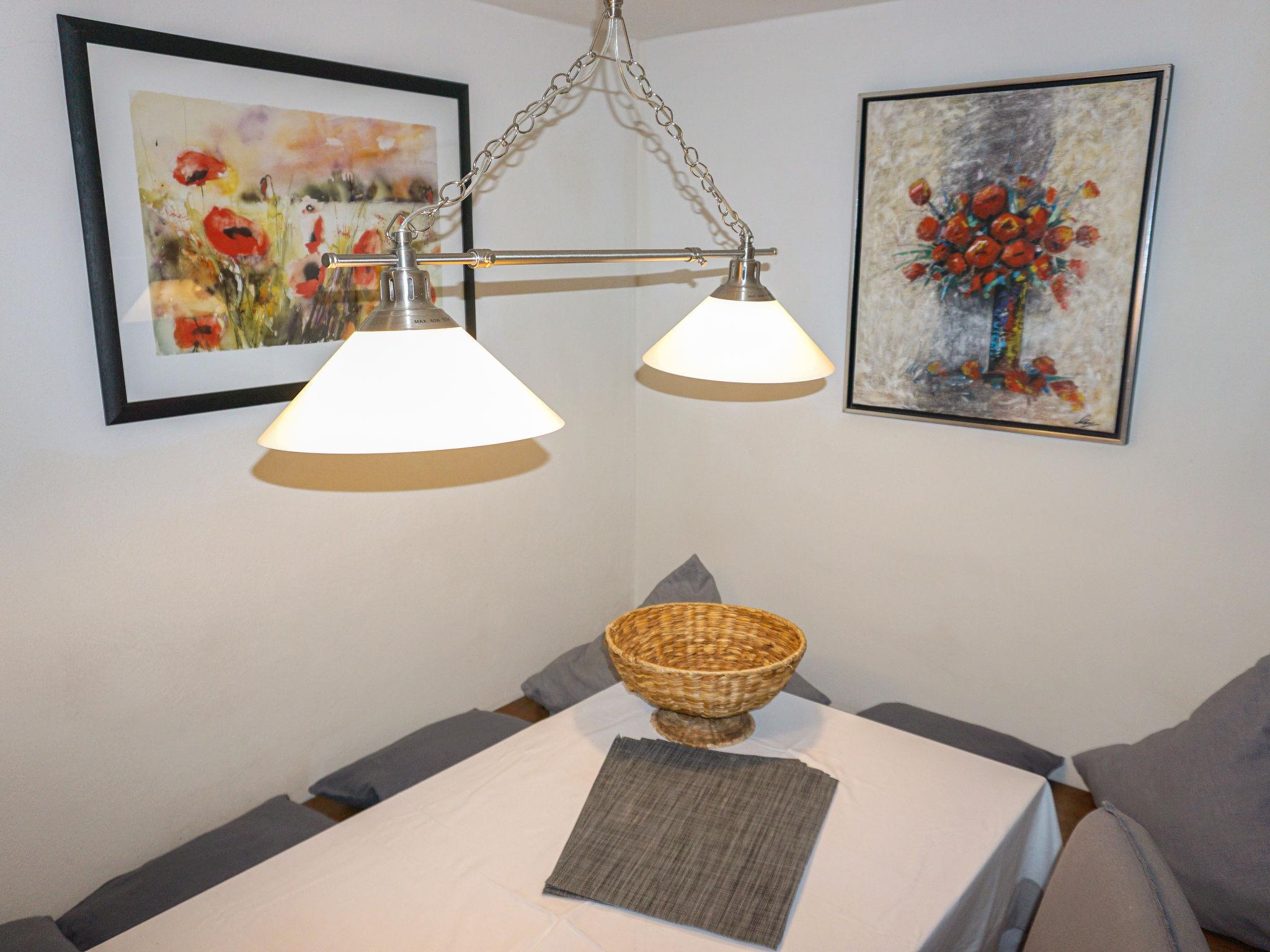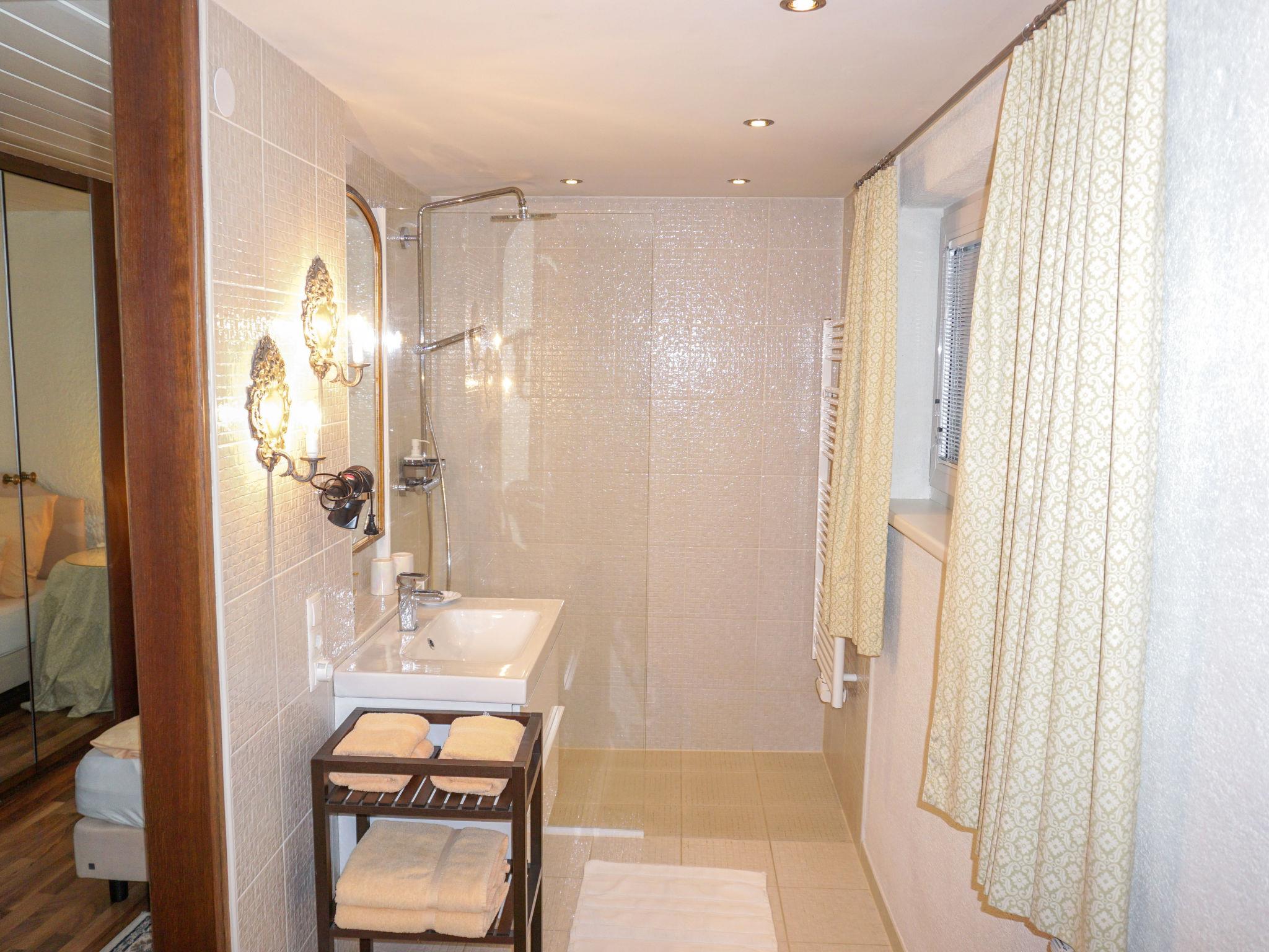 "Casa Hubertus", 4-room apartment 110 m2, on the ground floor. Comfortable furnishings: living room with satellite TV (flat screen), hi-fi system. Exit to the garden, to the terrace. Open dining room. 1 double bedroom with shower. 1 room with 1 bed and 1 double bed. 1 room with 2 beds. Small kitchenette (4 hot plates, dishwasher, toaster, kettle, microwave, electric coffee machine). Bathroom, shower, 2 sep. WC's. Terrace. Terrace furniture. Facilities: iron, hair dryer. Internet (WiFi, free). Please note: maximum 1 pet/ dog allowed. Private entrance. The living room and the dining room are connected through some small stairs.