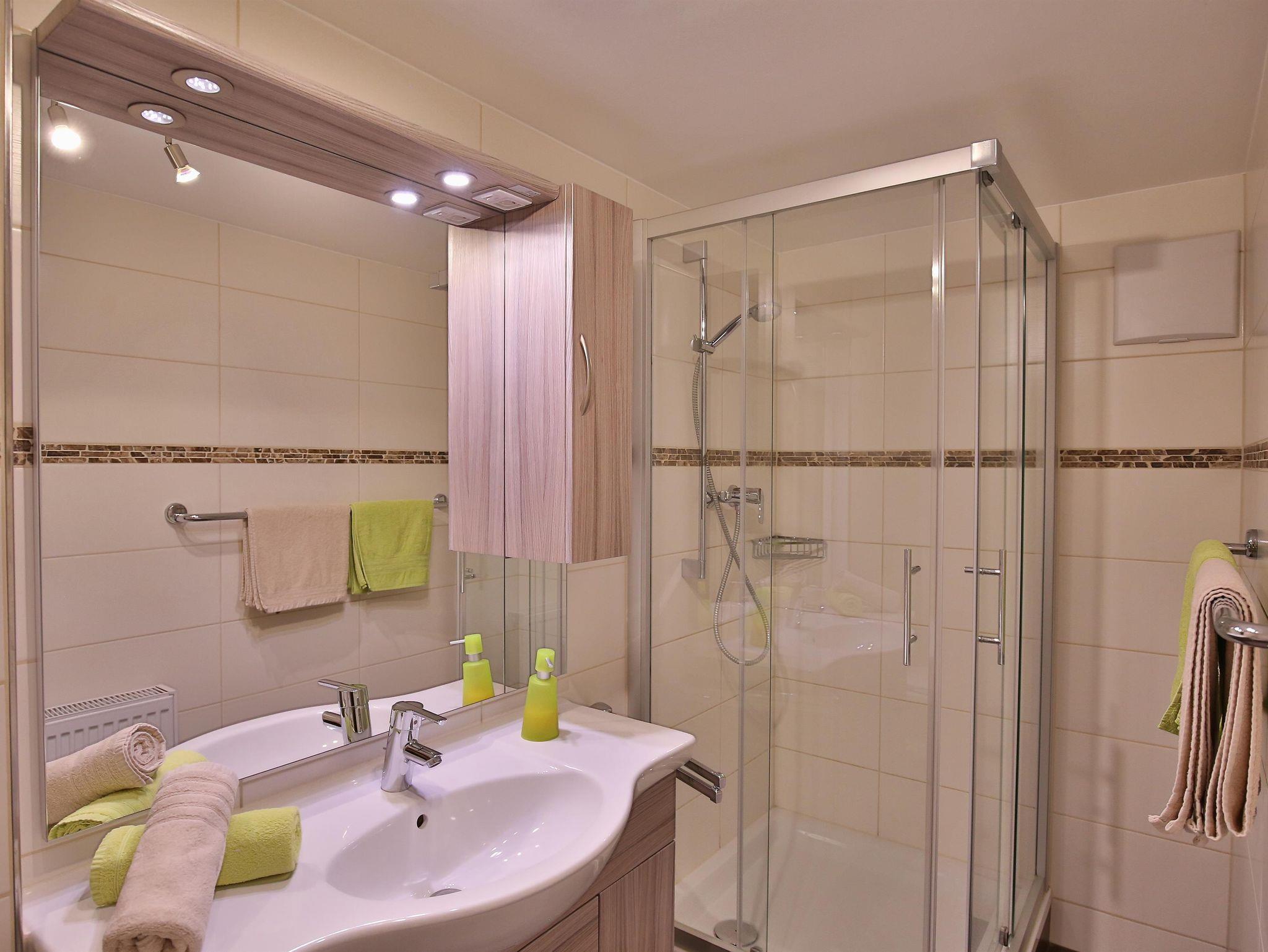 Das 55m² große Apartment „Gina“ (im Erdgeschoß) für 2-5 Personen teilt sich auf in, zwei separate Schlafzimmer (ein Zimmer mit Zusatzbett), ein Bad mit Dusche und WC, sowie ein Wohn-Esszimmer mit einer voll ausgestatteten Küche, Essgruppe, Flat-TV und einer gemütlichen Couch. Bettwäsche und Handtücher werden kostenlos zur Verfügung gestellt.