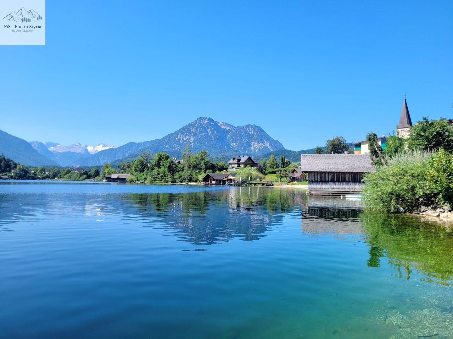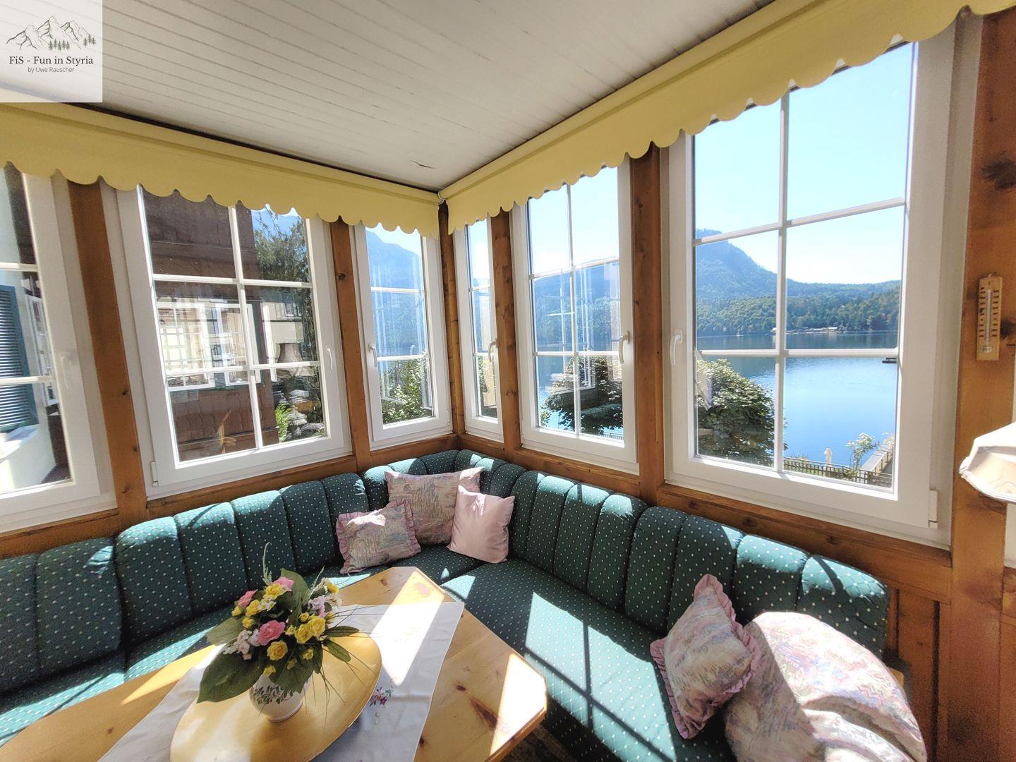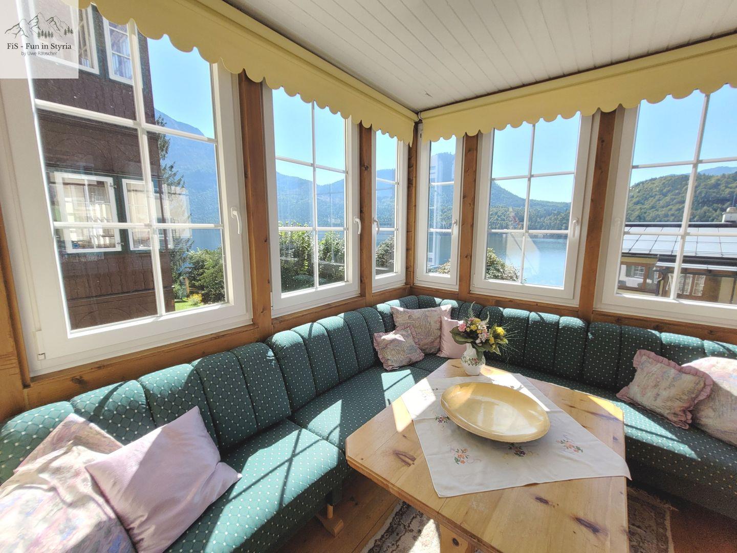 Ein besonderes Highlight ist der geschlossene, überdachte Balkon, von dem Sie einen außergewöhnlich guten Ausblick auf den See, die Berge, das Tal und die umliegende Landschaft genießen. Der gepflegte Garten mit Liegewiese und Sonnenliegen lädt zum Verweilen ein. Hier können Sie entspannen, während Sie den Blick aufs Wasser oder die Alpenkulisse schweifen lassen. Der Zugang zum Steg und die Lage in erster Reihe zum steinigen Strand sorgen für unmittelbares Badevergnügen am Altausseer See – nur etwa zehn Meter entfernt. Auch Aktivitäten wie Angeln, Bootsmiete oder Kanufahren sind in unmittelbarer Nähe möglich.