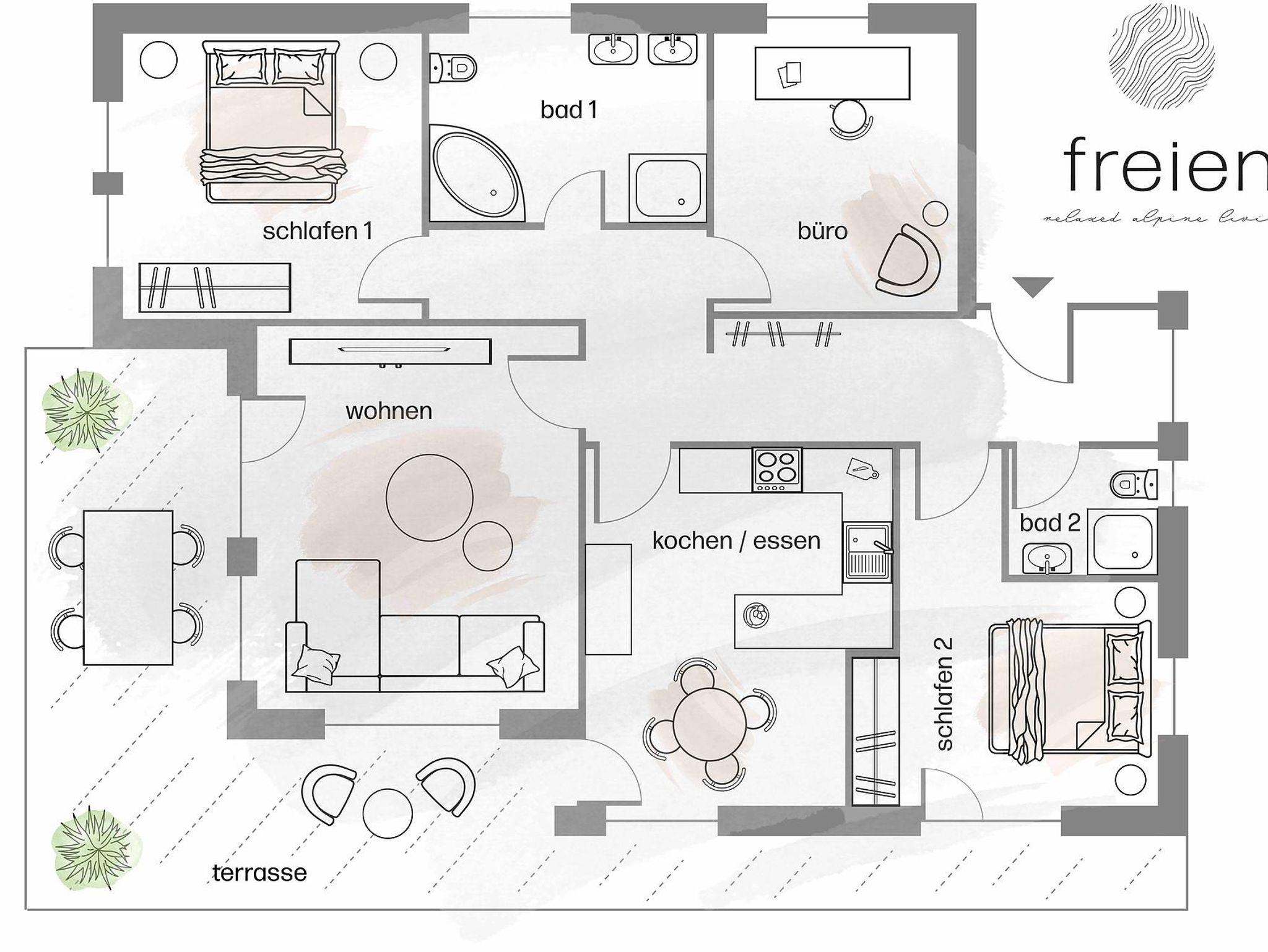 Auf 103 m² finden sich 2 Schlafzimmer mit Emma Matratze, 2 Bäder mit Tageslicht, Küche mit großzügigem Essbereich, Wohnzimmer, sowie ein Büro mit Leseecke.