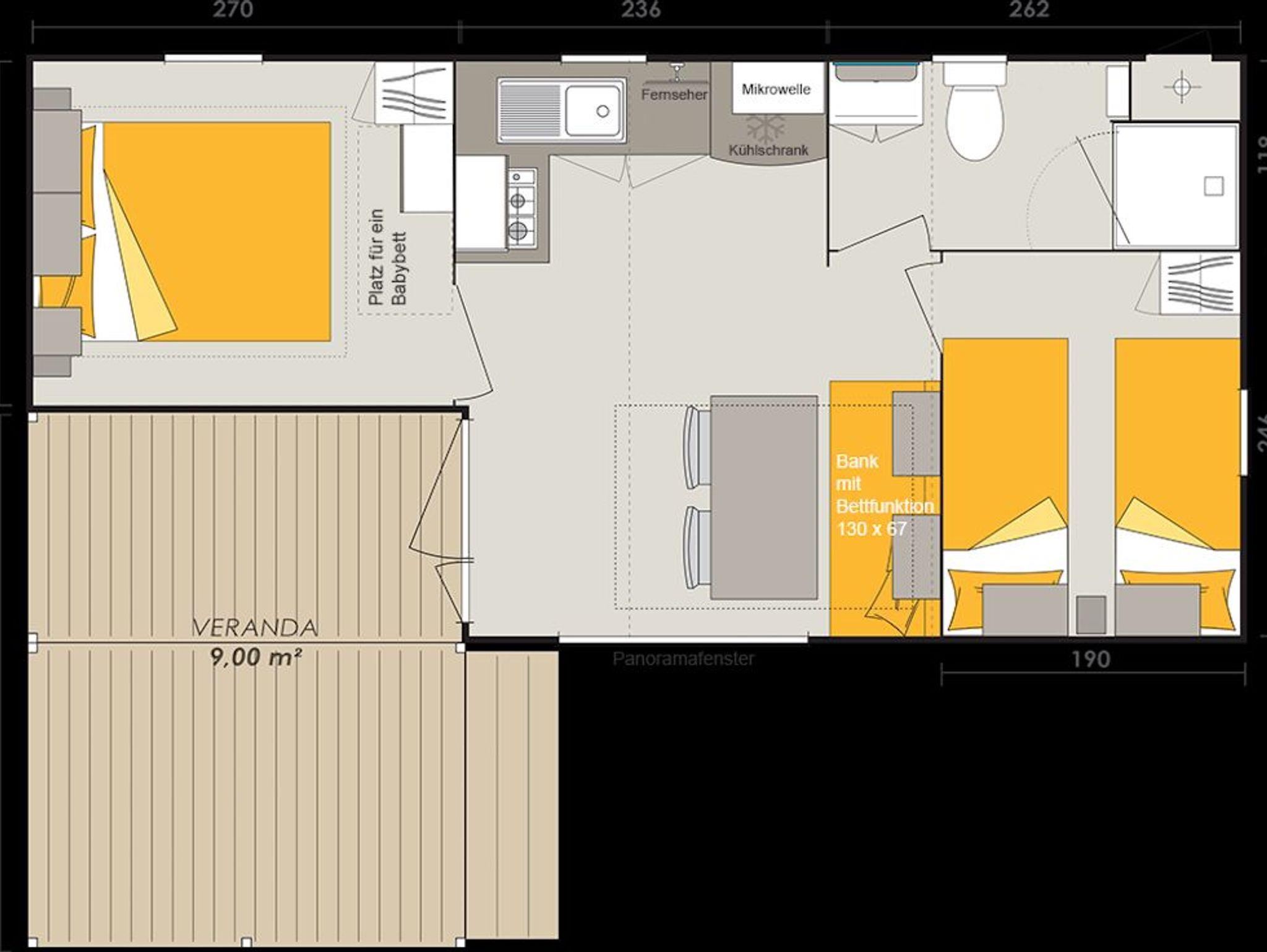 Unsere Mobilheime, jedes für maximal 5 Personen geeignet, sind in einem eigenen Bereich des Campingplatzes aufgestellt. Parkplätze sind- je nach Lage des Mobilheims- maximal 70 m entfernt. Zu unserer 6000 m2 großen Liege- und Badewiese direkt am See sind es nur 100 m. Jedes Häuschen hat 25 m2 mit einer 9 m2 Holzterrasse. Ein großes Fassadenfenster (mit Verdunkelungsvorhängen) sorgt für unvergleichliche Helligkeit im Wohnbereich. Die Küche ist voll ausgestattet. 9 Griller im Mobilheimareal können Sie gerne benützen.
