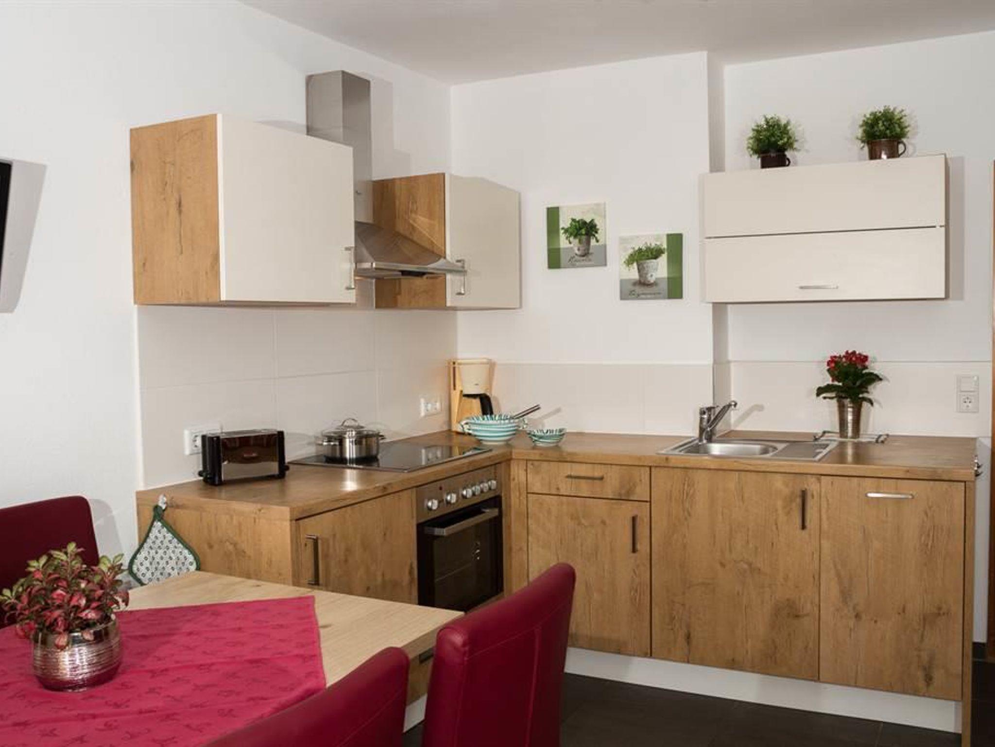• große helle Wohnküche mit komplett eingerichteter Küche, Essbereich, Kachelofen mit Bank, TV