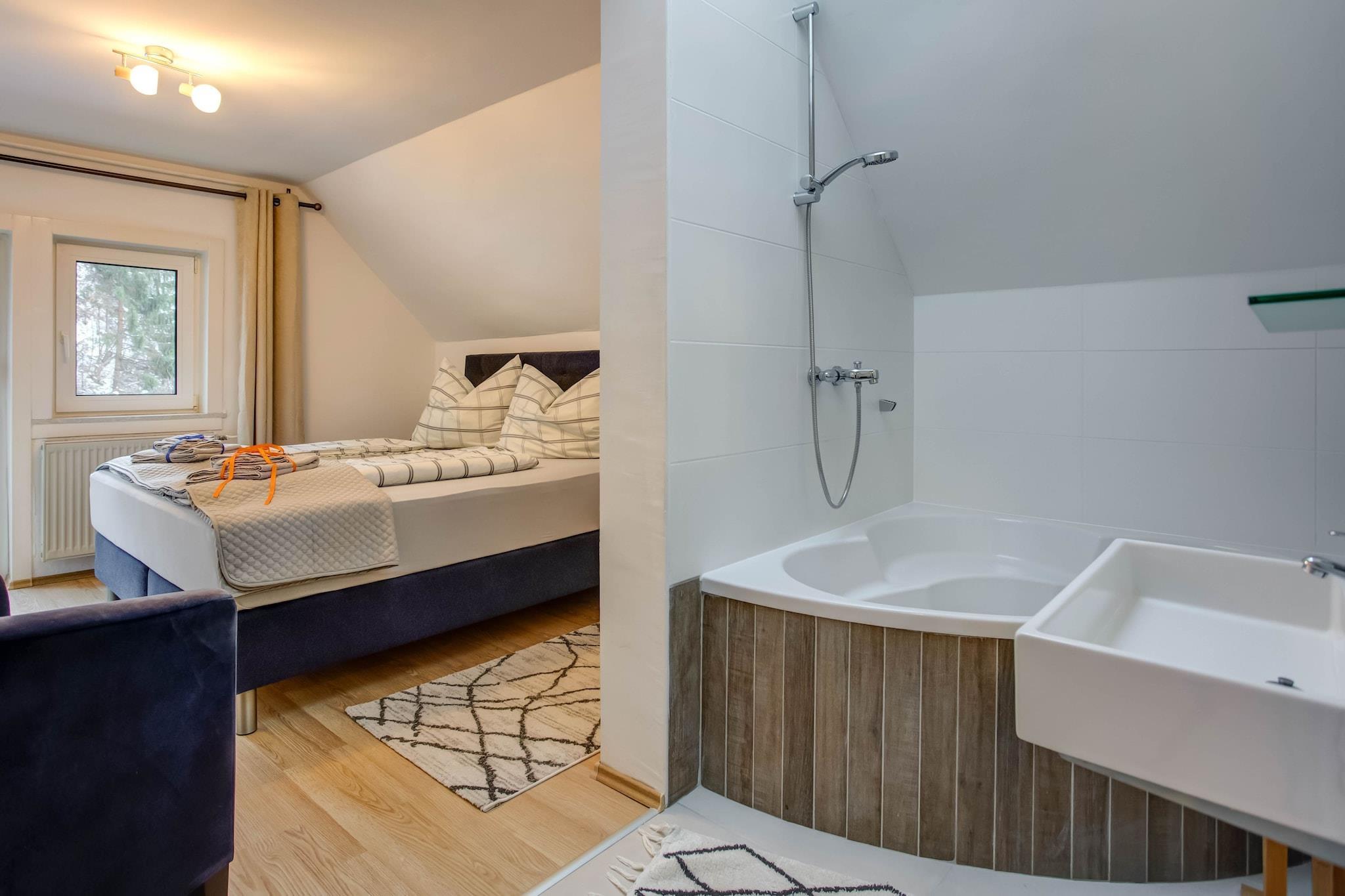 Denna rymliga lägenhet är perfekt för familjer eller grupper av vänner som söker komfort och avskildhet. Den är idealisk för äldre barn som vill ha ett eget rum eller vänner som vill ha ett mysigt vardagsrum med eget badrum, och erbjuder allt för en avkopplande semester. Lägenheten ligger i utkanten av Feld am See, bara 400 meter från byns centrum, där du hittar butiker, restauranger och en stormarknad för dina nödvändigheter. Feldsee-sjön ligger bara 500 meter bort, perfekt för en dagsutflykt eller en lugn promenad. Lägenheten har två sovrum, två badrum, ett fullt utrustat kök, en matplats, en platt-TV och en balkong med utsikt över trädgården. Sängkläder och handdukar ingår, så att du kan resa lätt. Med kommer din semester med frihet, avskildhet och komfort. Njut av frukost i pyjamasen, laga mat med lokala råvaror och varva ner utan att oroa dig för utegångsförbud. Oavsett om du söker en sommarflykt, en weekendresa eller en skidsemester, är denna lägenhet en perfekt bas för att utforska regionen och uppleva den autentiska lokala atmosfären. Boka din vistelse idag och njut av en oförglömlig semester i Feld am See!
