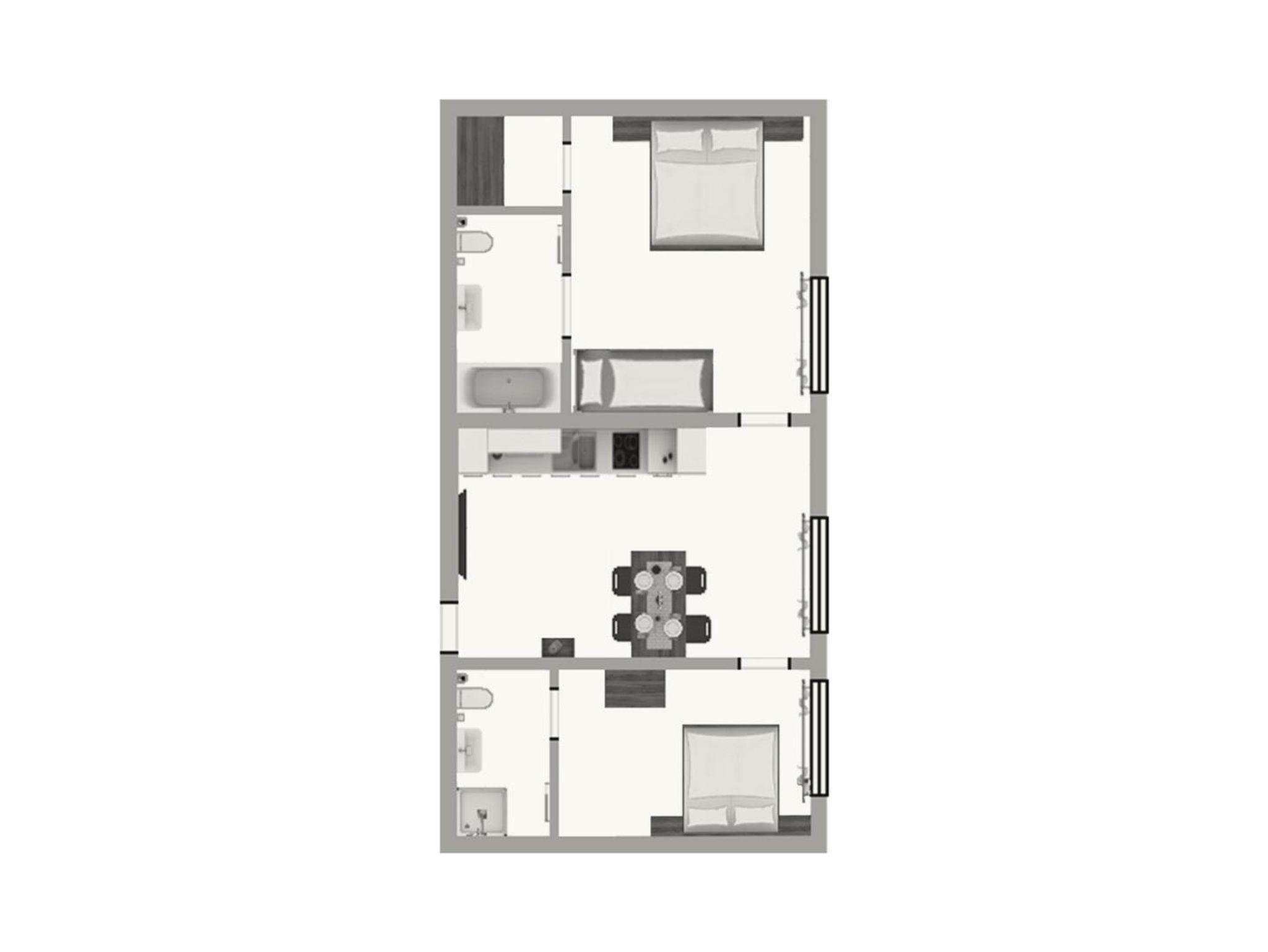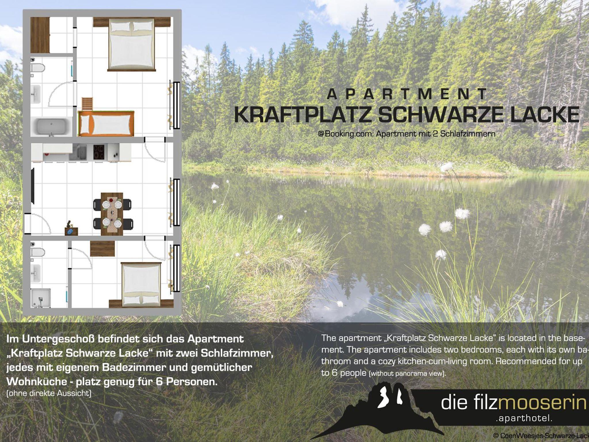 Im Untergeschoß befindet sich das Apartment Kraftplatz Schwarze Lacke mit zwei Schlafzimmer - jedes mit eigenem Badezimmer und gemütlicher Wohnküche - Platz genug für 6 Personen (ohne direkte Aussicht).