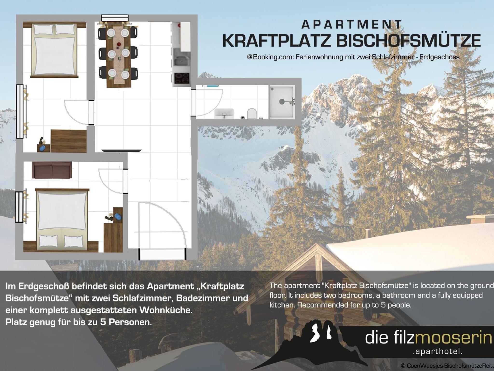 Im Erdgeschoß befindet sich das Apartment Kraftplatz Bischofsmütze mit zwei Schlafzimmer, Badezimmer und einer komplett ausgestatteten Wohnküche. Platz genug für bis zu 5 Personen.