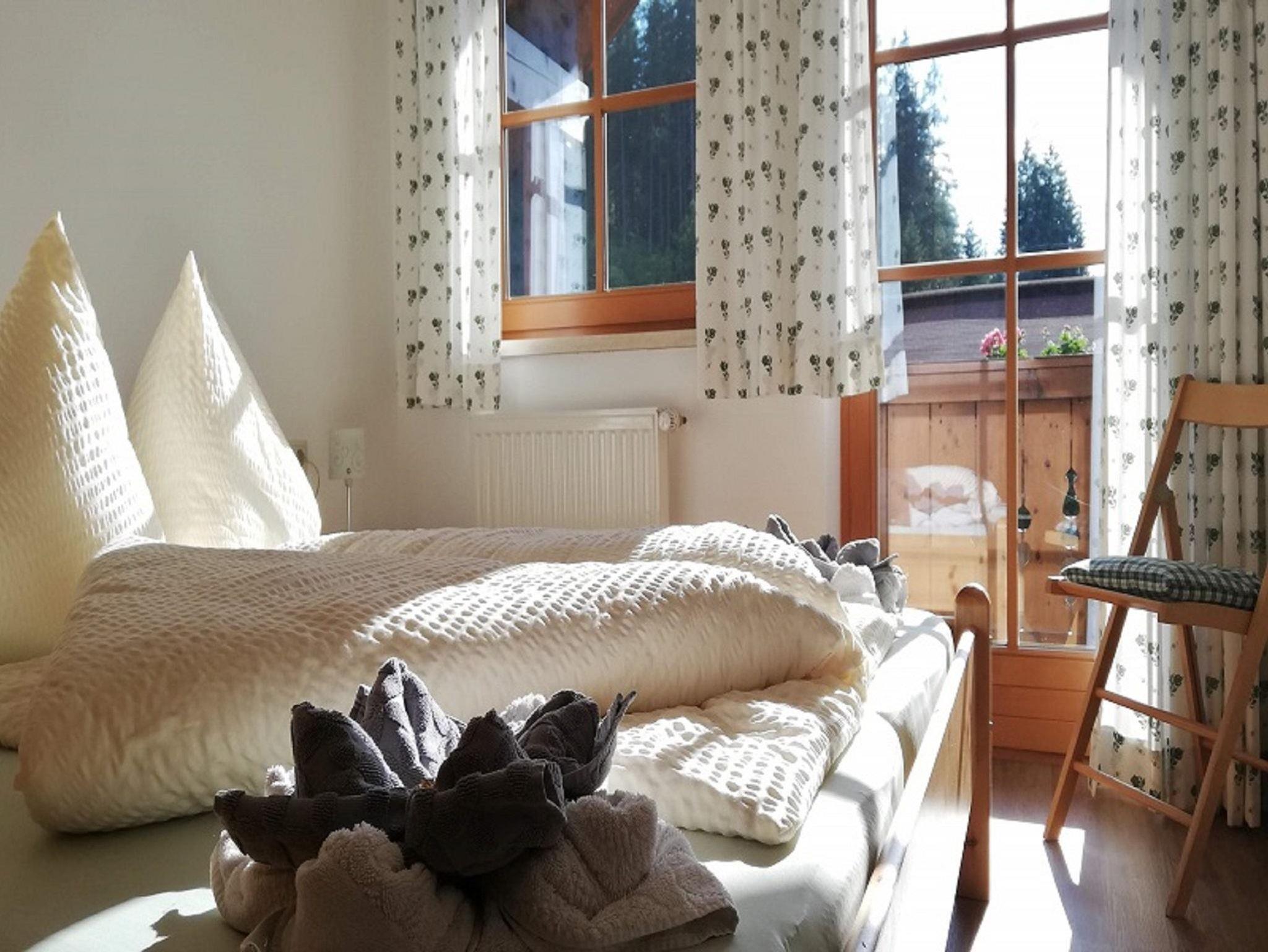 Die Ferienwohnung Lärche (60 m²) ist mit 2 getrennten Schlafzimmern ausgestattet, großer Wohn-Essraum, vollausgestattete Küche, Dusche, WC und 2 Balkone (für 4 – 6 Personen).