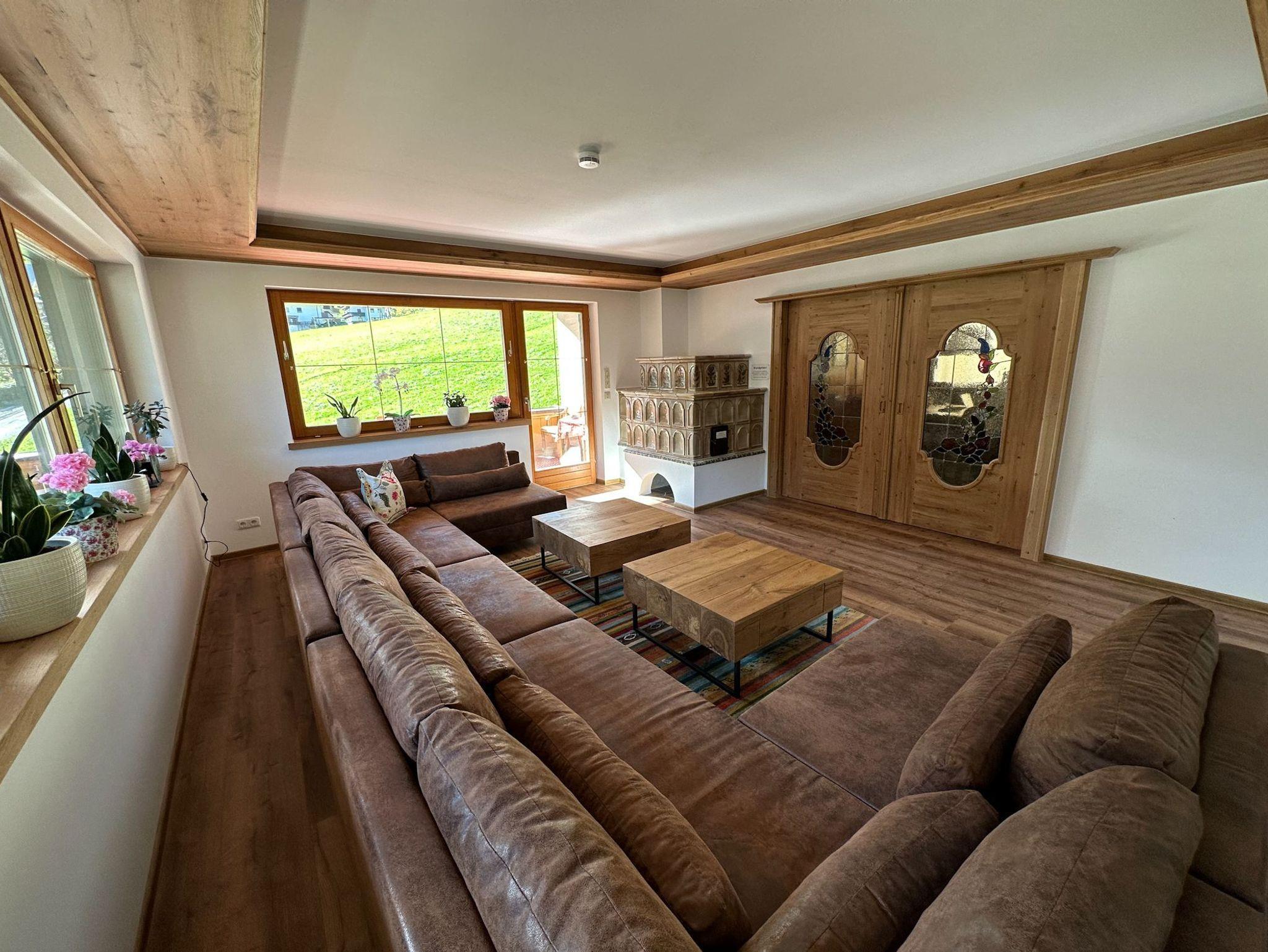 - Wohnzimmer mit großer Couch, Kachelofen (nur zur Dekoration) und Flat-TV