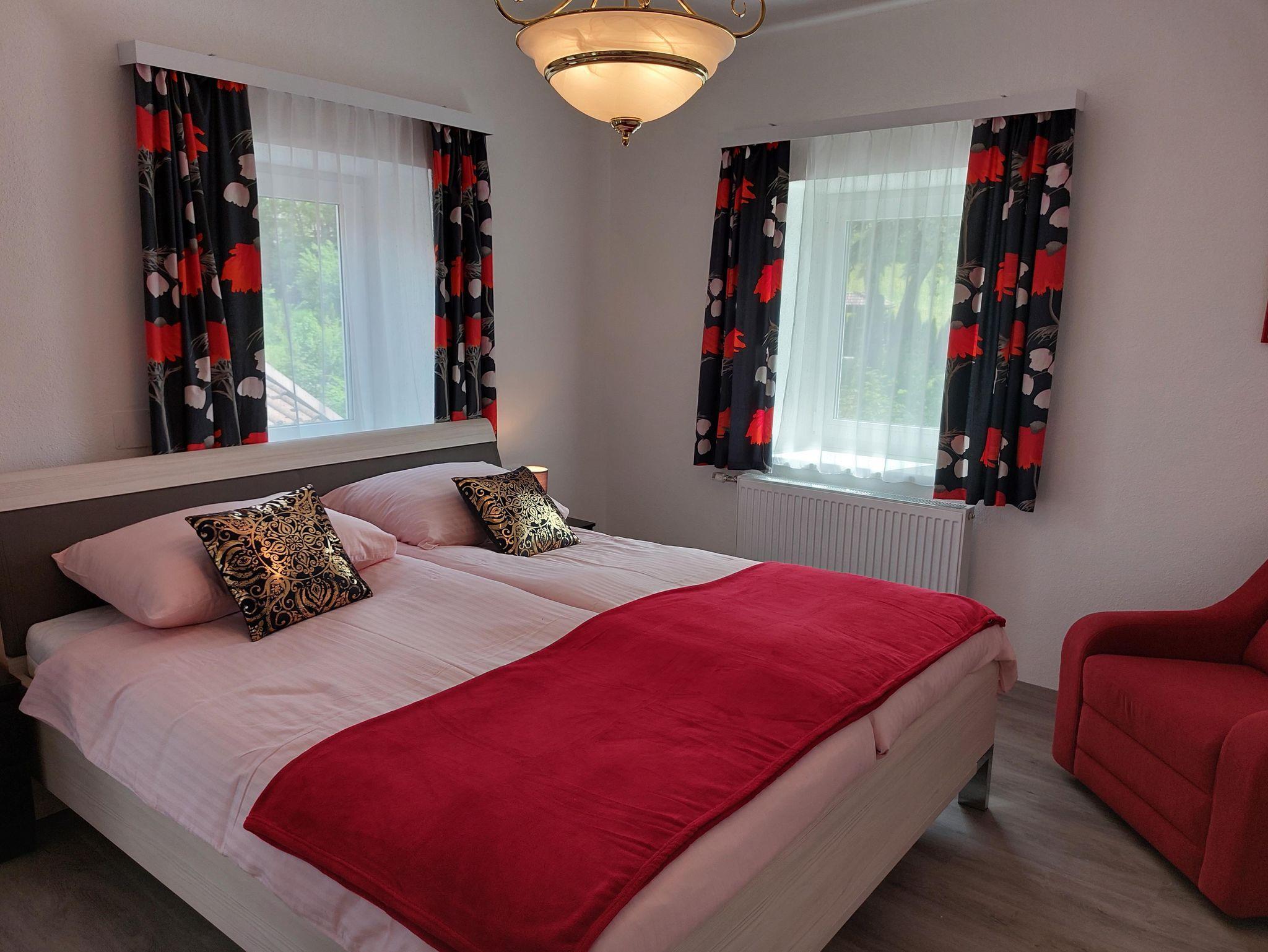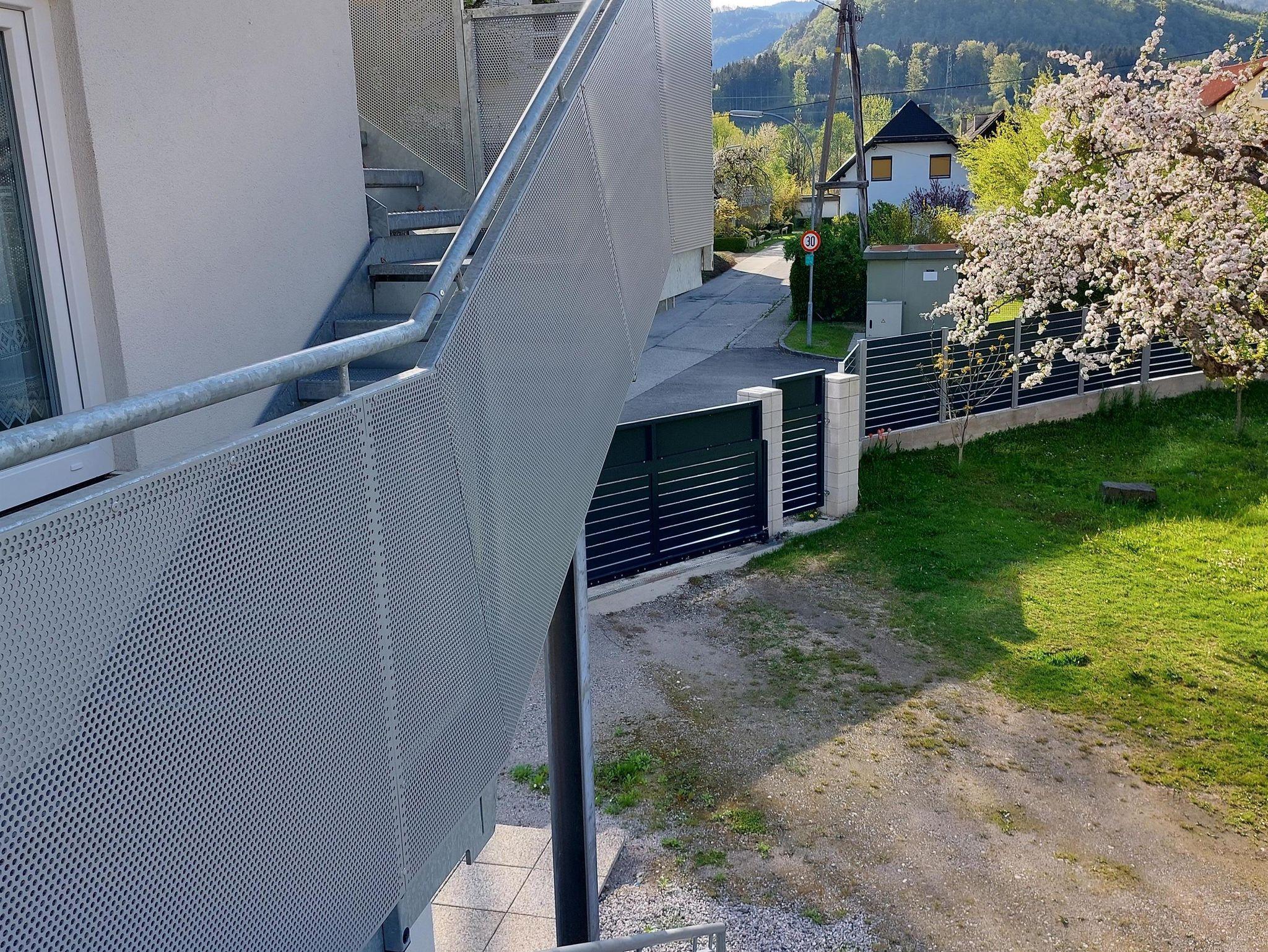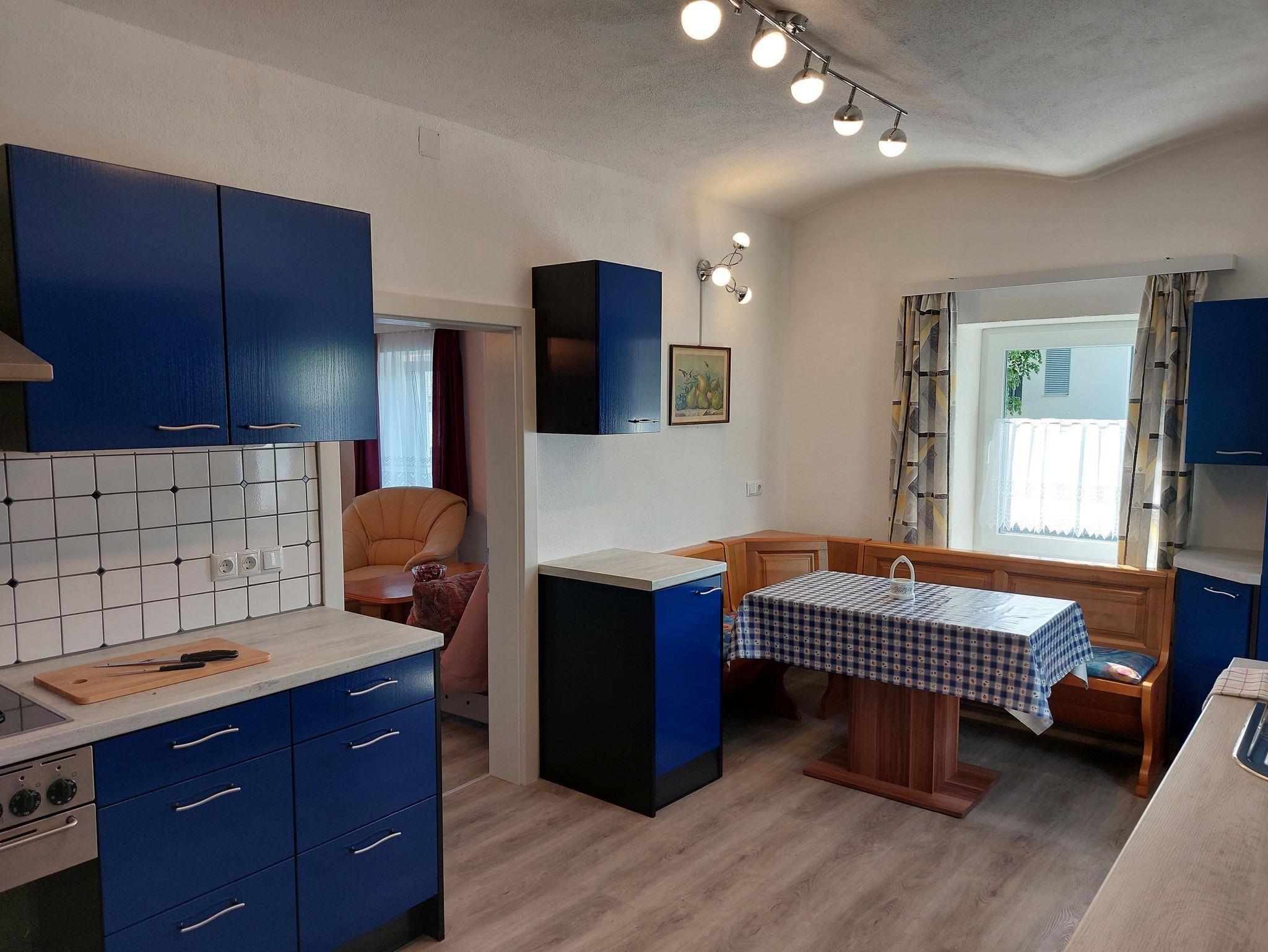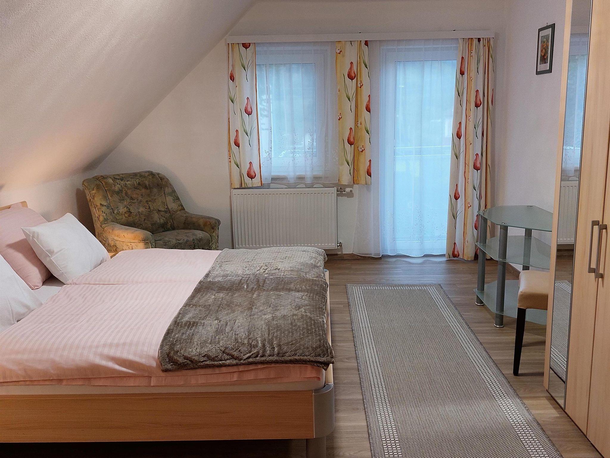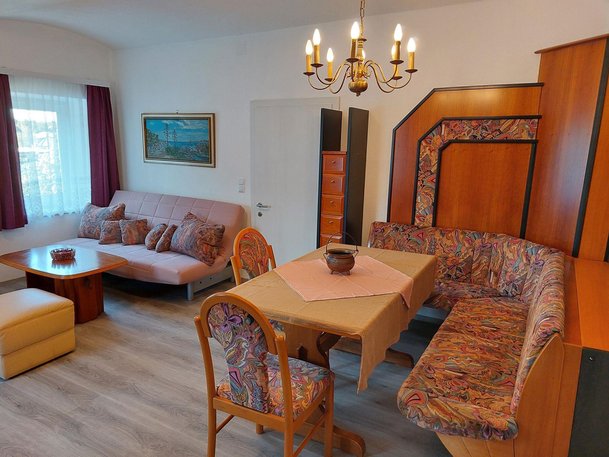 Die Ferienwohnung 1 mit 95 m² befindet sich im zweiten Stock mit separaten Zugang (Außenstiege) und hat einen kleinen Balkon mit Tisch und Sessel.