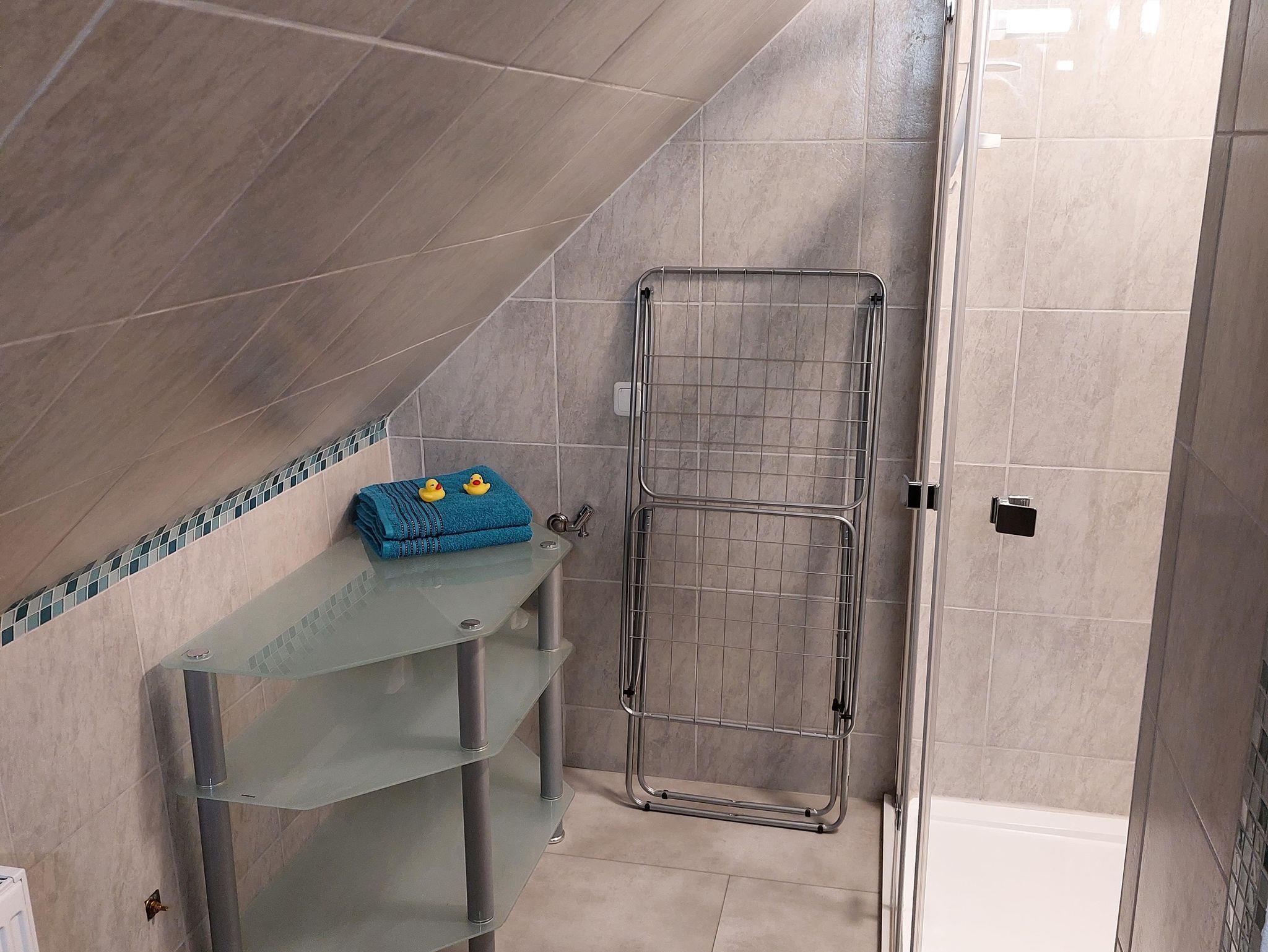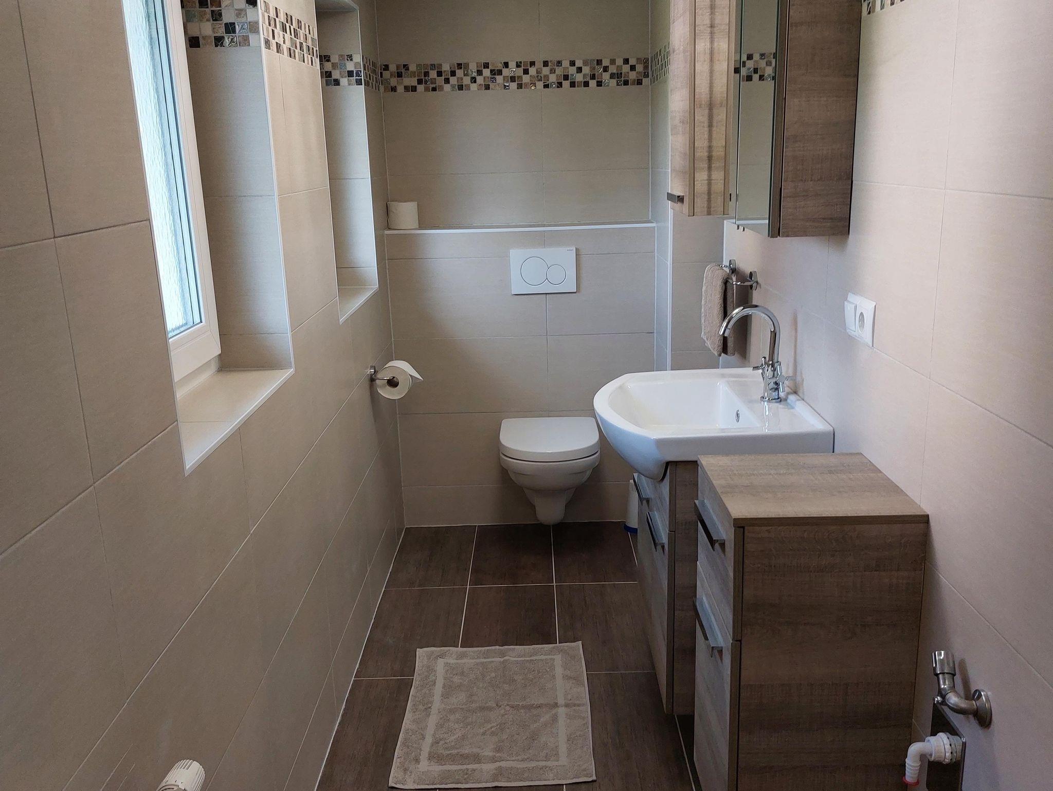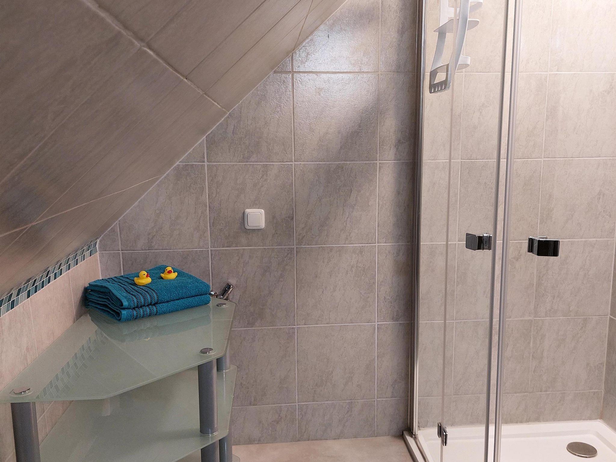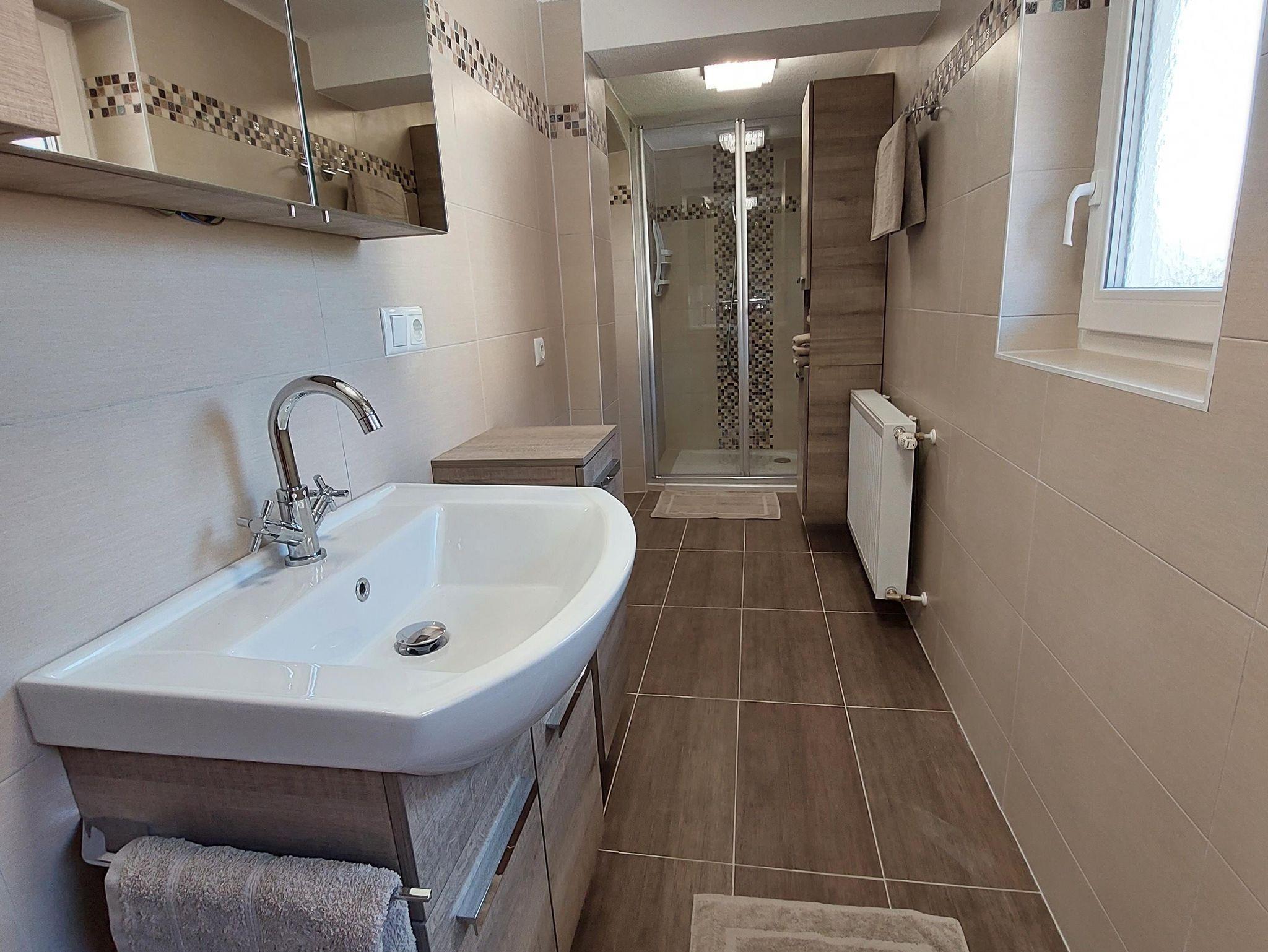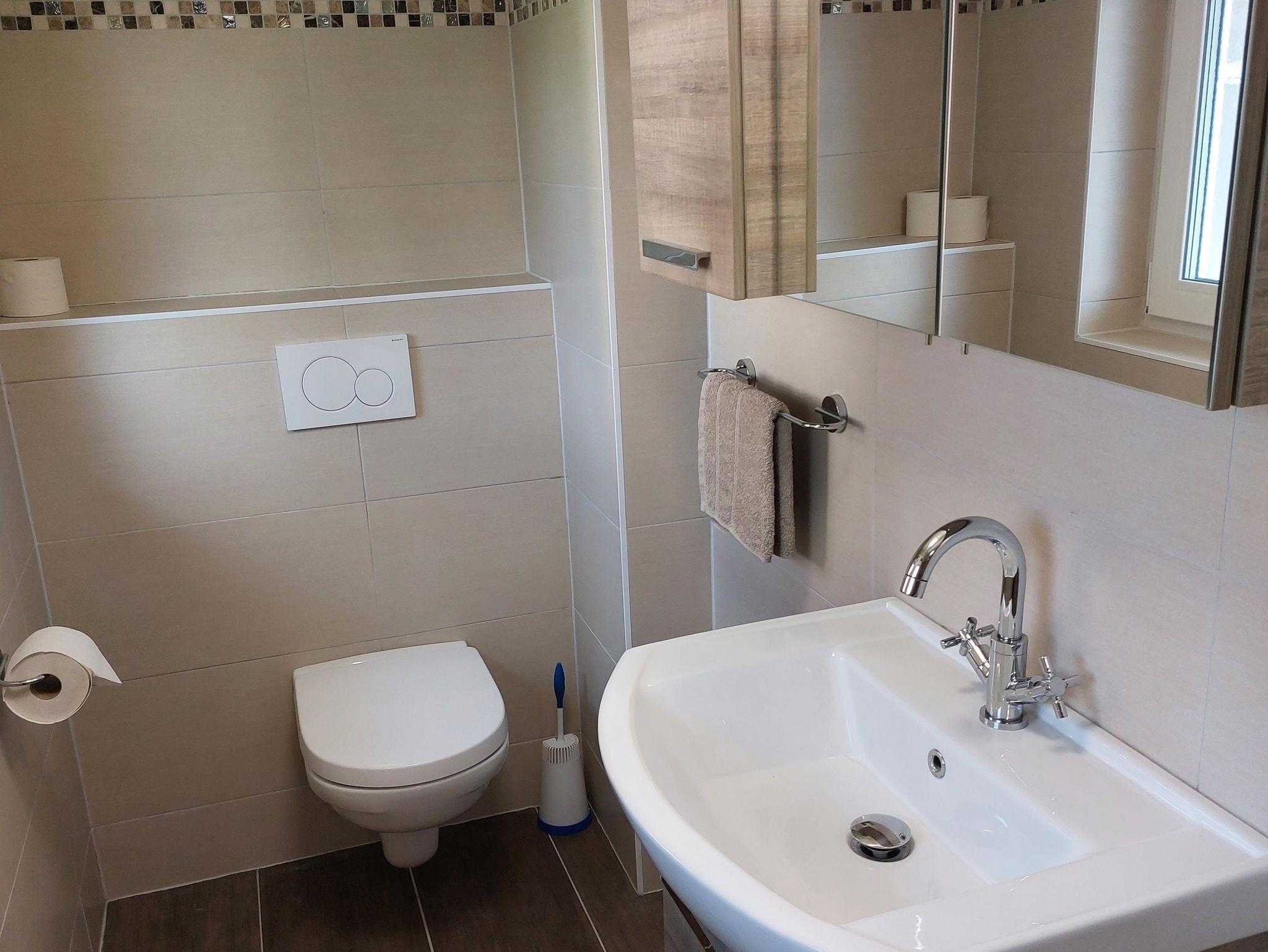 Die Ferienwohnung 1 mit 95 m² befindet sich im zweiten Stock mit separaten Zugang (Außenstiege) und hat einen kleinen Balkon mit Tisch und Sessel.