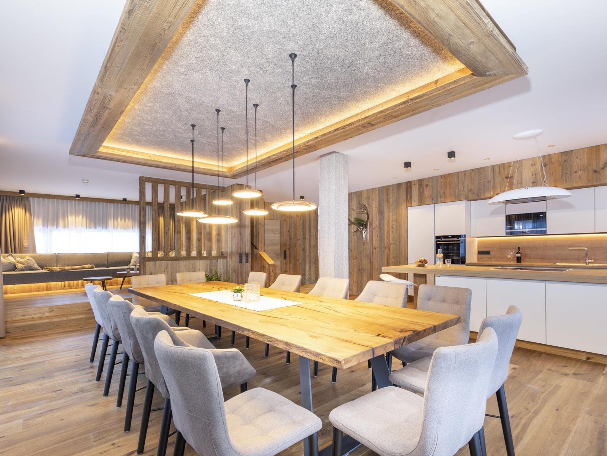 Ideal für 10 bis 16 Personen,Luxus zum Wohnen und Wohlfühlen auf 2 Stockwerken,überdachte, südseitig ausgerichtete Dachterrasse, eigene PanoramaSAUNA, große, vollausgestattete Küche mit Kochinsel, Esstisch für 10 – 16 Personen, Lounge zum Chillen, Lesen oder für gemütliche Fernseh-Abende vorm 55 Zoll-TV mit Sky-Fernsehen, extra WC im Wohnbereich, 5 großzügige Schlafzimmer mit jeweils eigenem, großen Bad (Dusche und WC; 2 Schlafräume mit Badewanne und WC), eigenem TV, vollwertige Zustellbetten, 2 Kinderschlafnester mit TV