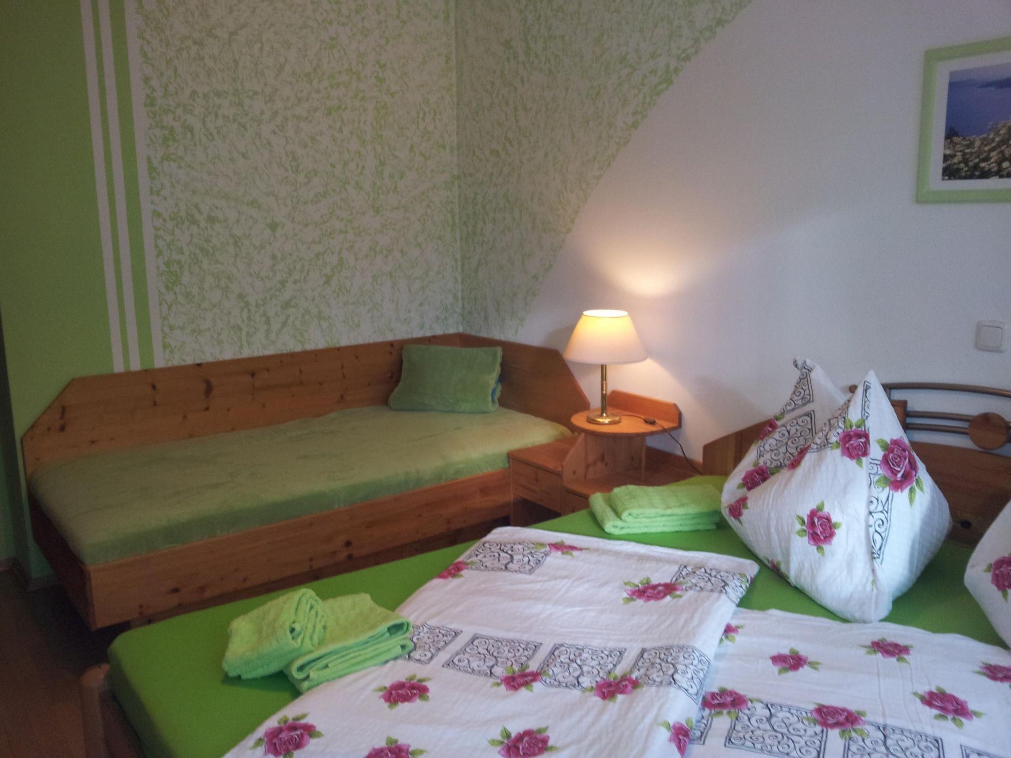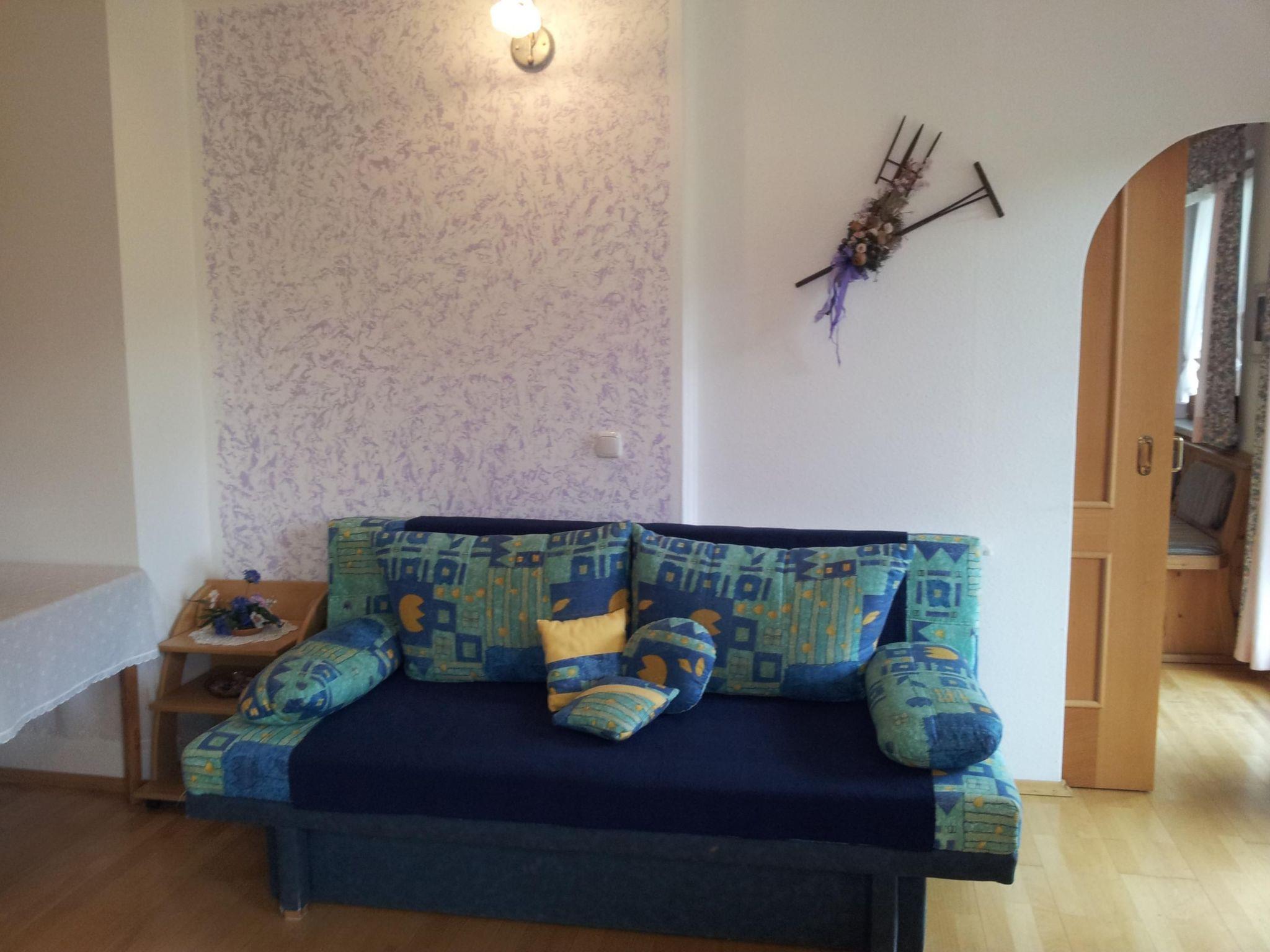 The fully furnished flat for up to ten people has its own entrance and is approx. 100m² in size. In the spacious kitchen you will find a dishwasher, cooker, coffee machine, toaster and all the important utensils for cooking and eating. There is also a cosy seating area. In the living room you will find three pull-out double sofas as well as a wall unit with stereo system, TV and SAT, video recorder and DVD player. In the first bedroom you will find a double bed and two single beds. The second bedroom also has a double bed and a single bed. There is a TV with SAT in both bedrooms. The large bathroom has a double washbasin, bathtub, extra shower, bidet and a washing machine. There is also a separate WC in the flat. The holiday flat also has underfloor heating and shutters. There is parquet flooring in the living rooms and bedrooms.