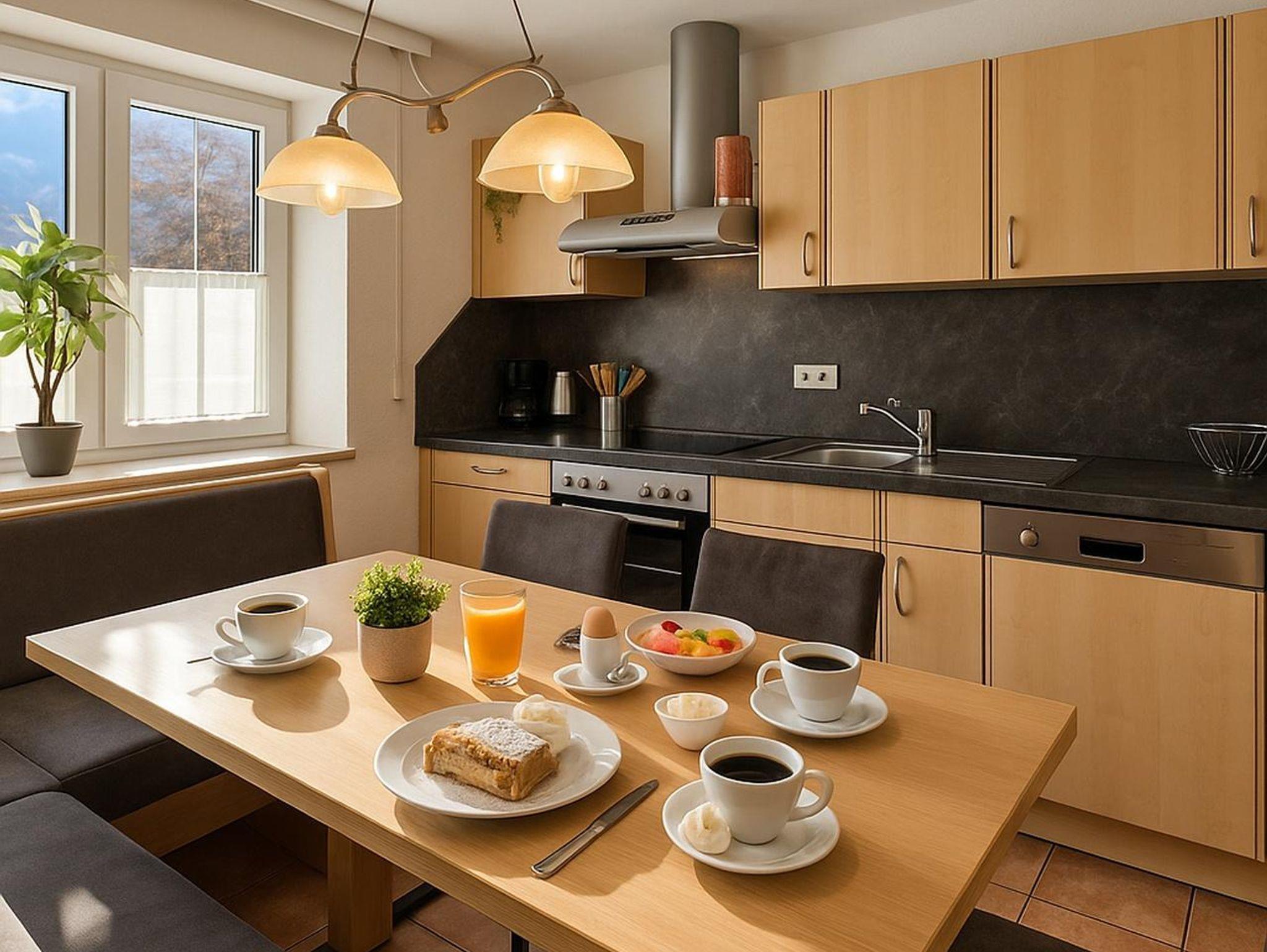 Die Küche des Apartments ist ausgestattet mit: Elektroherd mit Backofen, Geschirrspüler, Kühlschrank, Gefrierschrank, Kaffeemaschine, Wasserkocher, Toaster, Eierkocher, Mikrowelle und Mixer. Porzellan, Besteck, Gläser und Kochgeschirr.