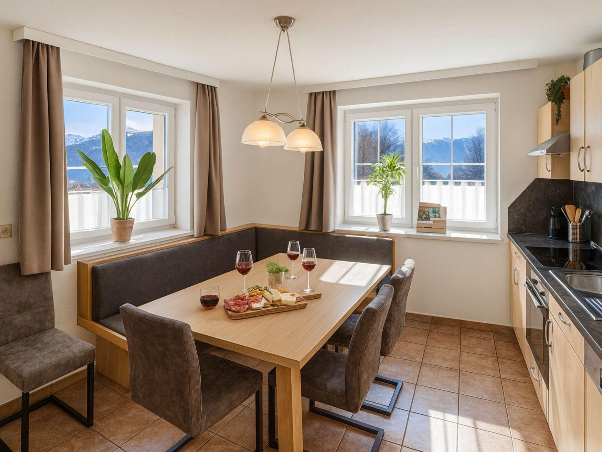 Die Küche unseres Appartements ist wie folgt ausgestattet:Elektroherd mit Backrohr, Geschirrspüler, Kühlschrank, Gefrierschrank, Kaffeemaschine, Wasserkocher, Toaster, Eierkocher, Mikrowelle und Stabmixer. Porzellan, Besteck, Gläser und Kochgeschirr.