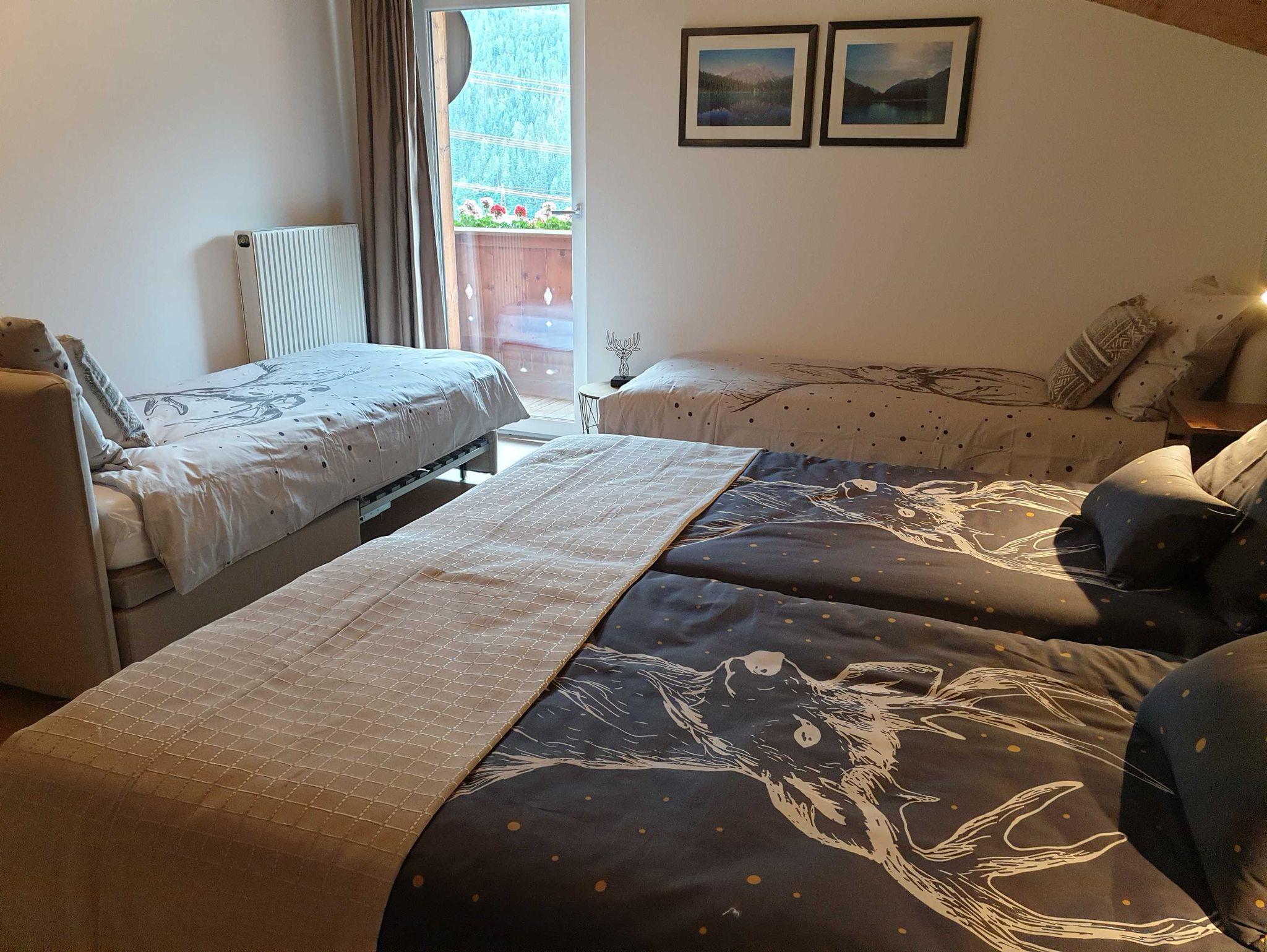 Ferienwohnung ALPENROSE, im zweiten Stock verfügt über zwei geräumige Schlafzimmer, ein grosses Wohnzimmer und eine grosse, separate Küche mit Herd, Backofen, Kühlschrank und Geschirrspüler. Das Ganze ist in einer persönlichen Atmosphäre eingerichtet, damit sich die Gäste wie zu Hause füllen. Balkon und Terrasse mit Gasgrill, beide mit herrlichen Ausblick, runden das Bild ab.
