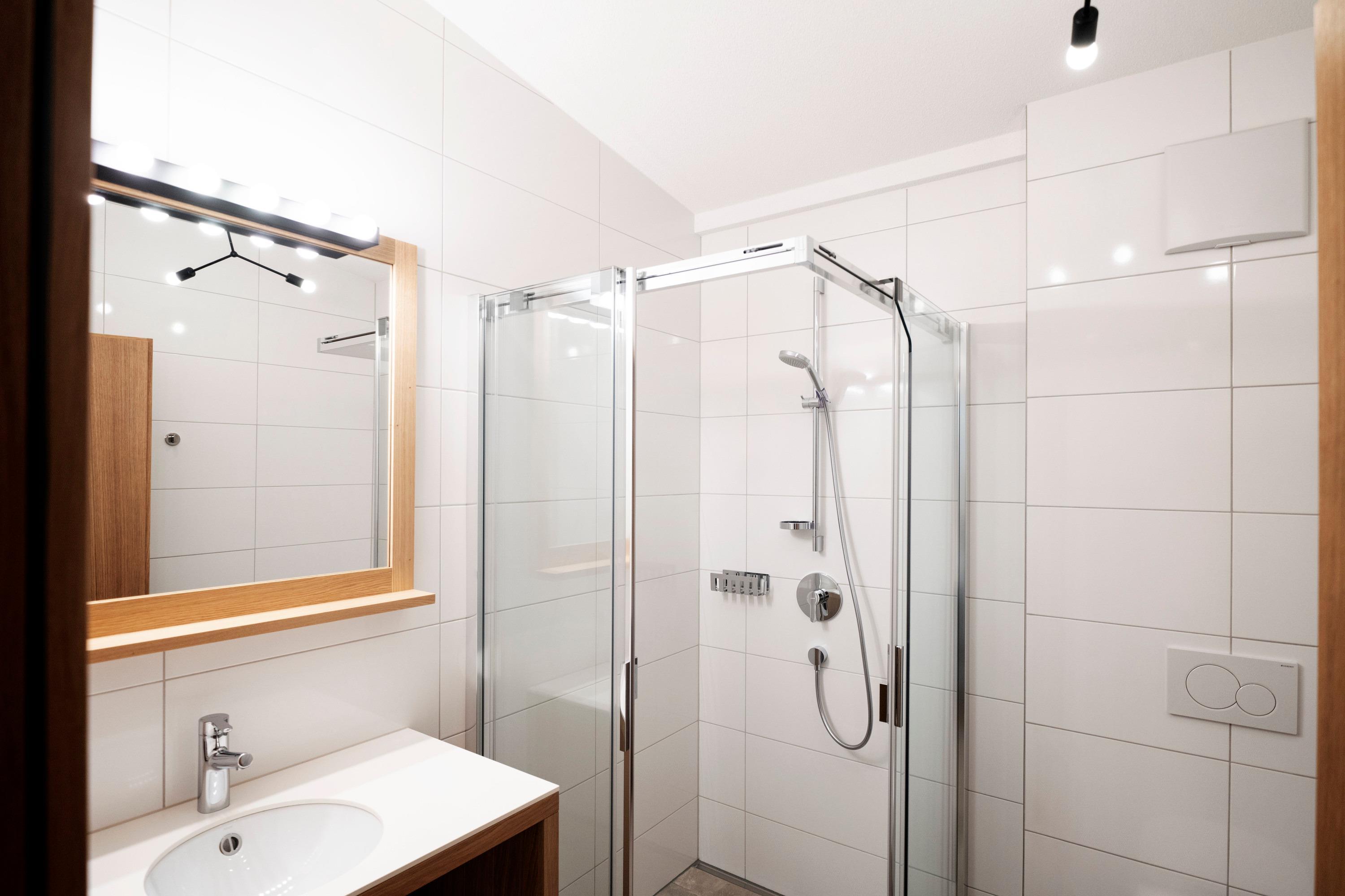 Das funktionale Badezimmer mit geräumiger Dusche, WC und einem großen Waschtisch bietet genügend Ablageflächen für persönliche Dinge. Ein Handtuchwärmer und ein Haar-Fön gehören zum Standard im Berg Apart.