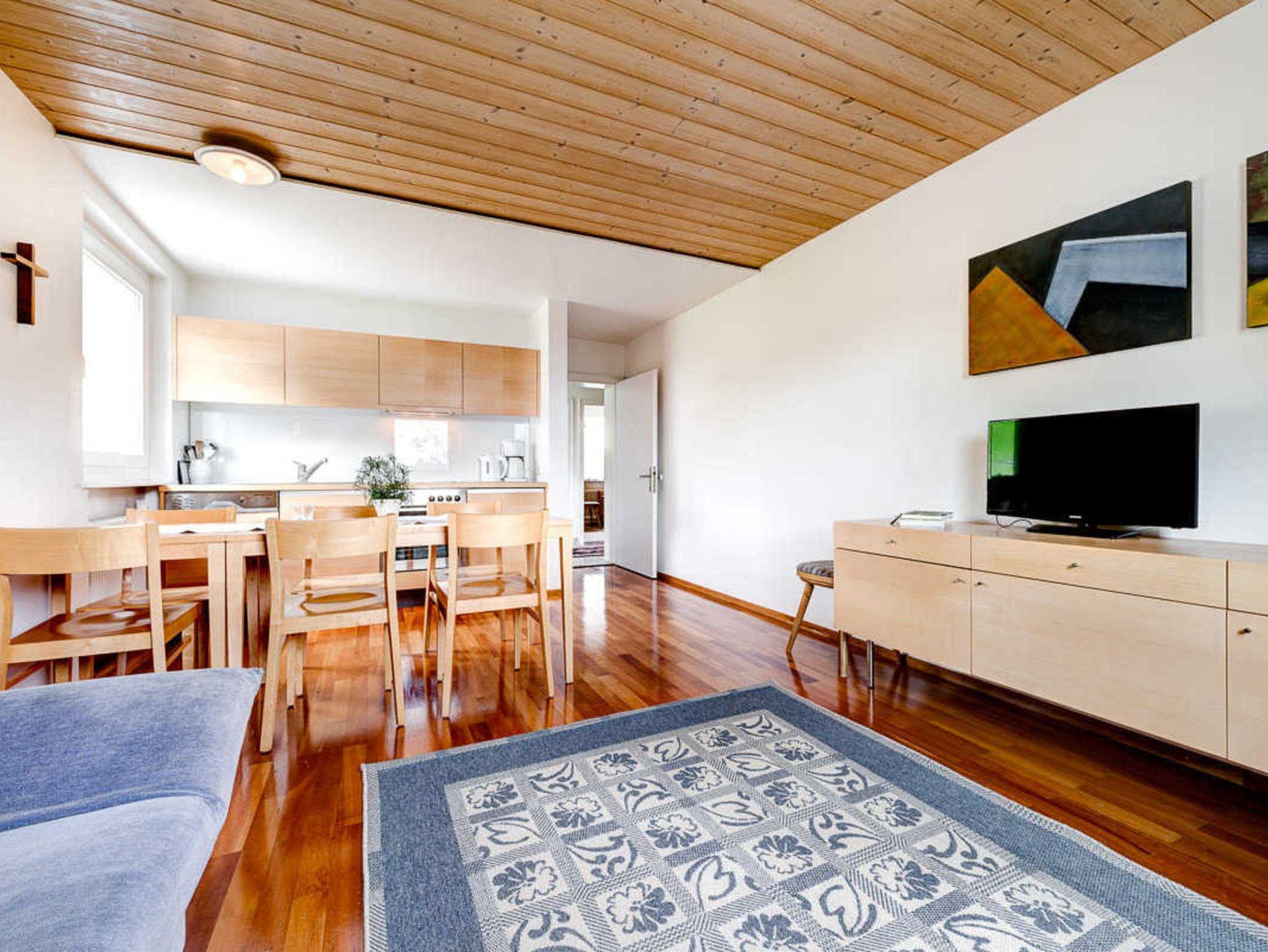 Komfortable Wohnung mit geräumiger Wohnküche, einem Doppelzimmer und 2 Einzelzimmer geeignet für Familien mit Kindern. Südseitig mit Balkon mit Blick auf die umliegenden Berge.