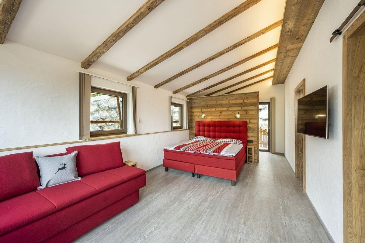 Im Obergeschoss befinden sich die Schlafzimmer. Diese sind aufgeteilt in einen großzügigen Master-Bedroom mit Badezimmer en-Suite (Dusche, Toilette, Waschbecken), begehbarem Kleiderschrank, Couch (bei Bedarf zwei weitere Schlafplätze), Flatscreen-TV, ein privater Balkon und Zugang zum großen Balkon mit bodentiefen Fenstern und Bergpanorama. Die weiteren Schlafzimmer unterteilen sich in ein gemütliches Doppelbettzimmer mit Zugang zum Balkon und ein Vierbettzimmer mit einem Hochbett und einem Doppelbett. Alle Doppelbetten sind hochwertige Boxspringbetten, welche einen erholsamen Schlaf garantieren. Alle Schlafzimmer verfügen über ein Flatscreen-TV. Im Obergeschoss befindet sich zudem ein weiteres Badezimmer mit Dusche und Waschtisch sowie eine räumlich getrennte Toilette.