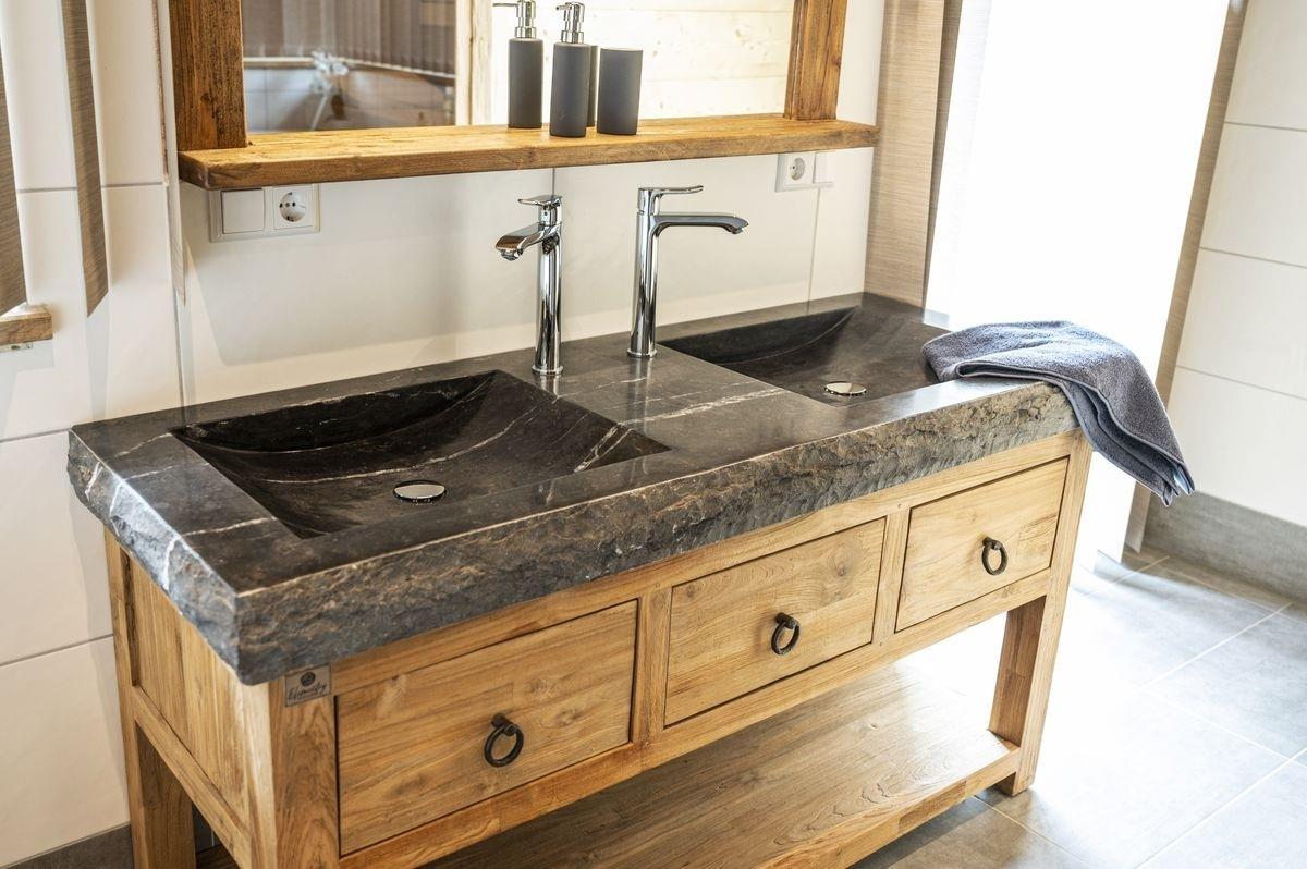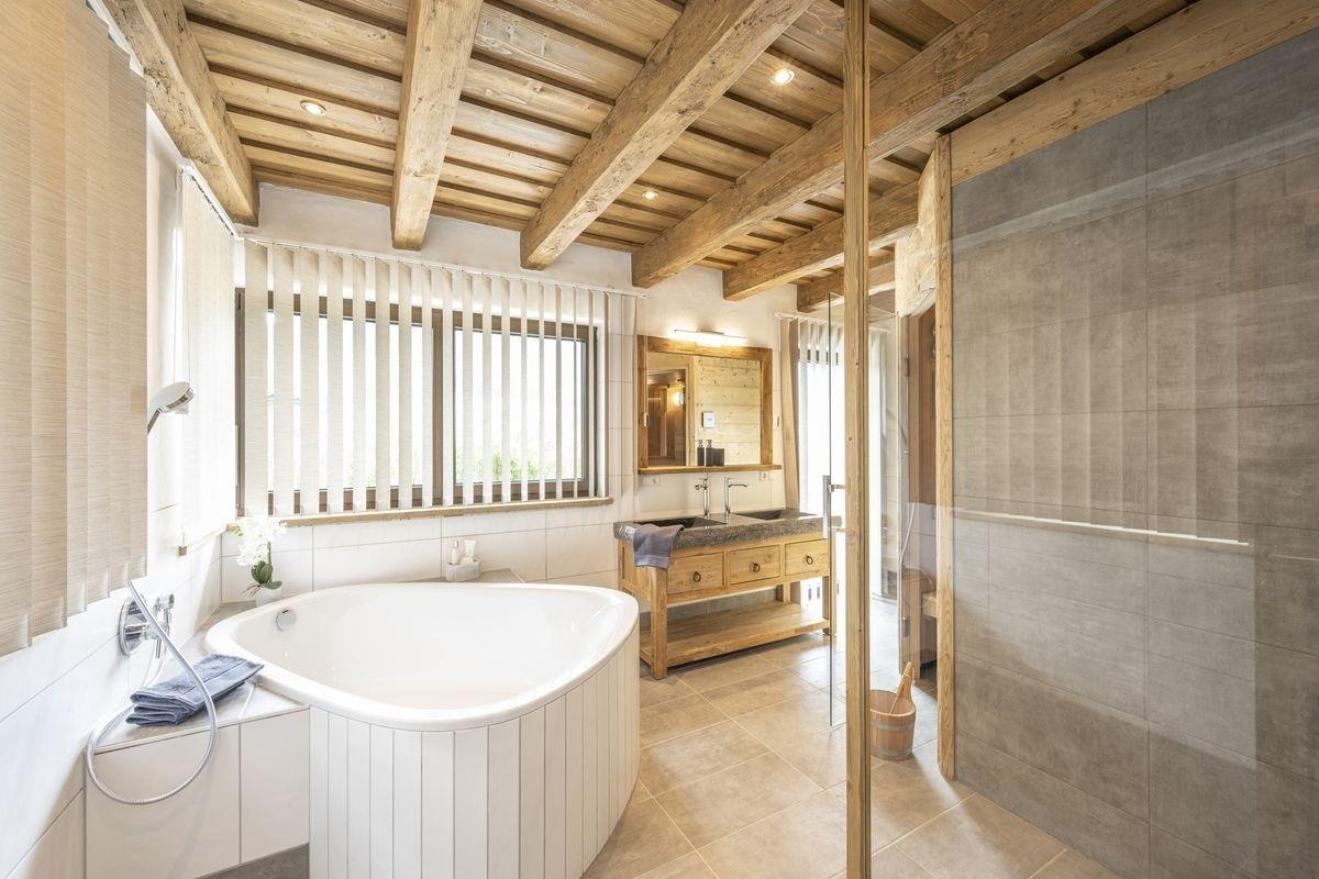 Nach einem erlebnisreichen Urlaubstag finden die Gäste im Wellnessbadezimmer die nötige Erholung. Aus der Sauna bietet sich ebenfalls ein toller Blick auf die Berge Österreichs. Die Sauna kann als klassische finnische Sauna genutzt werden oder auch als Bio-Sauna. Eine Wellness-Dusche (Regendusche) und eine große Eck-Badewanne sind auch vorhanden.