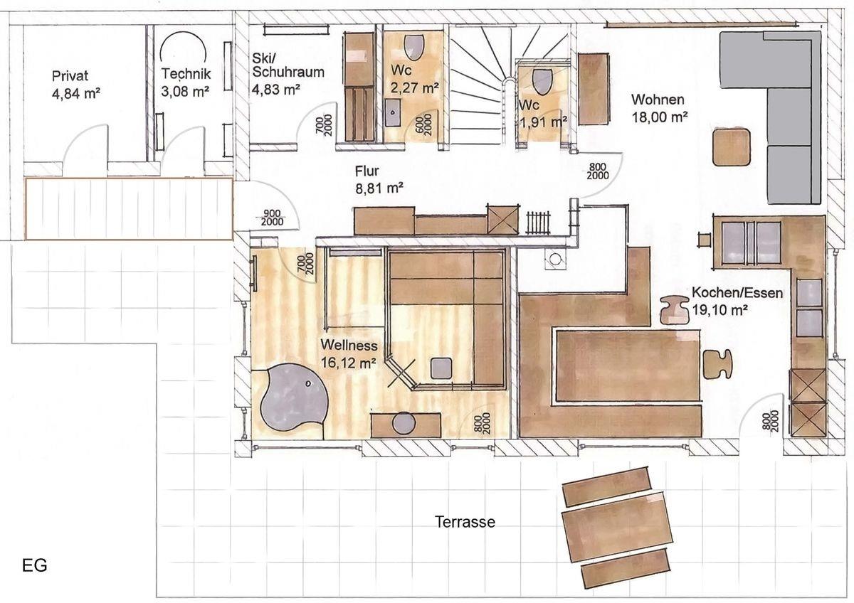 Jedes der 27 Chalets verfügt über 147qm Wohnfläche auf zwei Ebenen. Im Erdgeschoss befindet sich der Wohnbereich mit Essecke und Küche, ein großes Wellnessbadezimmer, zwei räumlich getrennte Toiletten sowie die Garderobe bzw. der Skiraum mit Skischuhwärmer.