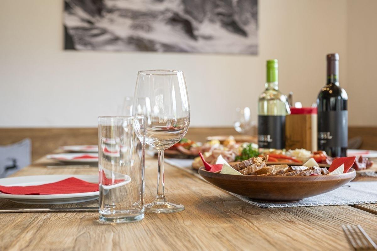 Die moderne Küchenzeile lässt auch bei Profi-Köchen keine Wünsche offen. Neben einem Induktions-Kochfeld gibt es einen Backofen, einen Kühl- und Gefrierschrank sowie allerhand Elektrogeräte. Der große Esstisch bietet allen Gästen ausreichend Platz. Aus dem Wohnbereich gelangt man auf die möblierte Terrasse, welche einen traumhaften Ausblick auf die umliegende Bergwelt bietet.