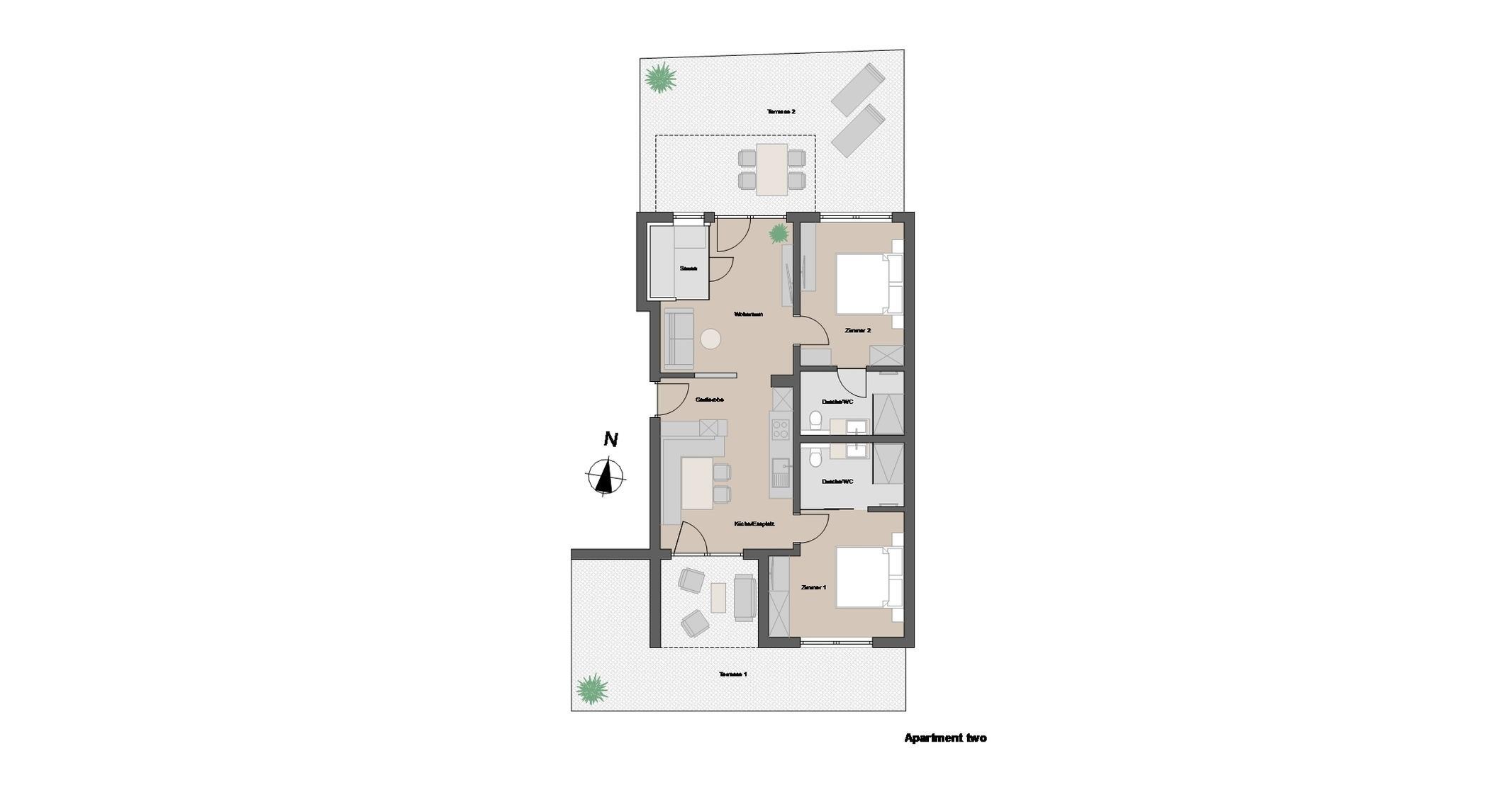 Das Apartment ? TWO verfügt über zwei weitläufige Terrassen, eine nach Südosten ausgerichtete Sonnenterrasse sowie eine nach Nordwesten ausgerichtete Terrasse für laue Sommerabende. Beide Terrassen sind voll möbliert und zum Teil überdacht.