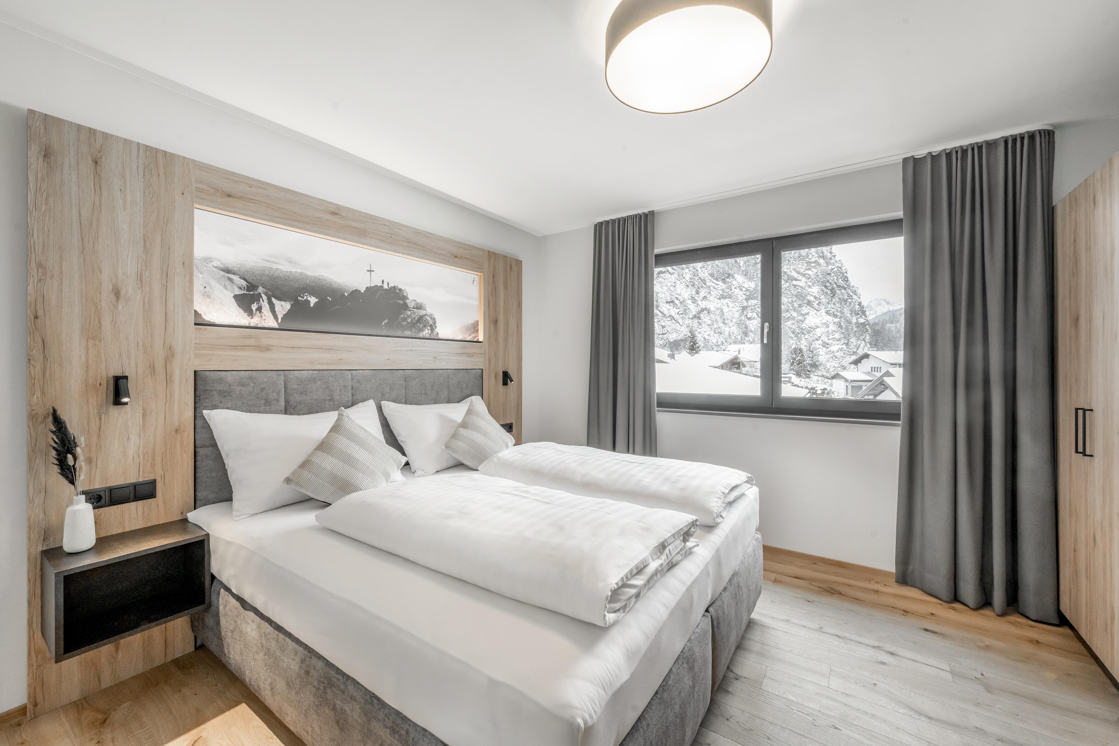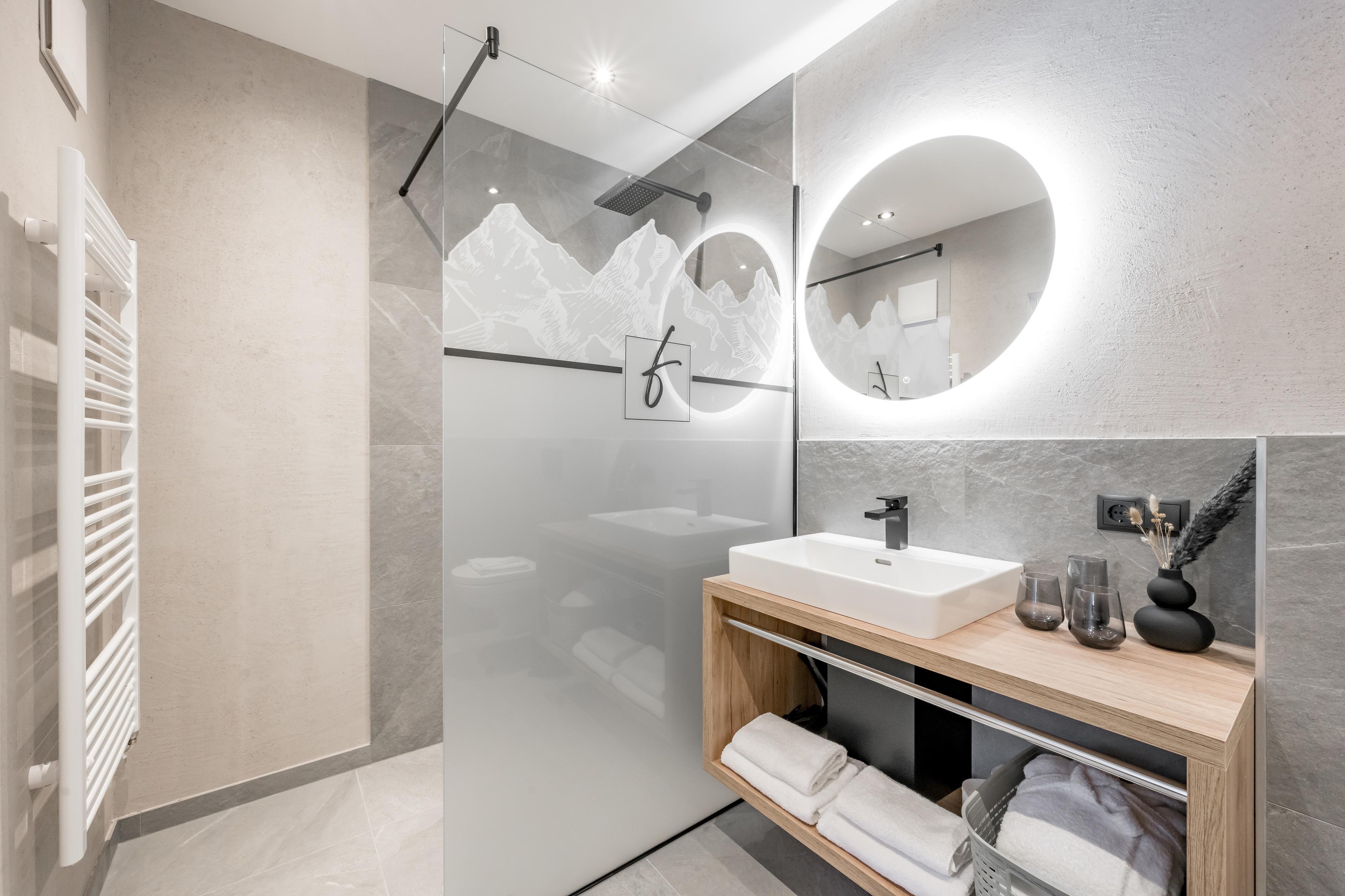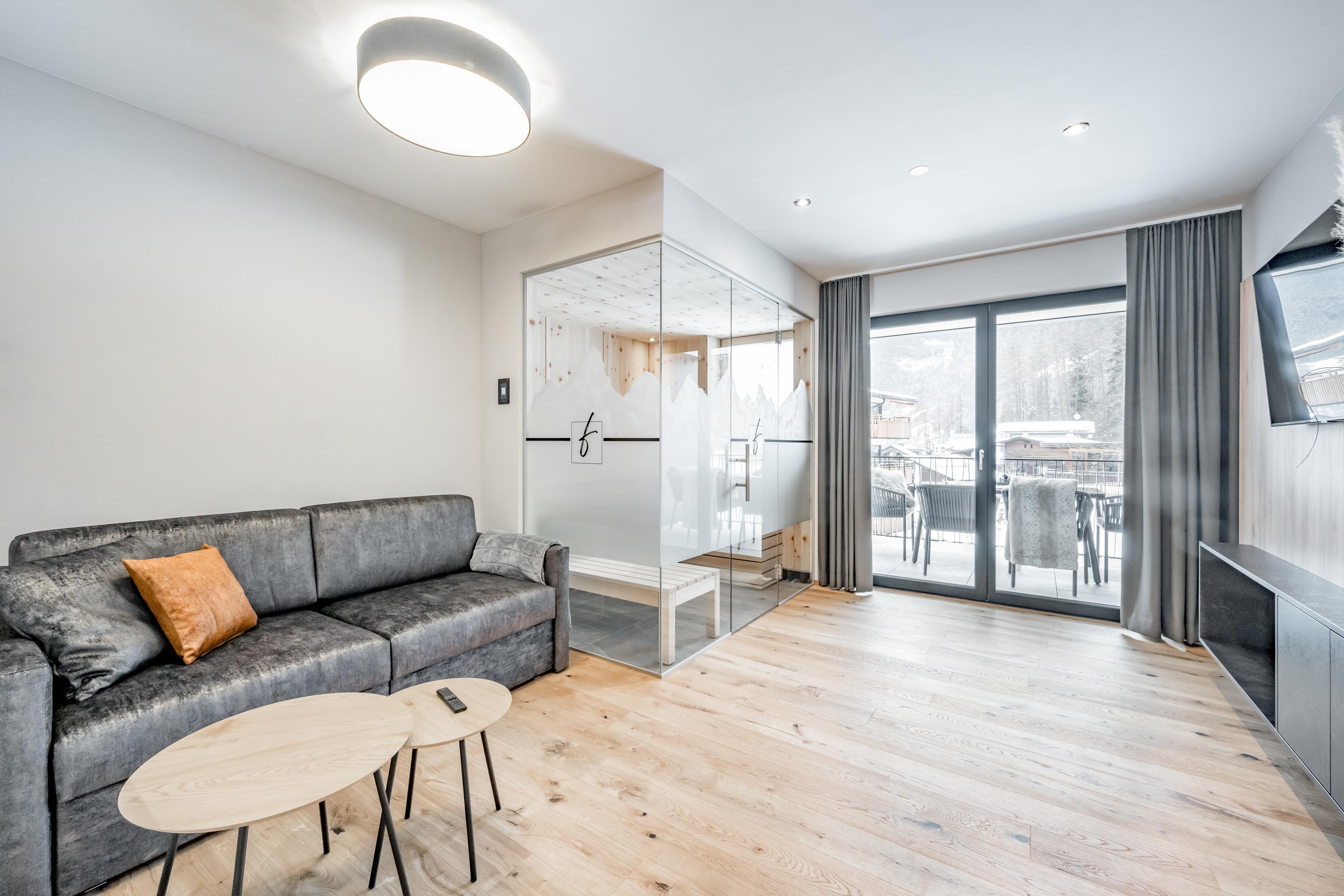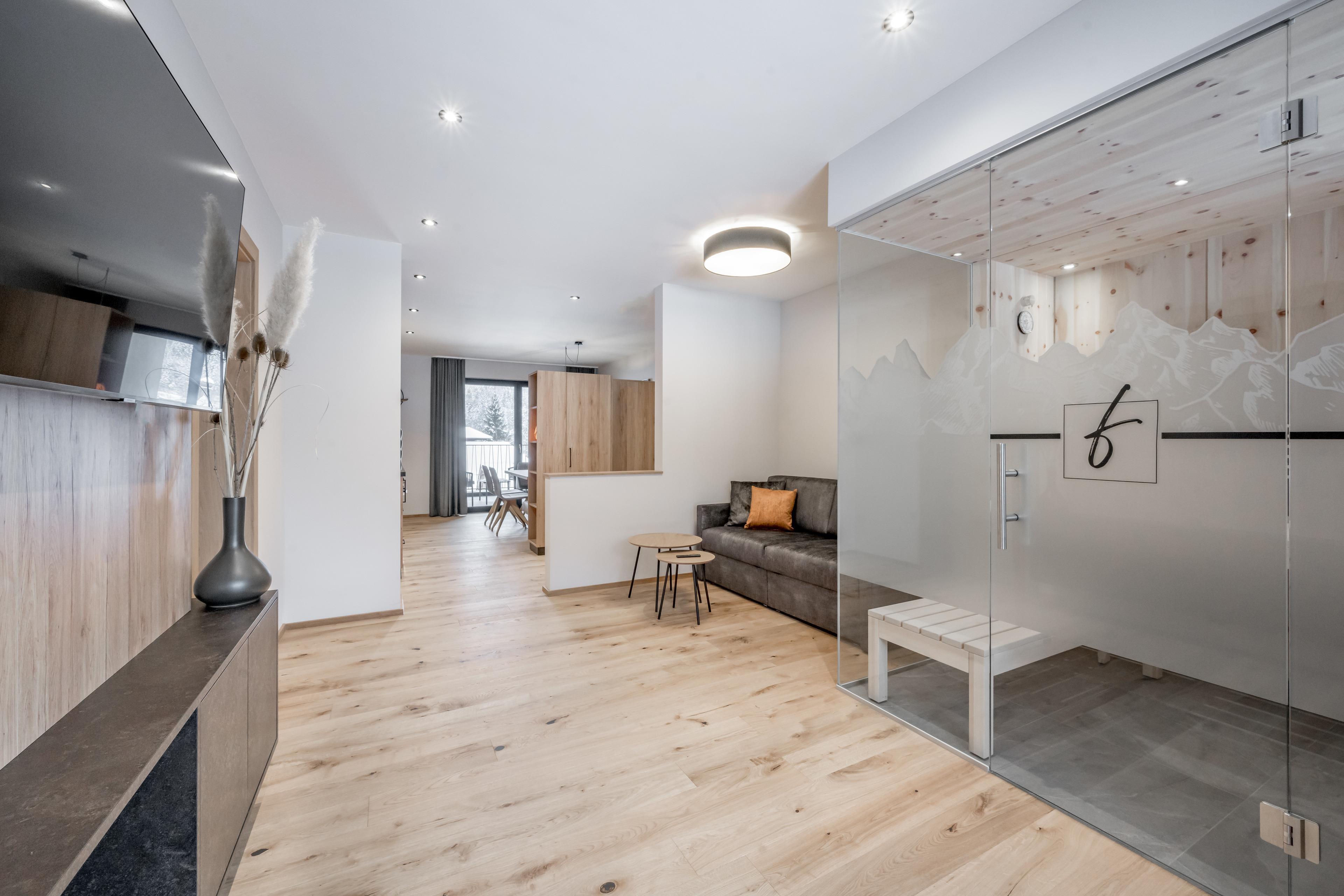 Apartment ? TWO im ersten Obergeschoß begeistert mit einem offenem Wohn-Ess-Kochbereich mit voll ausgestatteter Küche inkl. ausziehbarer Couch und einer vom Wohnbereich aus zugänglicher Zirbenholz-Sauna mit integriertem Infrarotstrahler. Es bietet zwei Schlafzimmer mit Doppel-Boxspringbetten und je einem großzügigen, modernen Badezimmer mit Dusche & WC. Das Apartment ist auch über den Personenaufzug erreichbar.