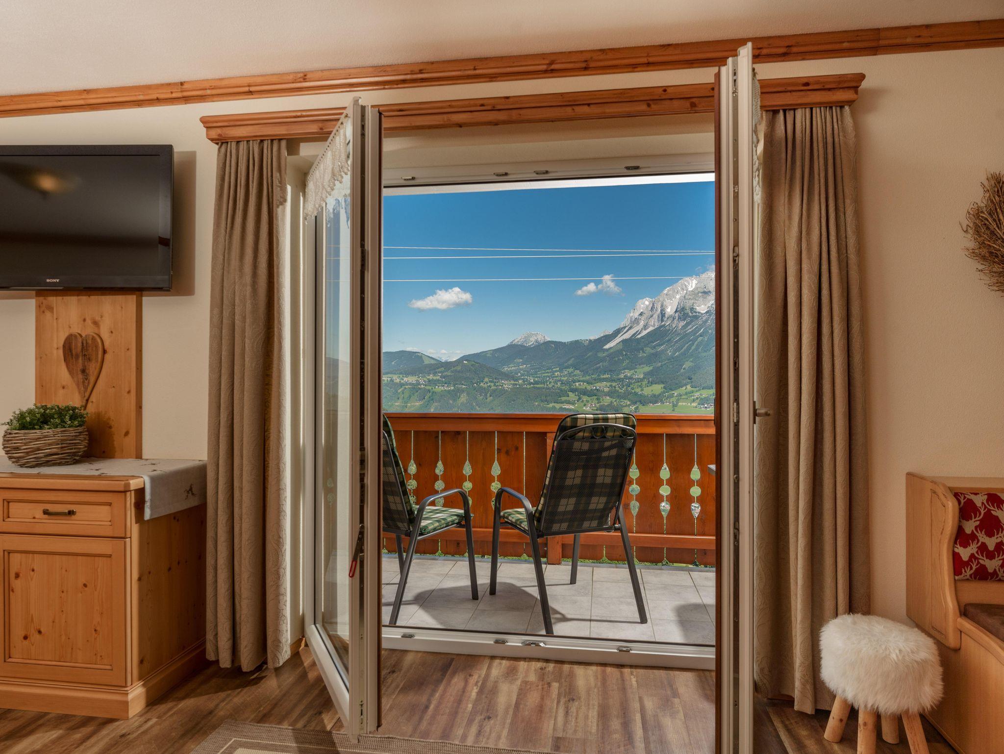 Umgeben von Wiesen und Wäldern in ruhiger, sonniger Lage auf 1.100 m Seehöhe wohnen Sie in unseren 5 neu errichteten Nichtraucher-Appartements. Wir bieten verschiedene Wohnungstypen für 2 bis 7 Personen an. Je nach Wohnungsgröße stehen Ihnen ein bis zwei getrennte Schlafzimmer zur Verfügung. Jedes Appartement hat zusätzlich ein Wohn-Schlafzimmer, eine voll ausgestattete Küche sowie Badezimmer mit Dusche und WC. Sat-TV und gratis W-Lan sind im Haus Taxegger selbstverständlich vorhanden. Was Sie aber ganz besonderes genießen werden, ist die faszinierende Aussicht vom Balkon der Appartements auf das Dachstein-Massiv.