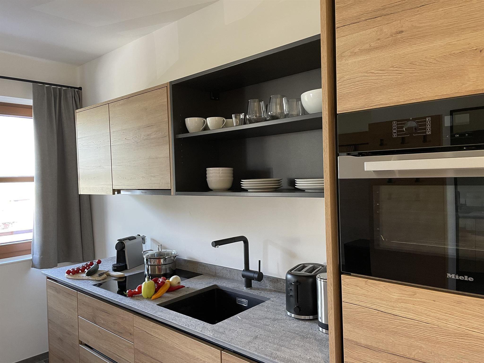 -Küche: Induktionsherd, Backofen, Kühlschrank mit Gefrierfach, Geschirrspüler, Toaster, Wasserkocher, Kochgeschirr, Nespresso Kaffeemaschine