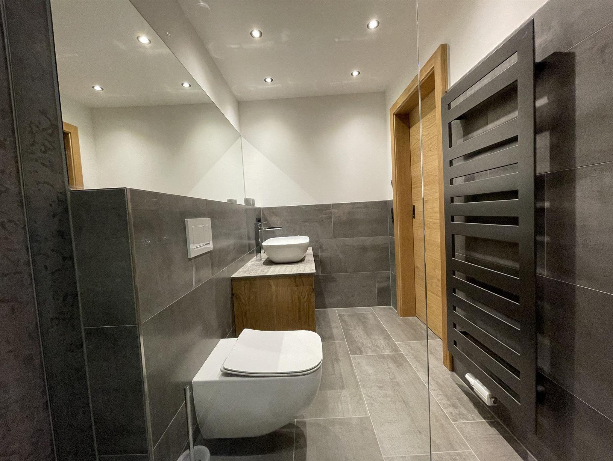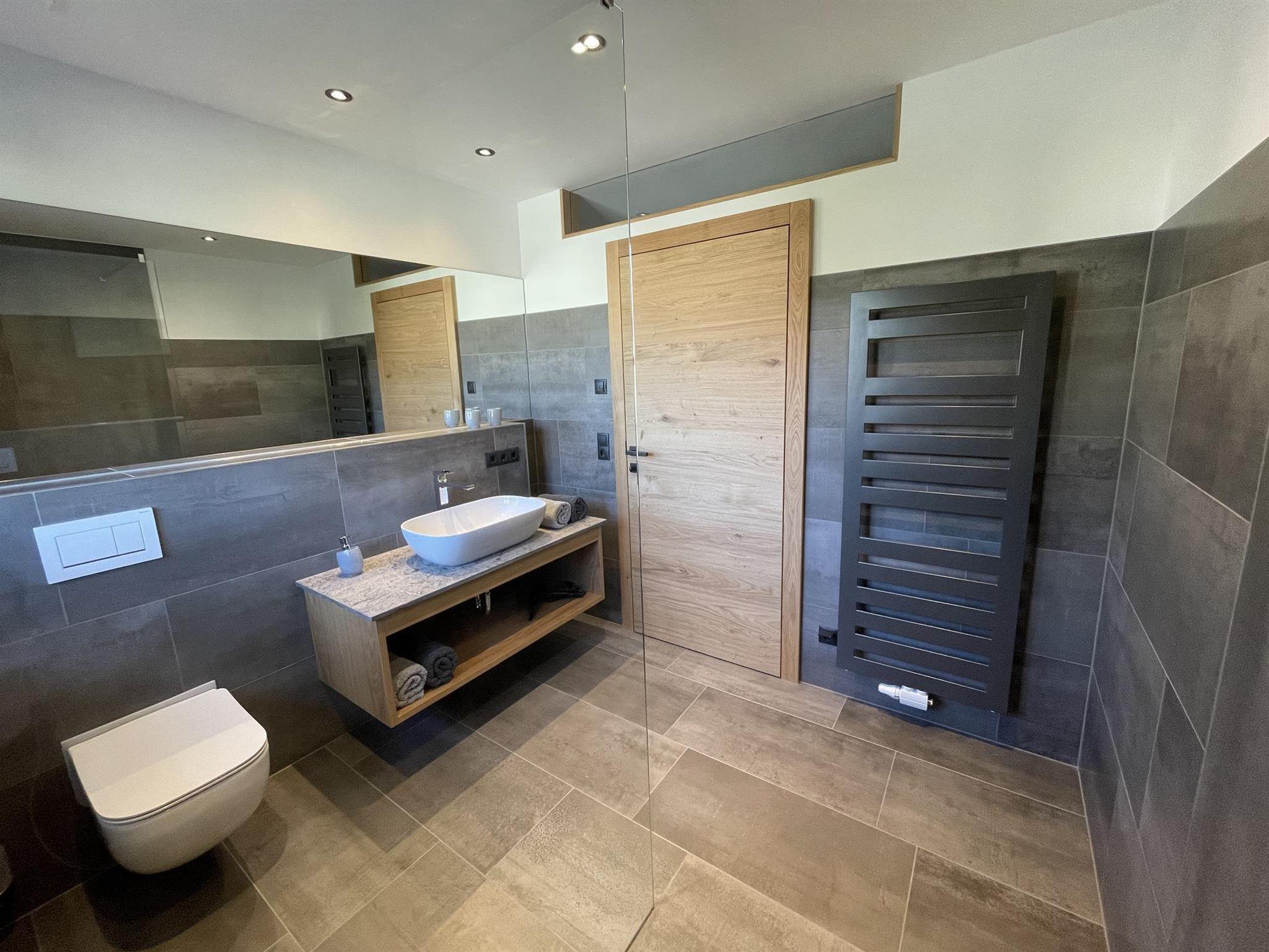-Badezimmer: Dusche, WC, Handtuchtrockner, Föhn, Handtücher