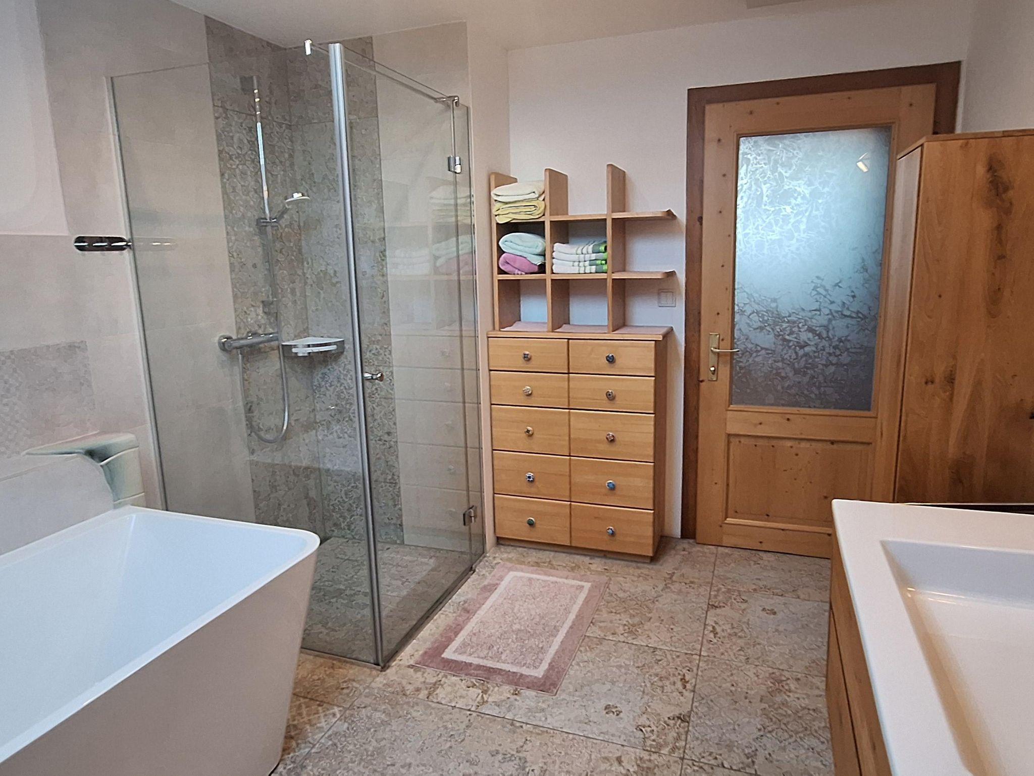 Unser Apartment Waltraud bietet auf 54 m² Platz für 2 bis 5 Personen. Die Ferienwohnung verfügt über 2 getrennte Schlafzimmer (1x Dreibettzimmer mit Doppel- und Einzelbett sowie 1x Doppelzimmer) und eine vollausgestattete Küche (E-Herd, Spülmaschine, Kaffeemaschine, Wasserwocher, Mikrowelle mit Backofenfunktion, etc.) mit Sitzecke und Sat-TV sowie ein Badezimmer mit Doppelwaschbecken, Badewanne, Dusche und WC. Kostenloses W-Lan im ganzen Appartement.