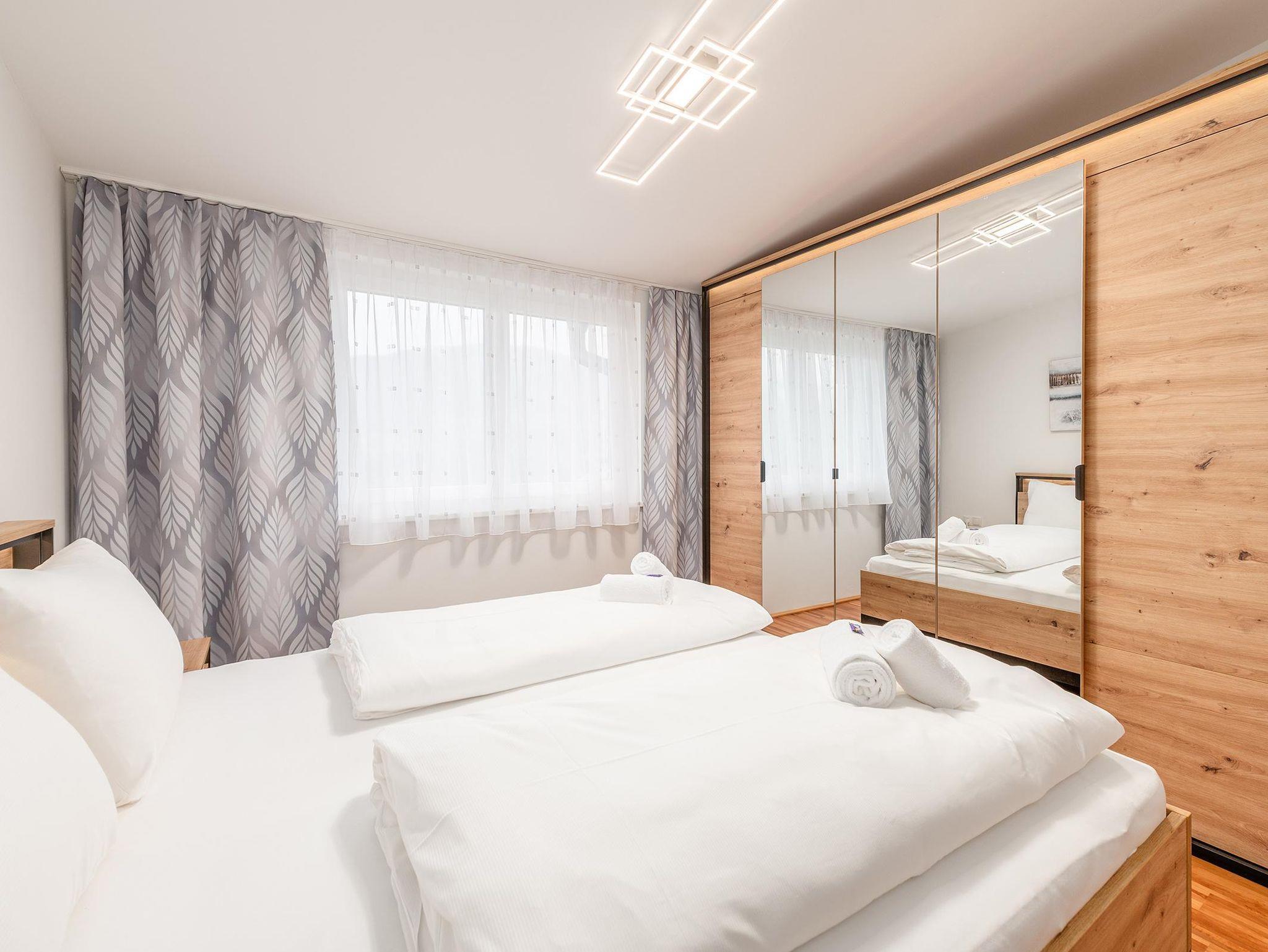 2 Schlafzimmer mit je einem Doppelbett sowie eine Schlafcouch für 2 weitere Personen im Wohnzimmer bieten insgesamt Platz für 6 Personen. Die voll ausgestattete Küche lädt zum gemeinsamen Kochen ein. Ein modernes Badezimmer mit Dusche sowie ein separates WC sorgen für zusätzlichen Komfort. Kostenfreie Parkmöglichkeiten stehen direkt beim Apartment zur Verfügung.
