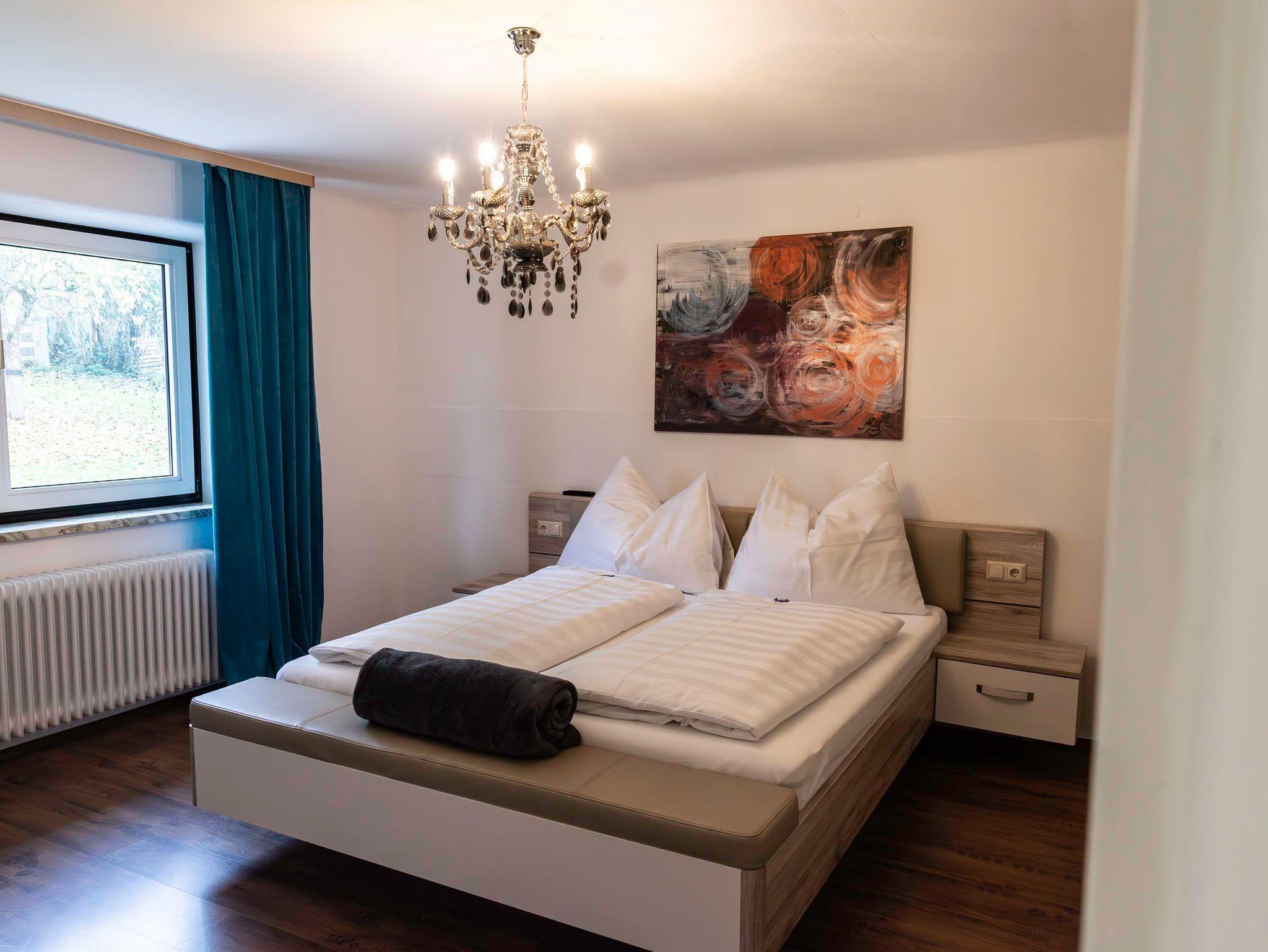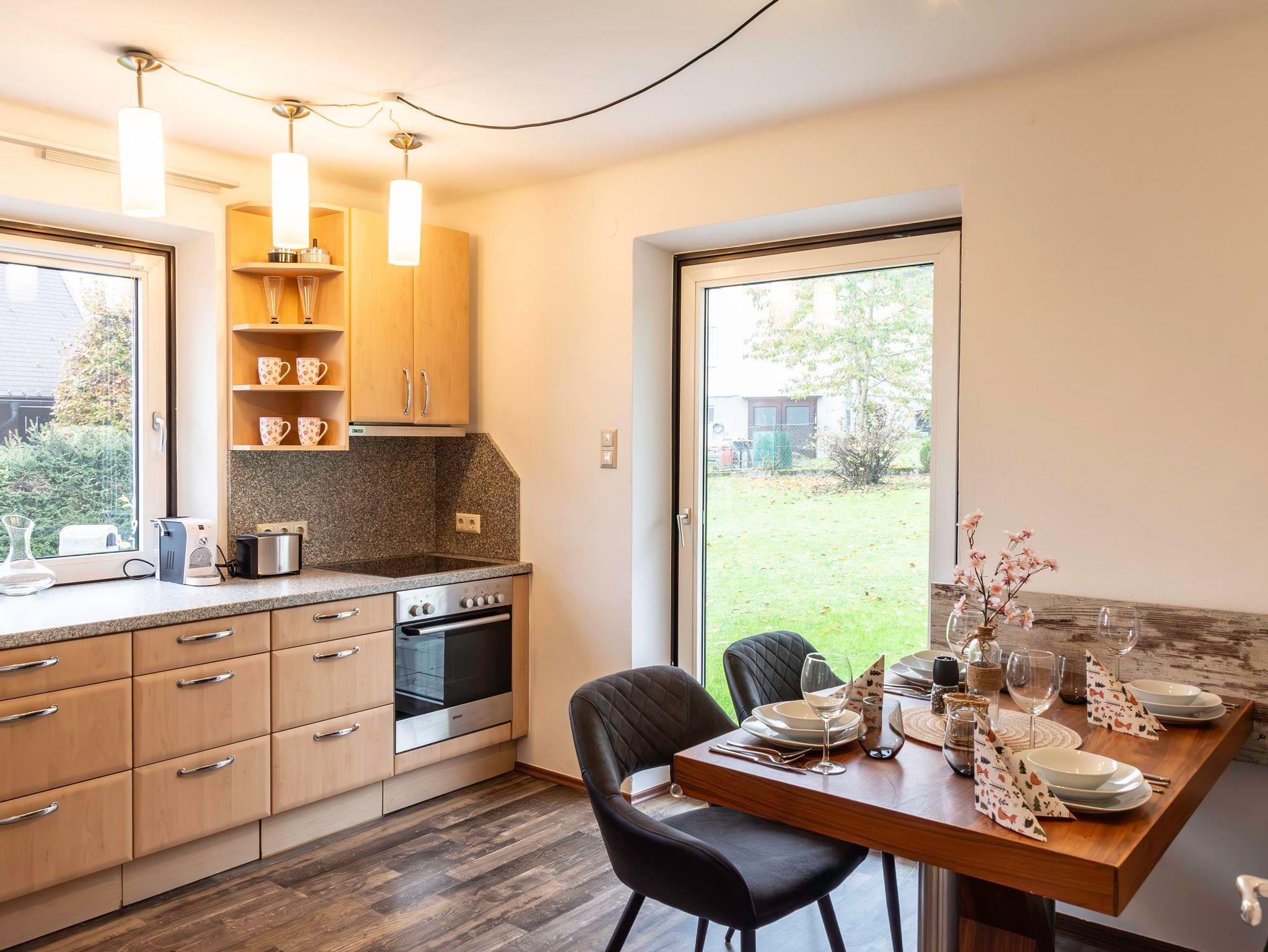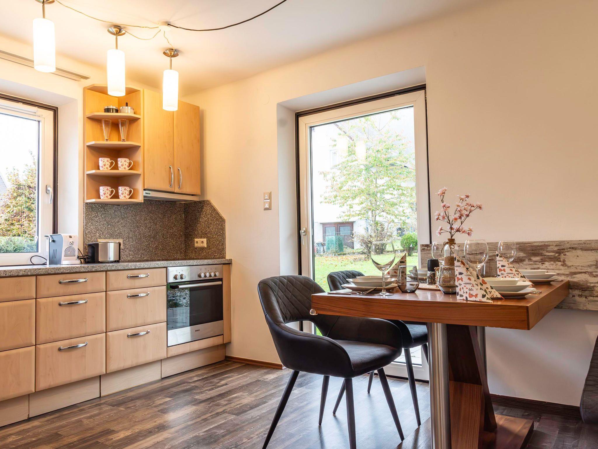 Unsere 60 m² großes Apartment 2 im EG bietet Platz für bis zu 4 Personen. Es verfügt über 2 getrennte Schlafzimmer (jeweils mit Flat-TV) und eine voll ausgestattete Küche mit gemütlicher Essecke. Die Wohnung verfügt außerdem über ein Badezimmer mit großer Dusche und WC. Außerdem gibt es einen direkten Zugang ins Grüne. Eine große Terrasse mit Essgruppe und ein riesiger Garten mit Grill, laden zum Verweilen ein.