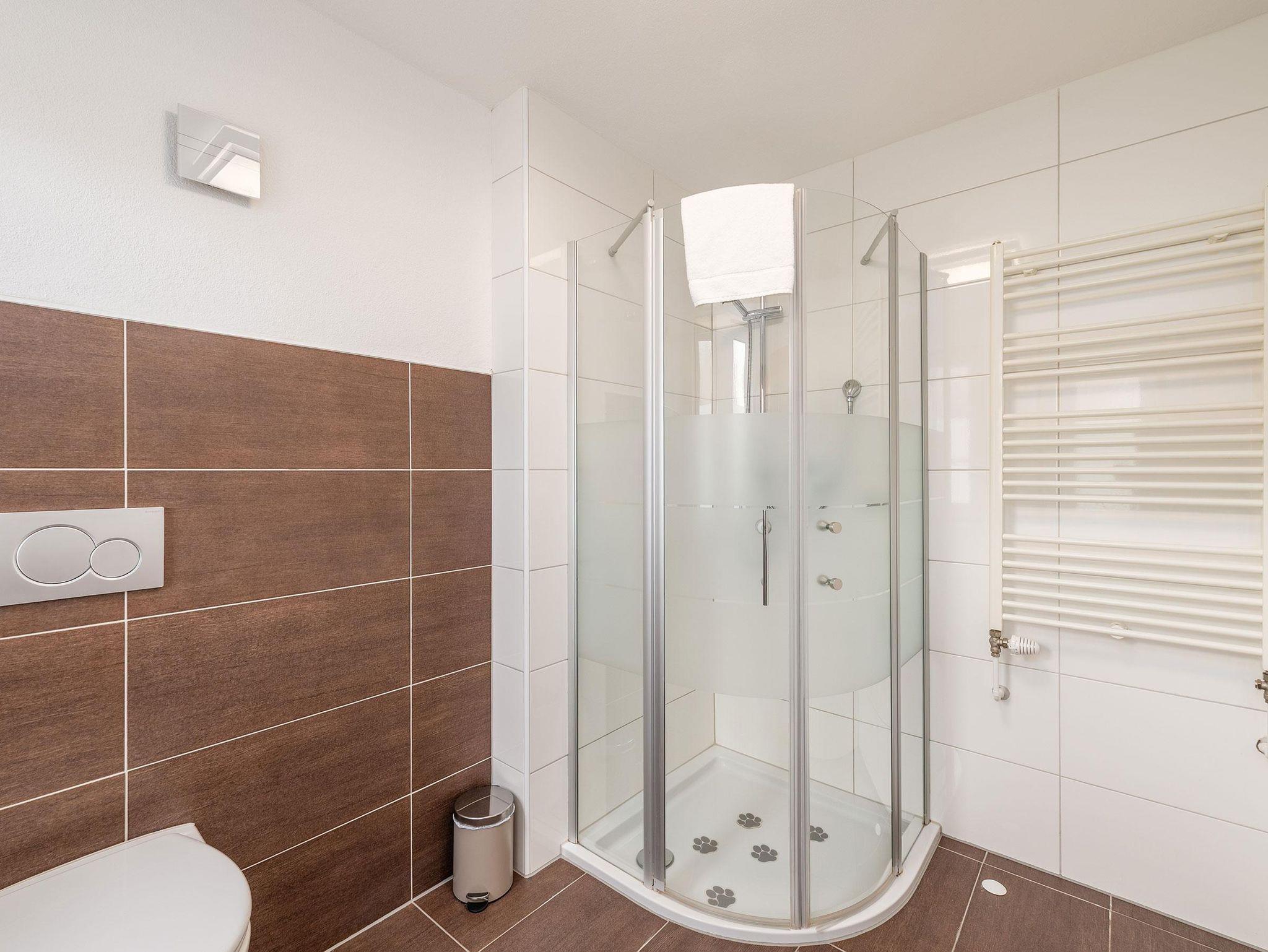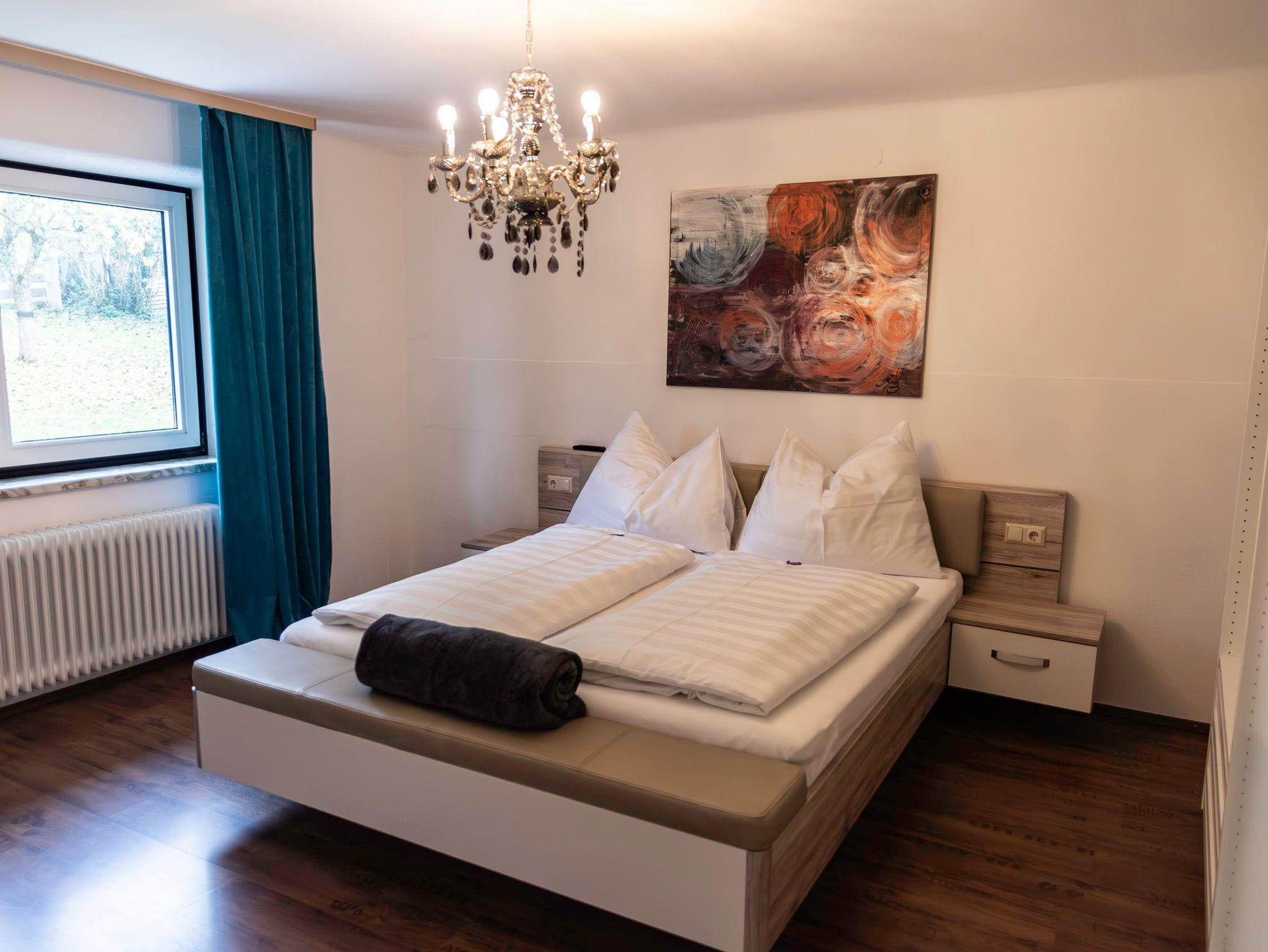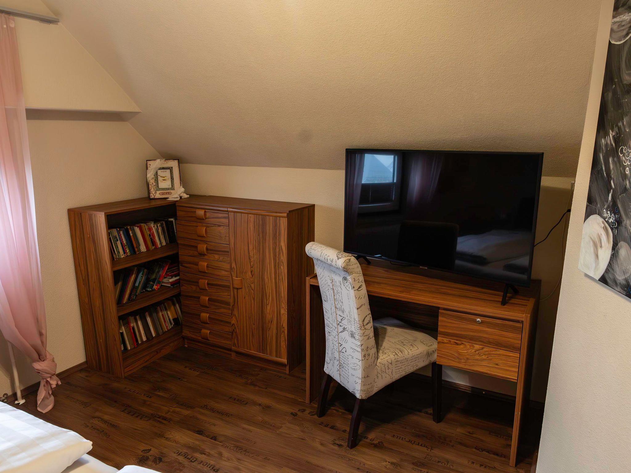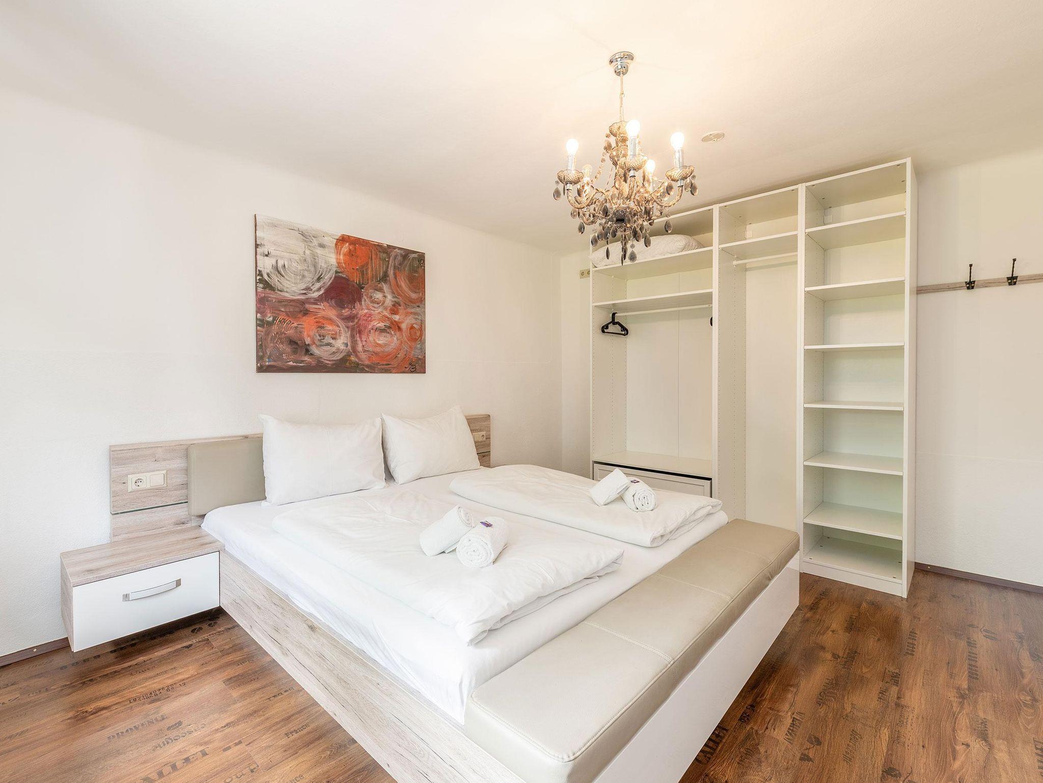 Unsere 60 m² großes Apartment 1 im Erdgeschoss bietet Platz für bis zu 4 Personen. Sie verfügt über 2 getrennte Schlafzimmer (jeweils mit Flat-TV) und eine voll ausgestattete Küche mit gemütlicher Essecke. Die Wohnung verfügt außerdem über ein Badezimmer mit großer Dusche und WC.