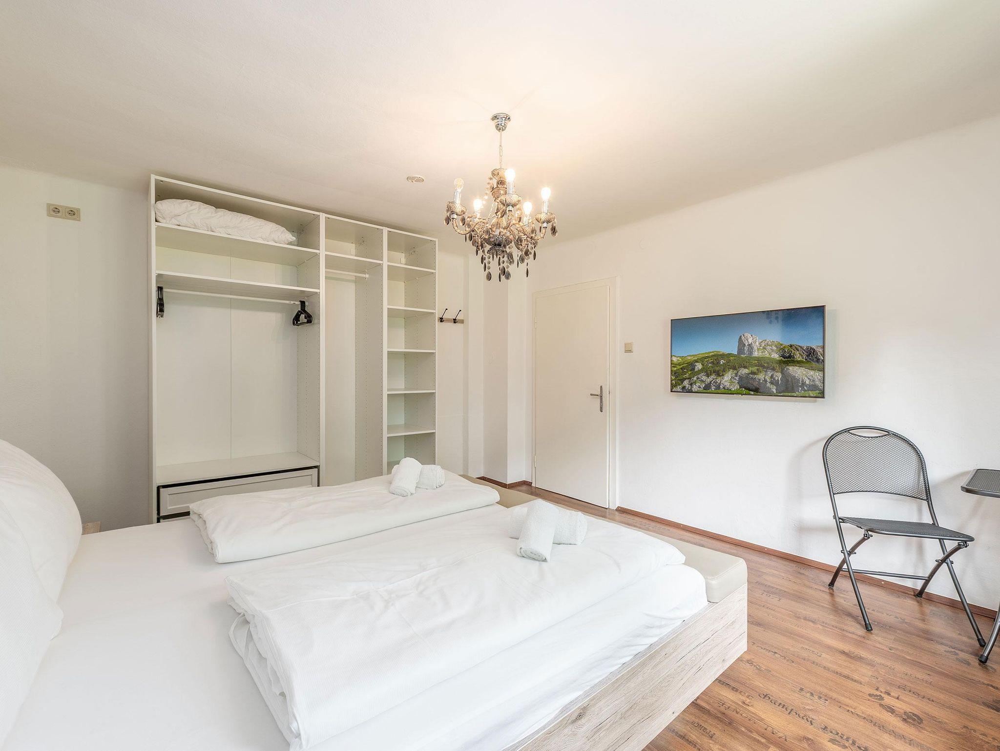 Unsere 90 m² großes Apartment 1 im Obergeschoss bietet Platz für bis zu 6 Personen. Es verfügt über 3 getrennte Schlafzimmer (jeweils mit Flat-TV) und eine voll ausgestattete Küche mit gemütlicher Essecke. Zwei der Schlafzimmer befinden sich auf einer Ebene, das dritte Schlafzimmer erreicht man über eine Treppe. Die Wohnung verfügt außerdem über ein Badezimmer mit großer Dusche und Blick auf das Dachstein-Massiv. Das WC ist separat. Der kleine Balkon mit Sitzgelegenheit, erreichbar über die Küche, bietet einen Blick in unseren schönen Garten.