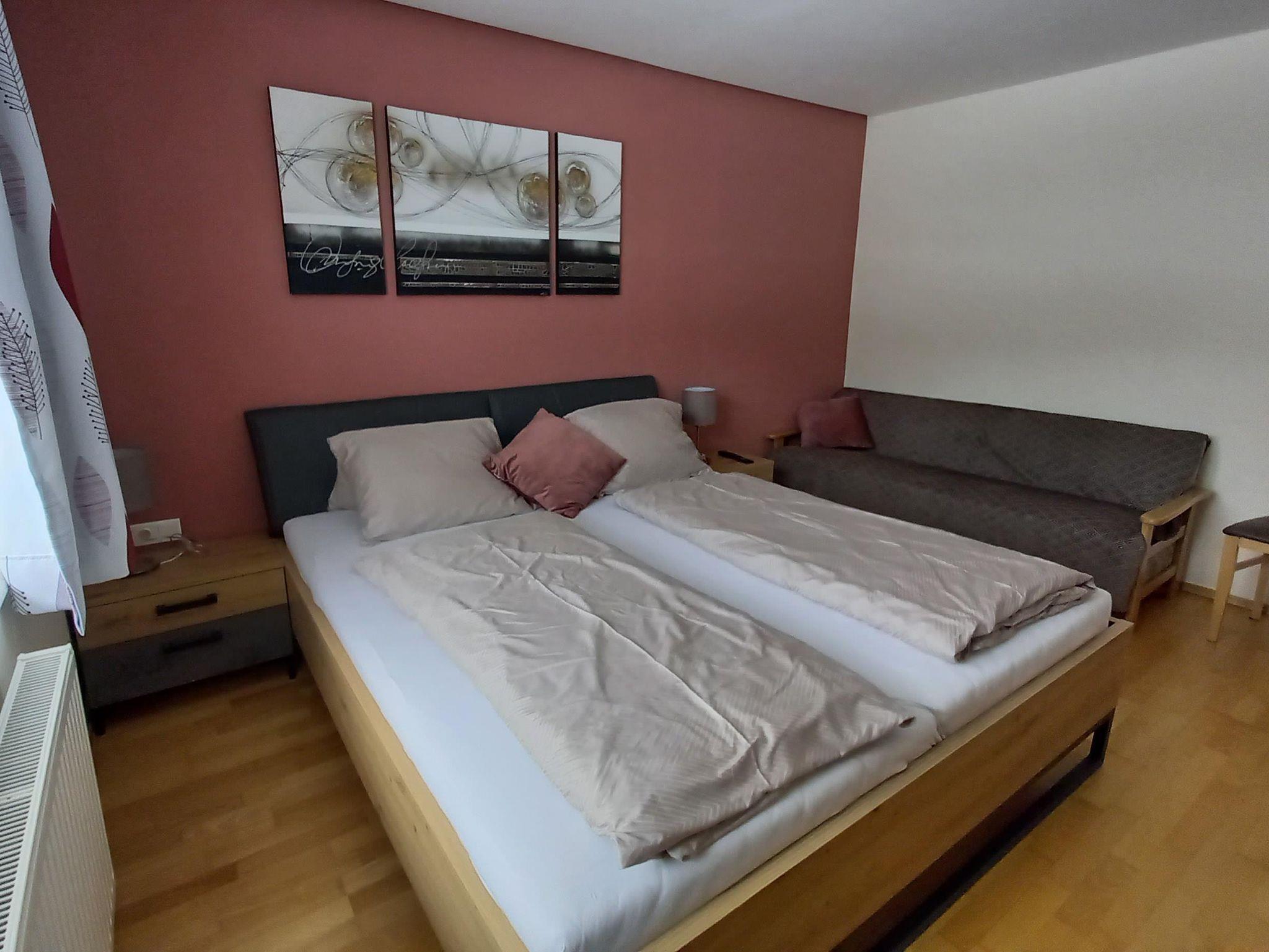 Modern eingerichtete Ferienwohnung (ca. 65 m²) verfügt über 1 Schlafzimmer, Wohn-Schlafraum mit ausziehbarer Couch, für 4-5 Personen, großer Küche, Bad mit Dusche/WC und Balkon. TV, Bett- und Tischwäsche sowie Handtücher