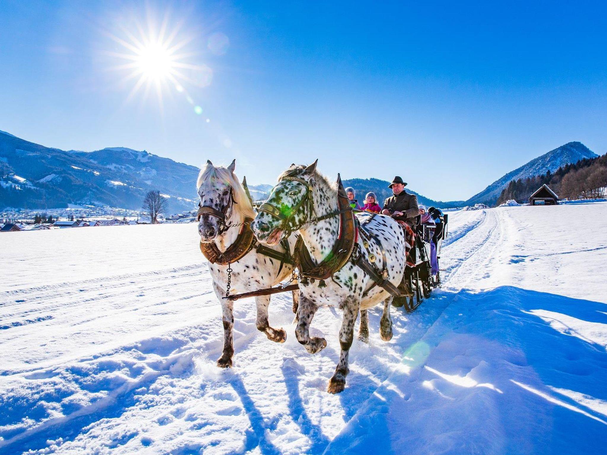 Wintersportbegeisterte kommen bei uns ebenfalls voll auf ihre Kosten. Nur 7 Autominuten von unserer Ferienwohnung Madelaine entfernt befindet sich der östliche Ersteinstieg in die Schladminger 4-Berge-Skischaukel – unser Skiberg Hauser Kaibling. Für Langlauffreunde empfehlen wir Ramsau am Dachstein, dieses Sonnenplateau ist in 10 Autominuten erreichbar. Winterwanderungen und Pferdeschlittenfahrten können ab unserem Haus unternommen werden. Im näheren Umkreis finden Sie zudem noch die Rodelbahnen auf der Hochwurzen (Rohrmoos) und Galsterberg (Pruggern). Sie sehen, auch im Winter ist für viel Abwechslung gesorgt in der heimischen Bergwelt der Schladminger Tauern und des Dachstein Massivs.