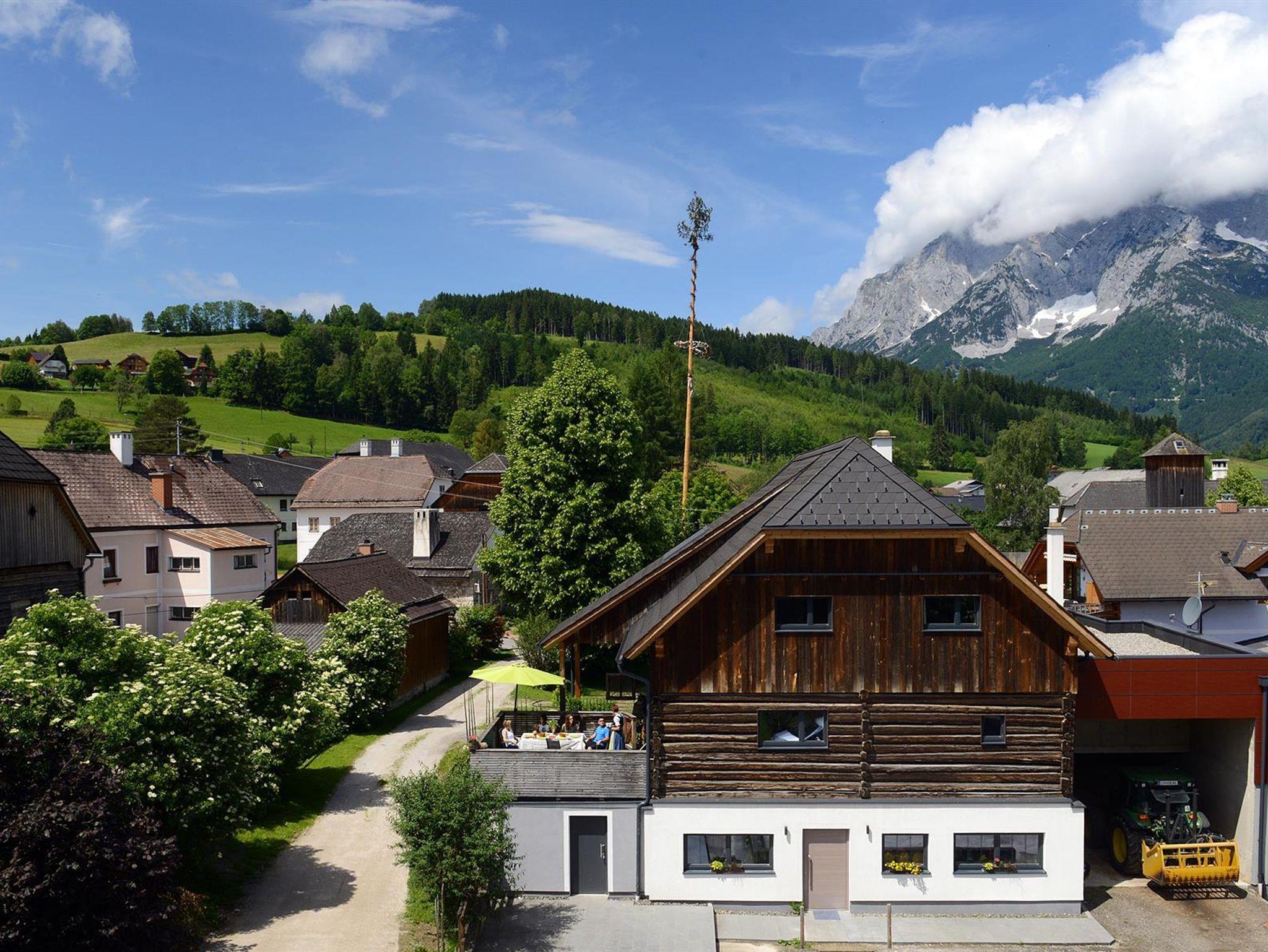 Ein Blick aus dem Fenster und man sieht weite Wiesen, grasende Kühe und in der Ferne den herausragenden Kirchturm von Irdning.