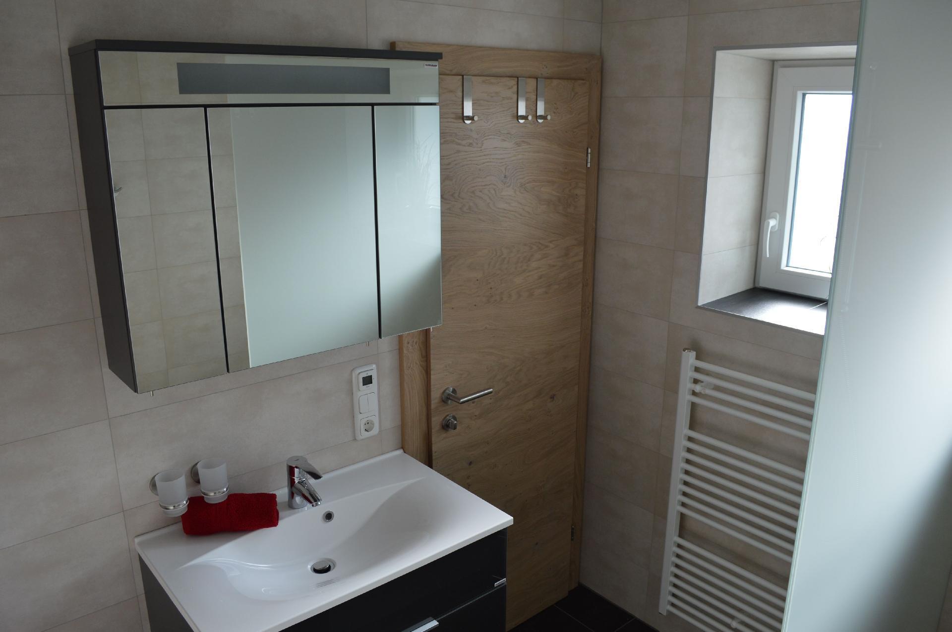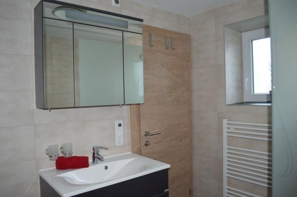 In this bright holiday flat, two bedrooms, a living, dining and cooking area, a bathroom and a separate WC branch off from the hallway. The entire living area of 65 m² is pleasantly heated by underfloor heating. In the first bedroom you sleep in a double bed measuring 180 cm x 200 cm, which is surrounded by two bedside tables on both sides. The second bedroom is furnished in the same way, but also has a single bed measuring 90 cm x 200 cm. Wardrobes for storing your travelling wardrobe are available in both rooms. The heart of the flat is the cosy living area with integrated kitchen-diner. Take a seat on the corner sofa to relax after a day out. The wall-mounted flat-screen TV with satellite TV provides entertainment in the evening. The fully equipped kitchenette allows you to cook for yourself with a dishwasher, a fridge with freezer compartment, a four-zone ceramic hob with oven and the usual small electrical appliances such as a coffee machine, kettle, microwave and toaster. The dining table invites you to enjoy a meal together on the comfortable leather corner bench with three swivel chairs. The daylight bathroom is equipped with a vanity unit with mirror cabinet, a towel dryer, a walk-in shower with shower partition and a bathtub. The separate WC has a window and a wash hand basin.