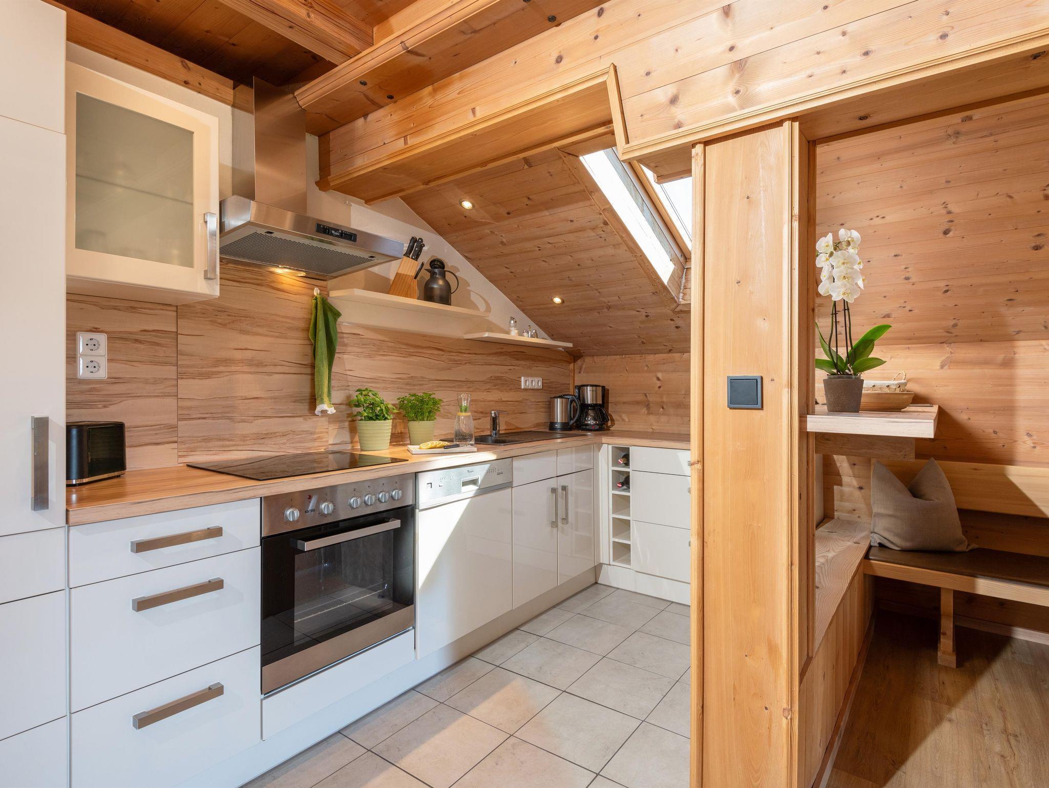 Das Kaminstüberl mit 47 m² befindet sich im 2. Obergeschoss unseres Bauernhofes. Das Studio bietet Platz für bis zu 4 Personen - Wohn- und Schlafraum mit Doppelbett und einem Schlafsofa 170 cm breit. Unsere gut ausgestattete Küche mit gemütlicher Sitzecke verfügt über einen Elektroherd, Mikrowelle, Kühlschrank, Toaster, Geschirrspüler, Wasserkocher, Filterkaffeemaschine, Hand- und Stabmixer sowie ausreichend Geschirr, Töpfe, Pfannen und Geschirrtücher.