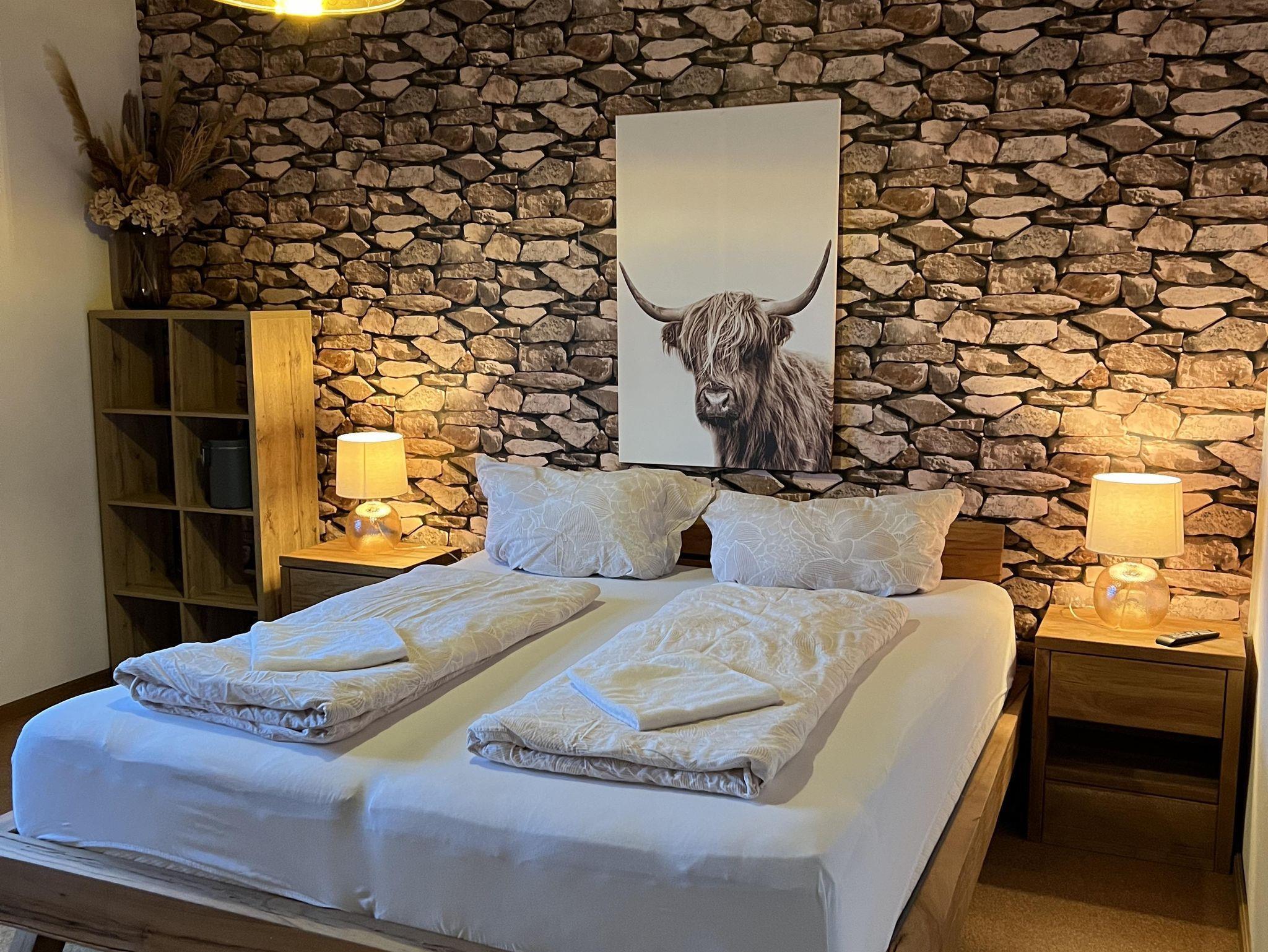 Doppelbettzimmer mit eigenem Bad mit Dusche und WC, Sat TV und WLAN. Im Preis inbegriffen ist Frühstück. WLAN ist gratis