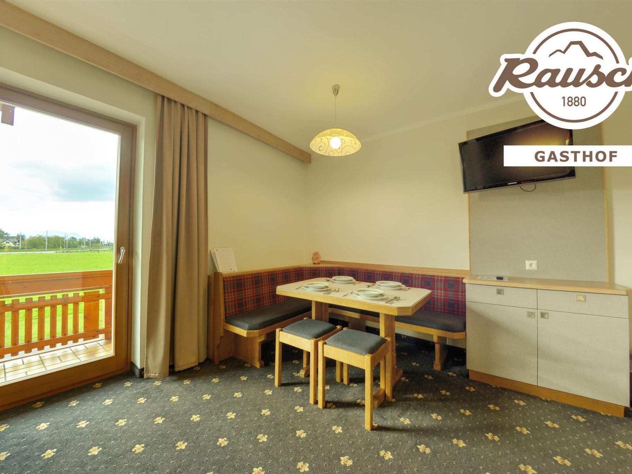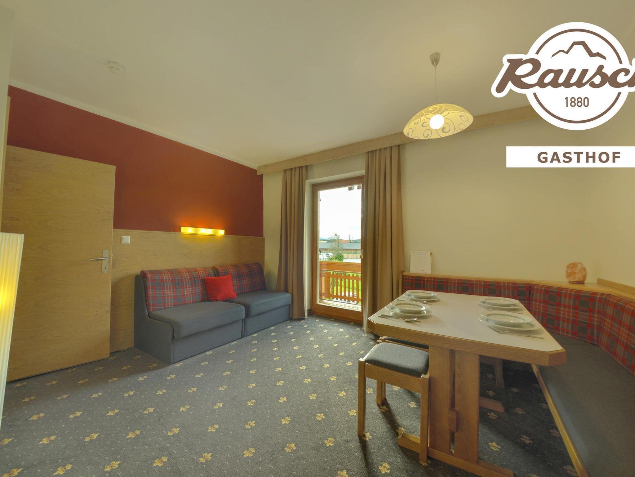 Unsere Ferienwohnung A verfügt über 2 separate Doppelzimmer mit Balkon, 1 Wohnschlafraum mit 2 Ausziehcouchen, Balkon, eine Kochnische, Essecke, Safe, Sat-TV mit Radio, Vorraum, Badezimmer mit Dusche - WC und Fön. Am Balkon steht auch eine Sitzgelegenheit zur Verfügung. Alle Mahlzeiten werden im Gasthof eingenommen.