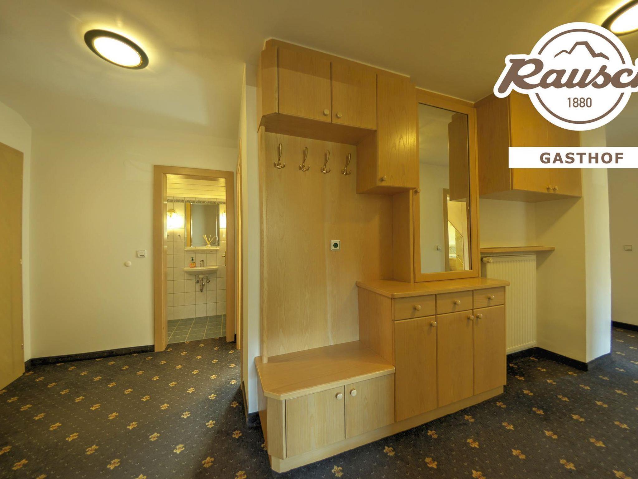 Unsere Ferienwohnung D verfügt über 2 Doppelzimmer (1 x mit Balkon), 1 Wohnschlafraum mit 2 Ausziecouchen und Balkon, Sat - TV mit Radio, eine moderne Küche mit Backofen, Geschirrspüler und Mikrowelle, einen großen Vorraum, ein Badezimmer mit Dusche und Badewanne, Fön und 1 getrenntes WC. Am Balkon steht auch eine Sitzgelegenheit zur Verfügung. Alle Mahlzeiten werden im Gasthof eingenommen.