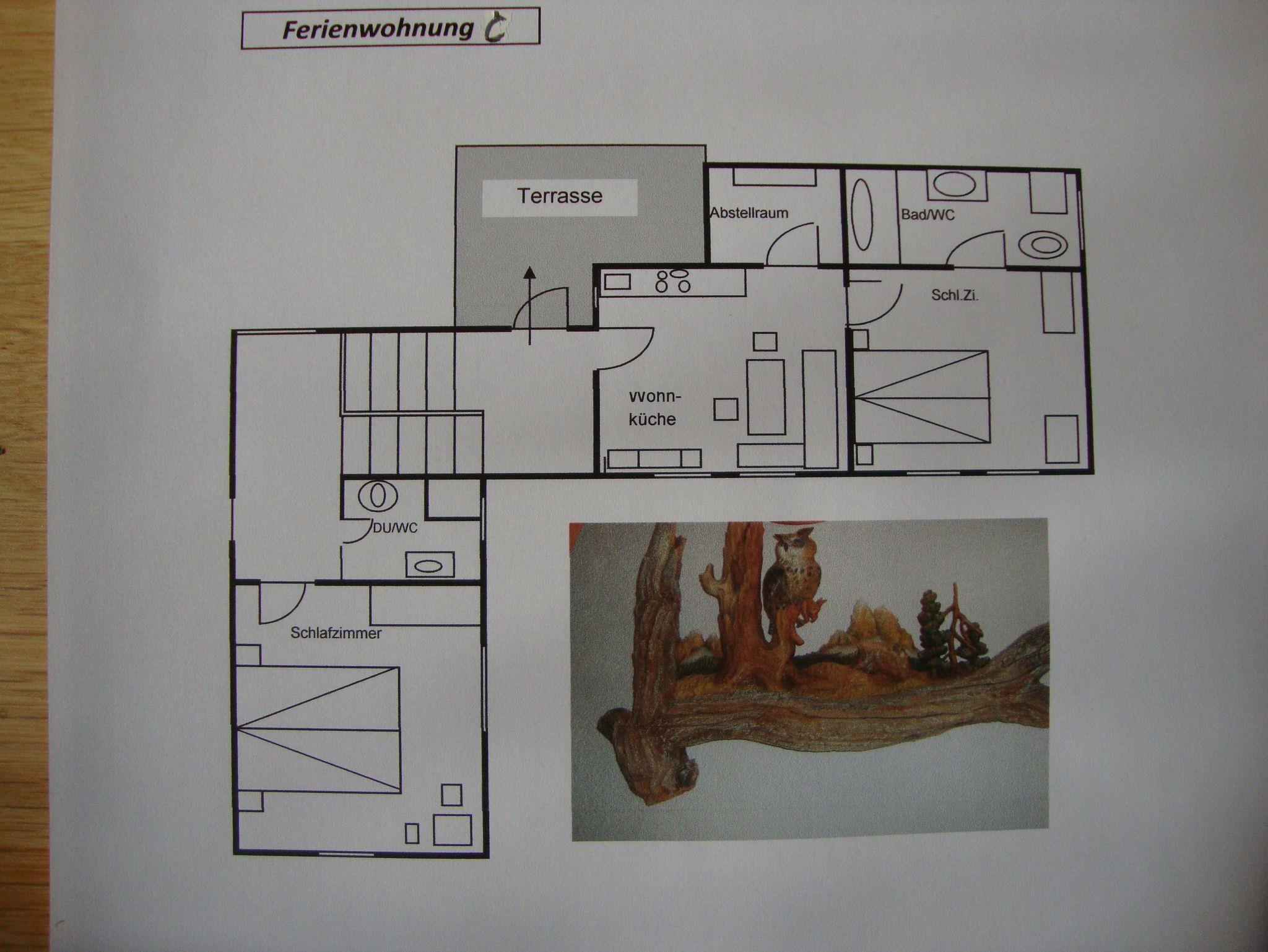 gemütl.Wohnküche, perfekt ausgestattet, 1 D/bettzi.mit Bad/WC, 1 D/bettzi.mit DU/WC (dieses Zi.liegt eine halbe Etage höher, ist nicht in die Wohnung integriert. Preis für 2 Pers. ab 60 €.