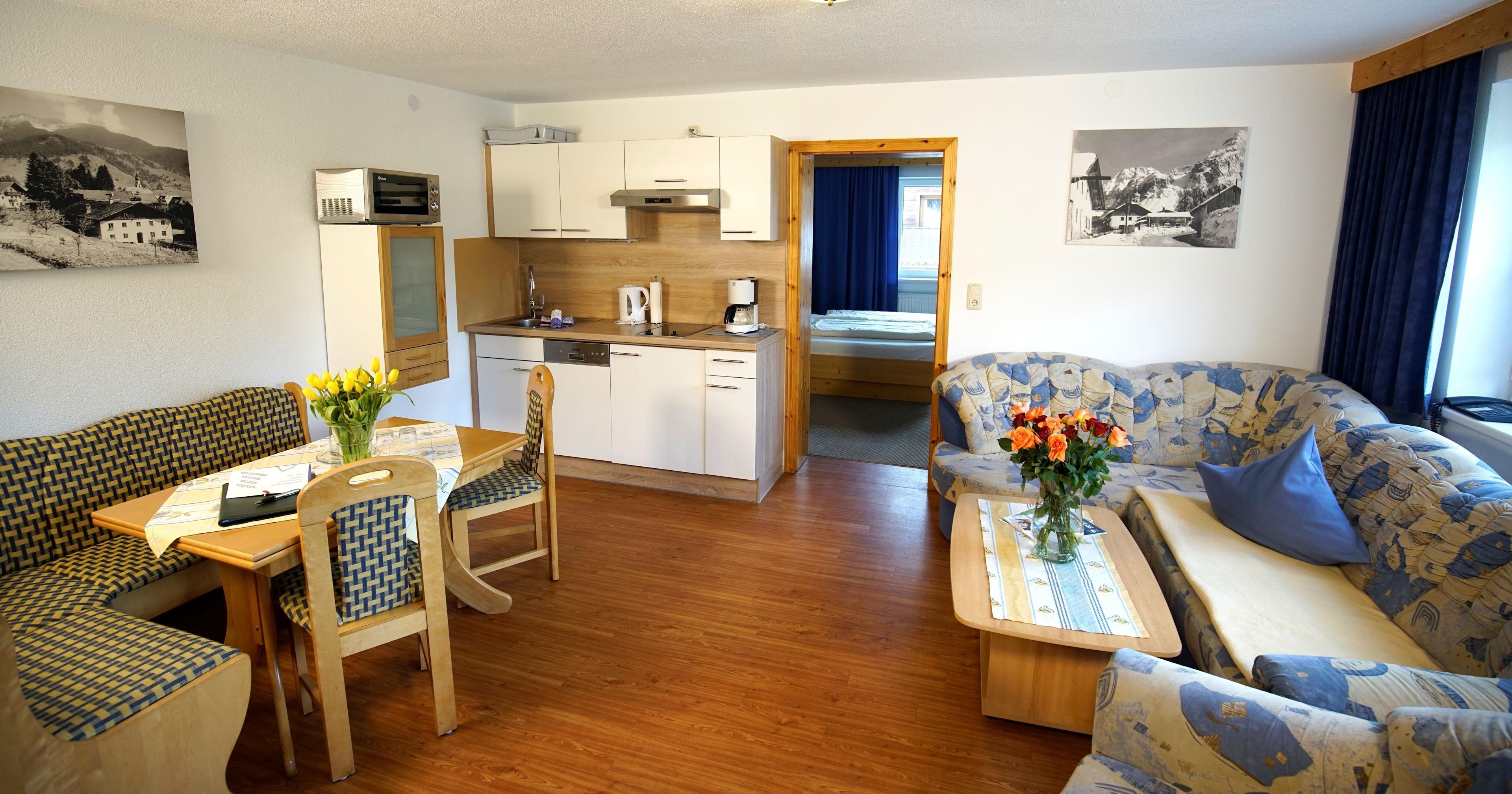 Wohnung Grubigstein für 1-3 Personen. Die Ferienwohnung hat einen Schlafraum mit Doppelbett und einen getrennten Wohnraum mit Kochgelegenheit. Balkon. Dusche-WC.
