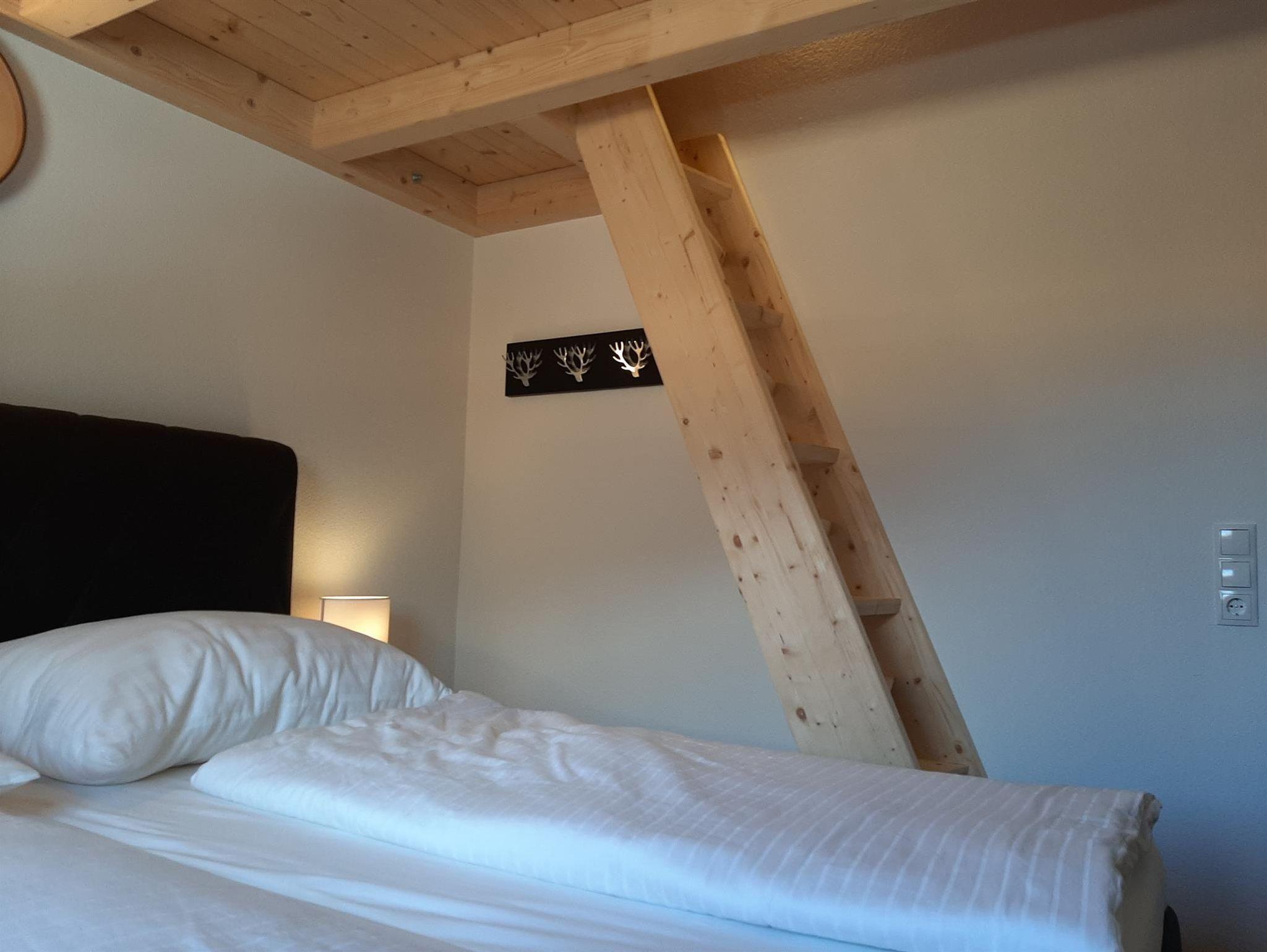 Haus Wirklich Wunderbar Das Chalet erstreckt sich über zwei Etagen, wobei der eigentliche Wohnbereich im Obergeschoss liegt. Hier sorgt der offene Sichtdachstuhl für lichtdurchflutete Räume.