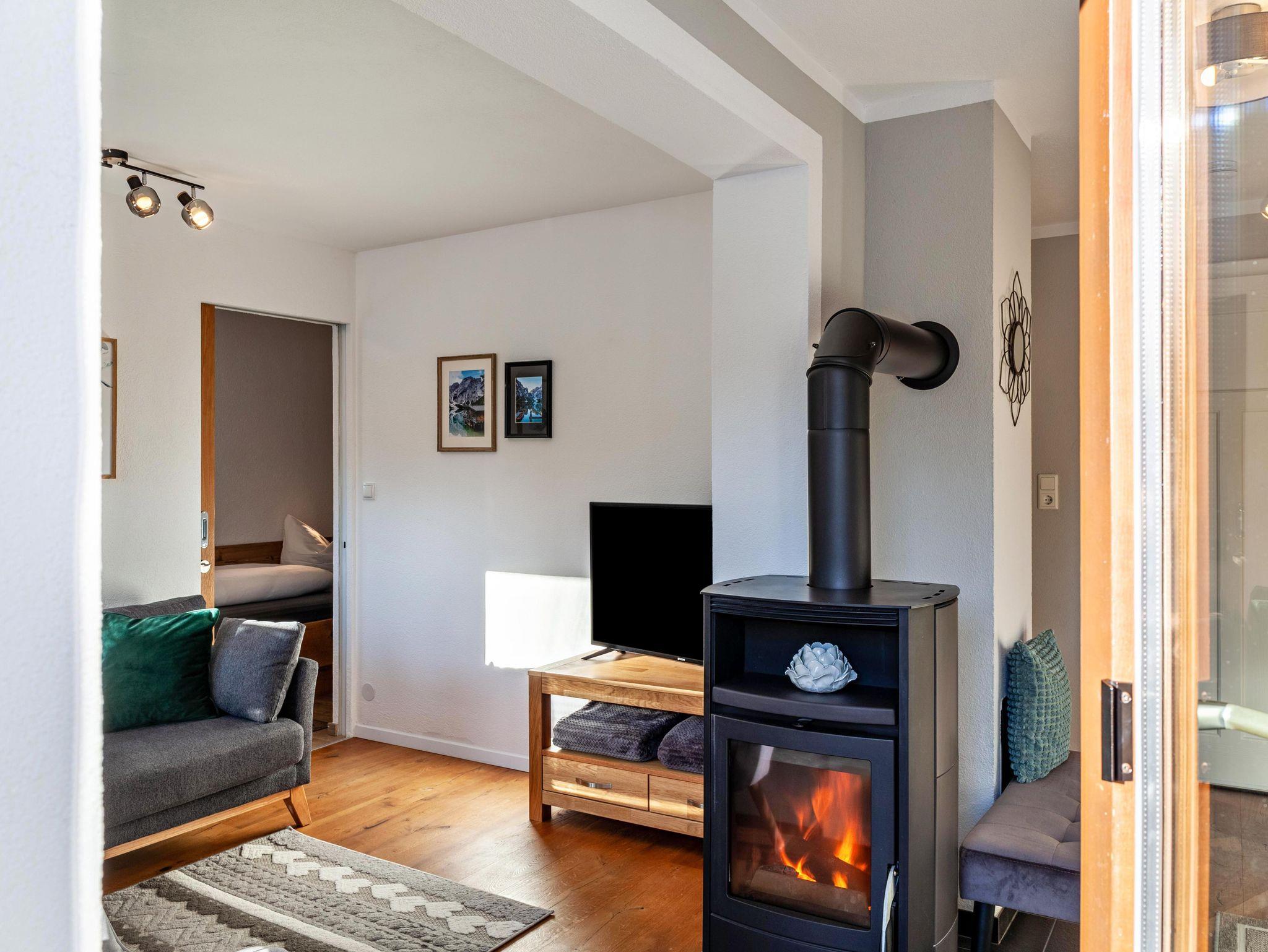 -Wohnzimmer mit Sofa, Ohrensessel und Kaminofen