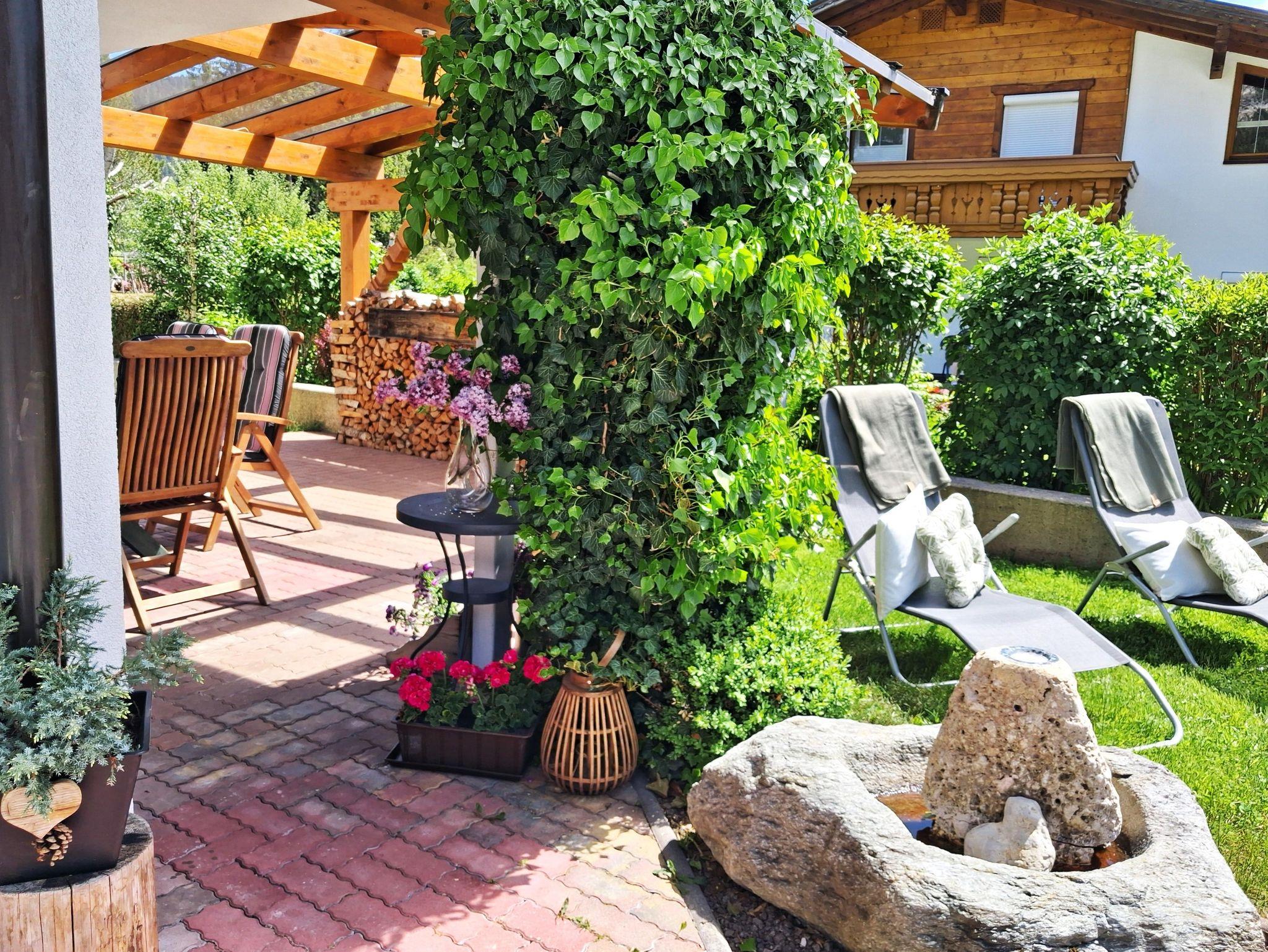 Wohnzimmer mit Kachelofen,TV, Internet, ein großes Bad mit Dusche und Badewanne, ein separates Gäste-WC, sonnige Terrasse und Garten mit Blick auf die umliegenden Berge, Hohe Munde und Gehrenspitze.