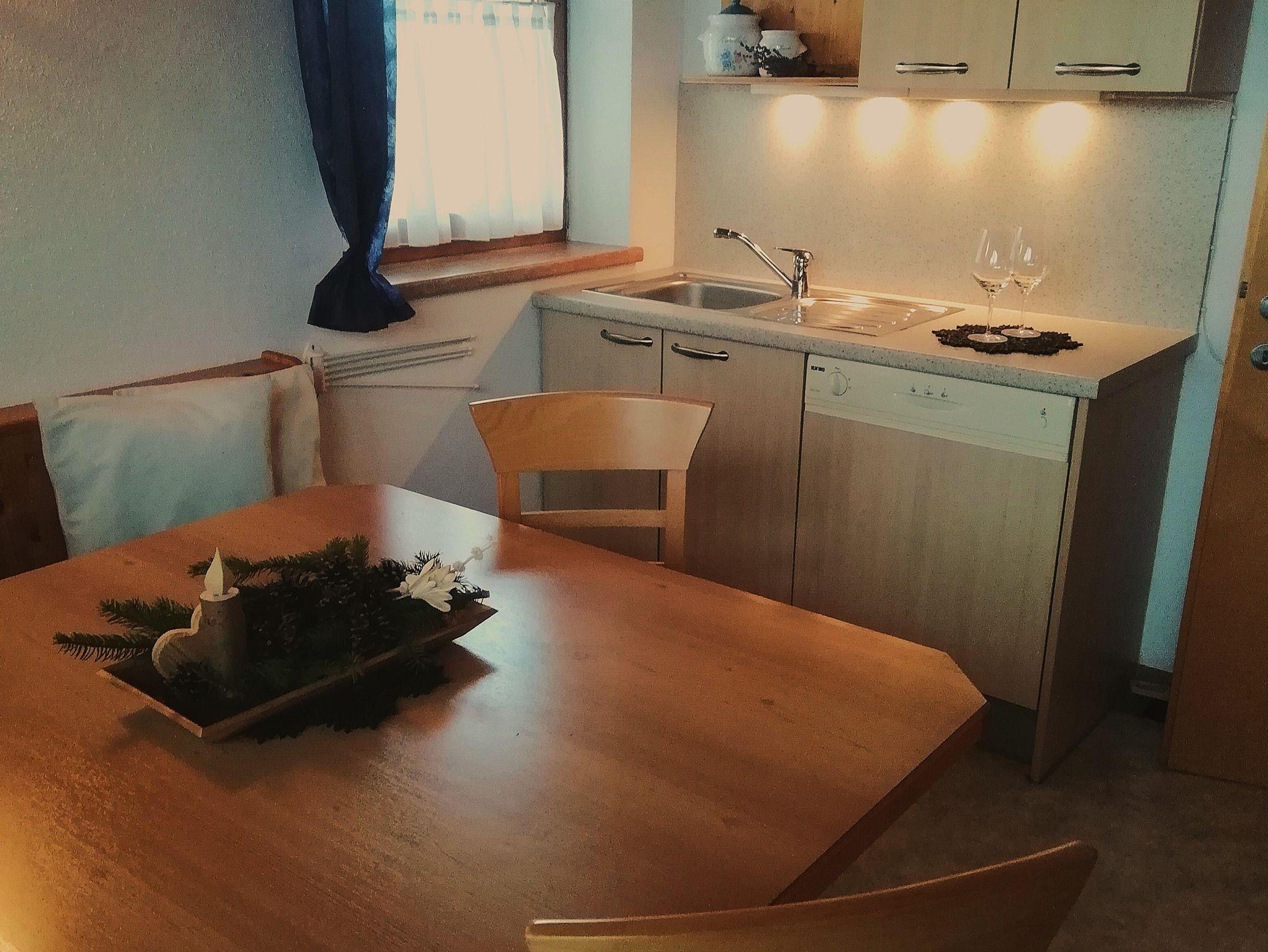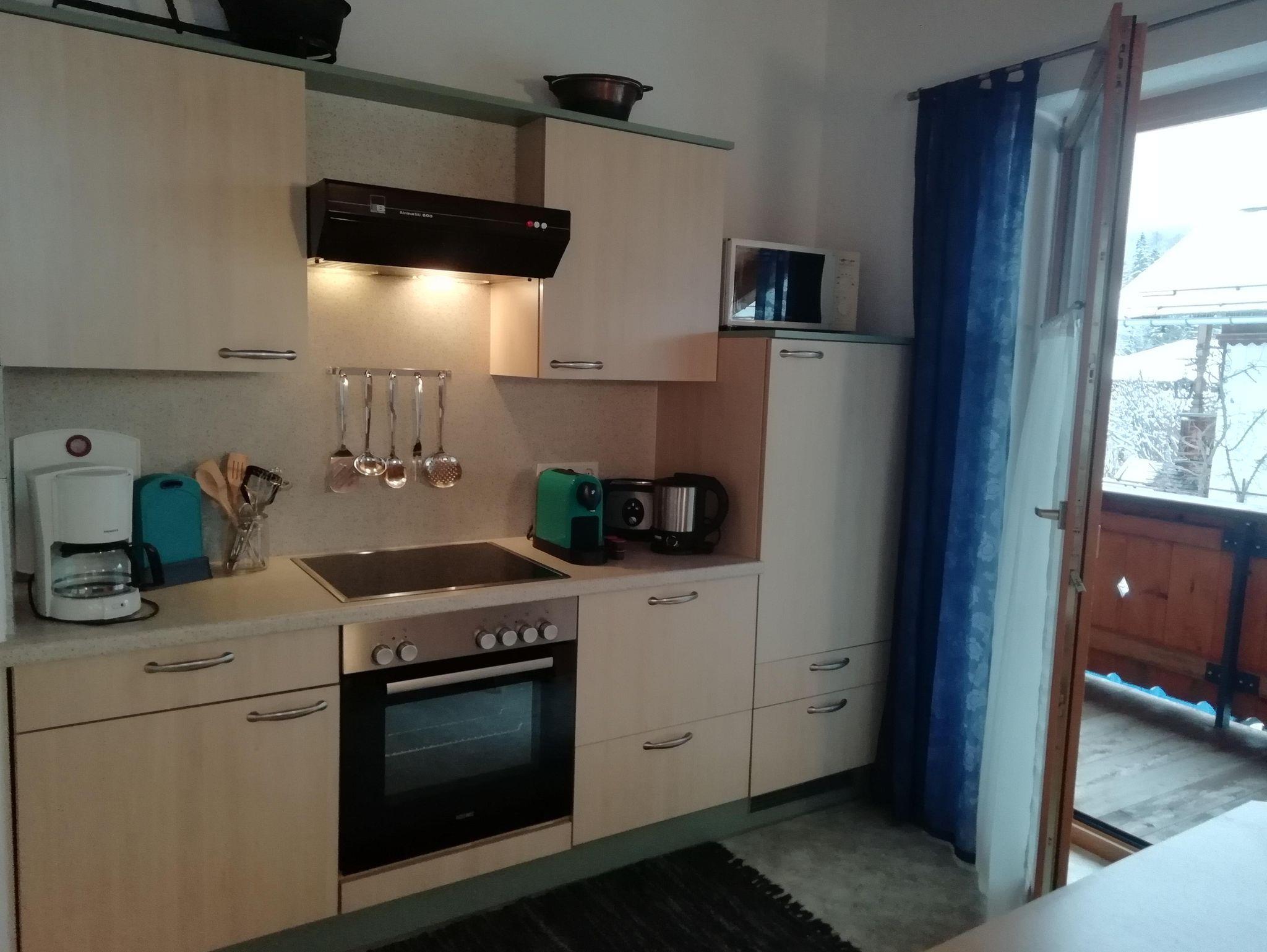 Küche: Tabs und Filterkaffeemaschine, Wasserkocher, Toaster, Geschirrspülmaschine, E-Herd mit Backofen, Zugang zum Balkon/Blick Hohe Munde, Gehrenspitze