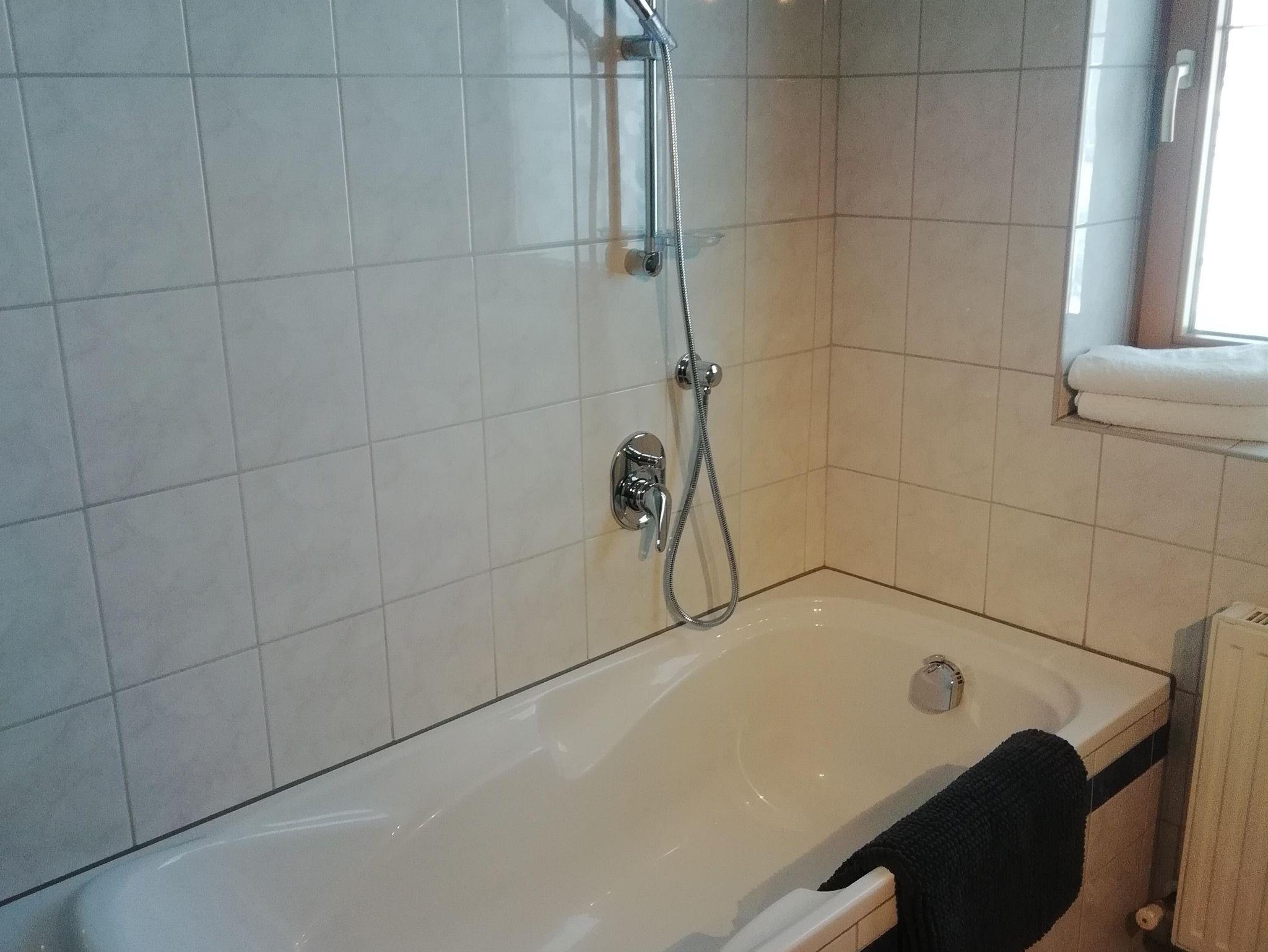 Anschließend befindet sich ein großes Wohnzimmer, Schlaf-und Badezimmer mit Badewanne.