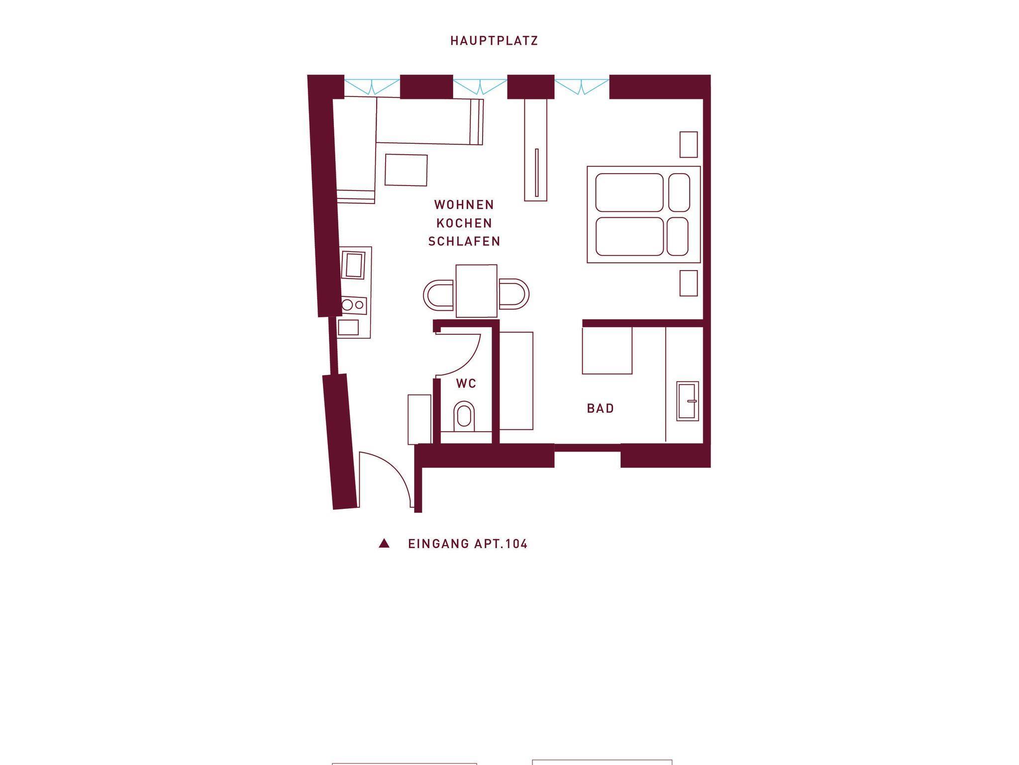 1 Wohn- und Schlafraum, Doppelbett, DU/WC, Schlafcouch, Küchenecke mit 2 Pl.-Kochfeld, Kühlschrank, Geschirrspüler, Espresso Maschine, Wasserkocher, Klimaanlage, TV, Bett- und Frotteewäsche, Wlan